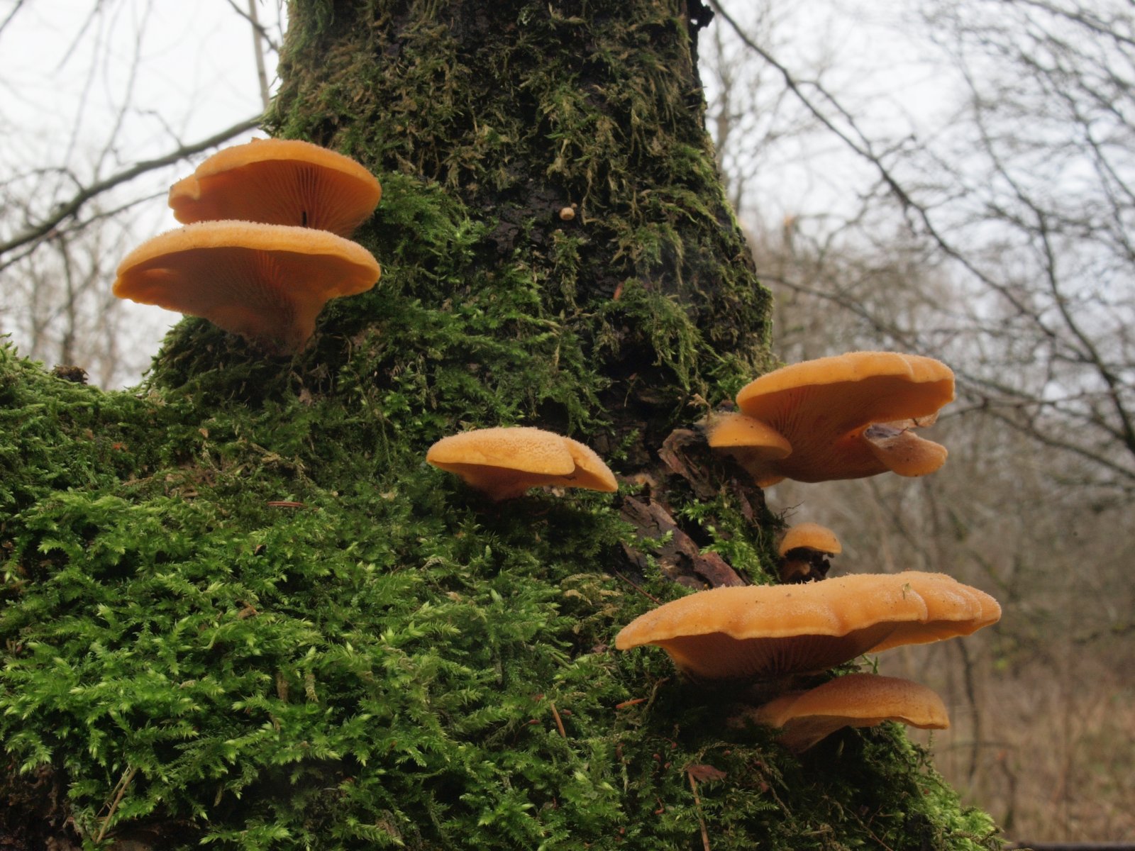 Zwar kein Stiel zu sehen aber es ist trotzdem der Gelbstielige Muschelseitling (Sarcomyxa serotina)