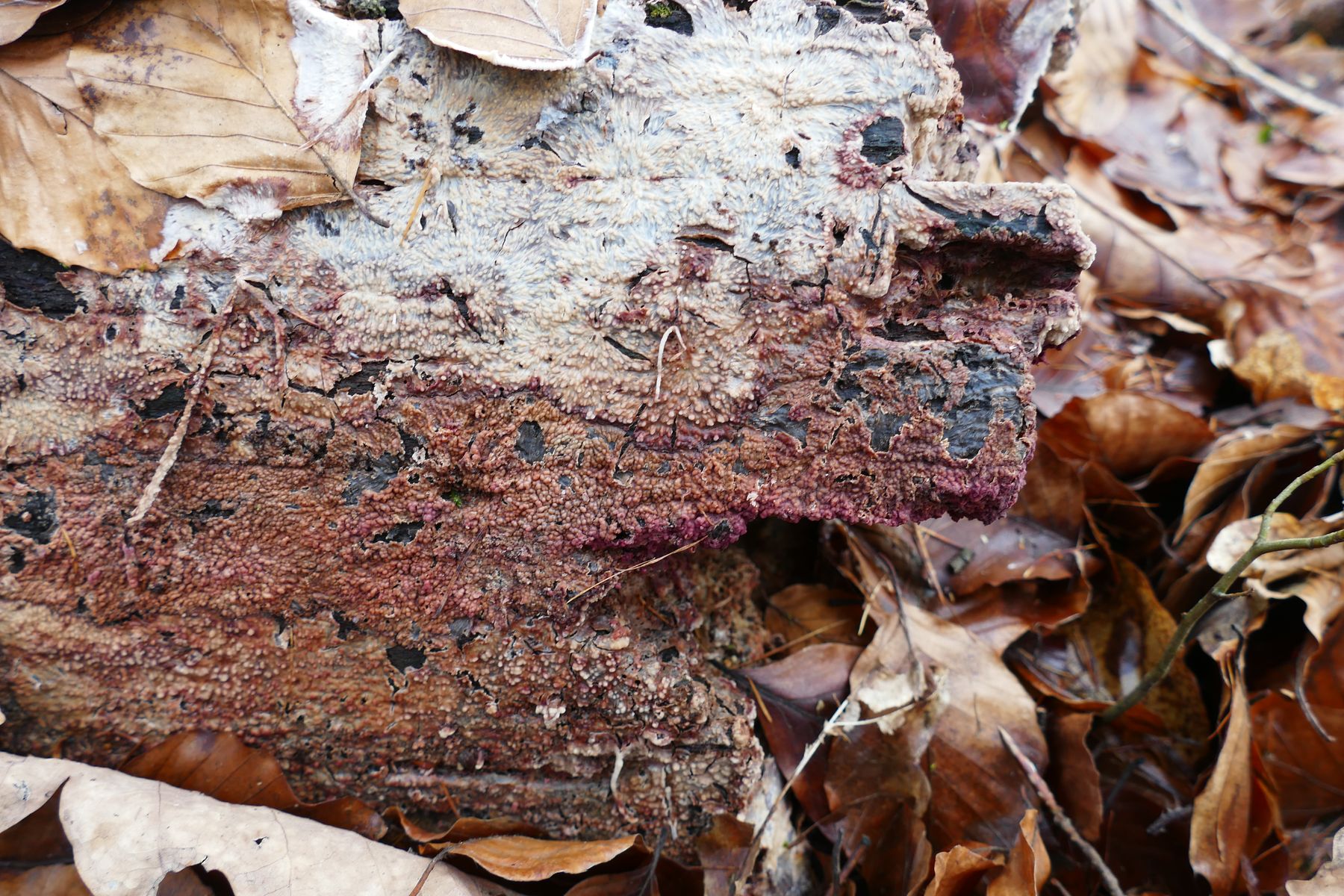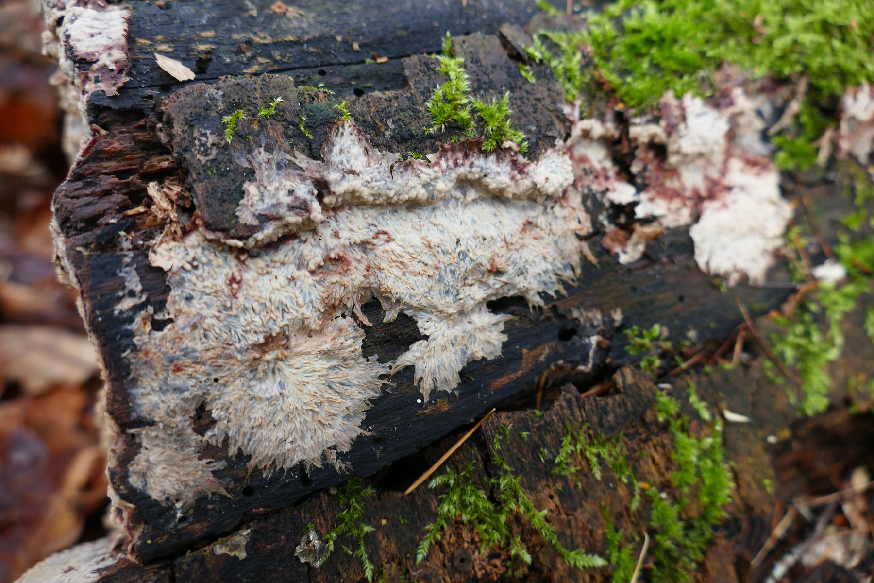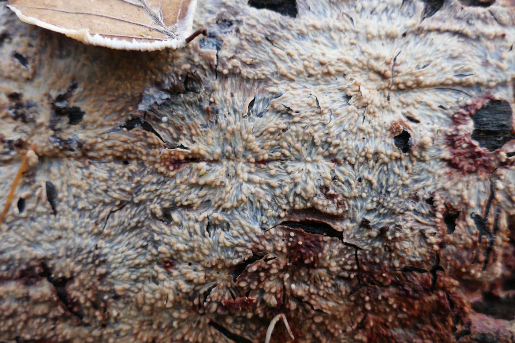 Beim Neujahrsspaziergang durch den Wald bin ich auf einen sehr interessanten, großflächigen Fruchtkörper mit hellem, warzigem Hymenophor an einem weißfaulen, liegenden Baumstamm gestoßen.