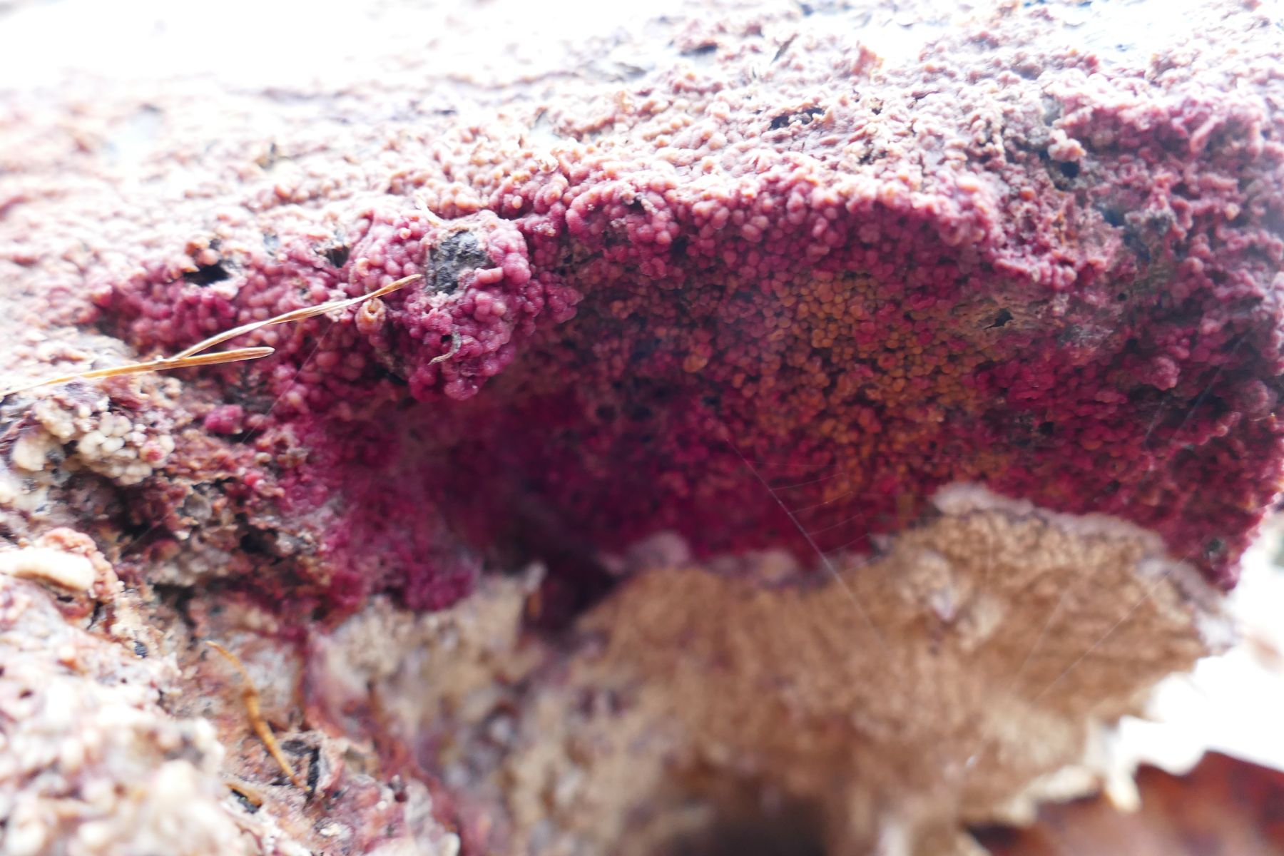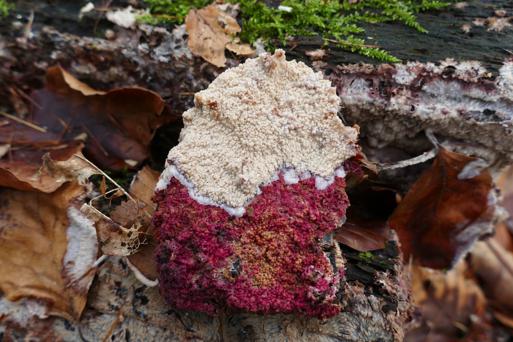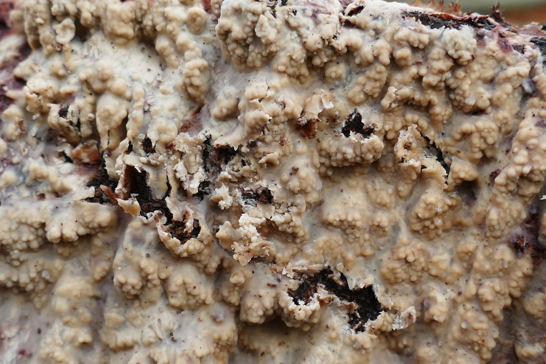 Beim Neujahrsspaziergang durch den Wald bin ich auf einen sehr interessanten, großflächigen Fruchtkörper mit hellem, warzigem Hymenophor an einem weißfaulen, liegenden Baumstamm gestoßen.