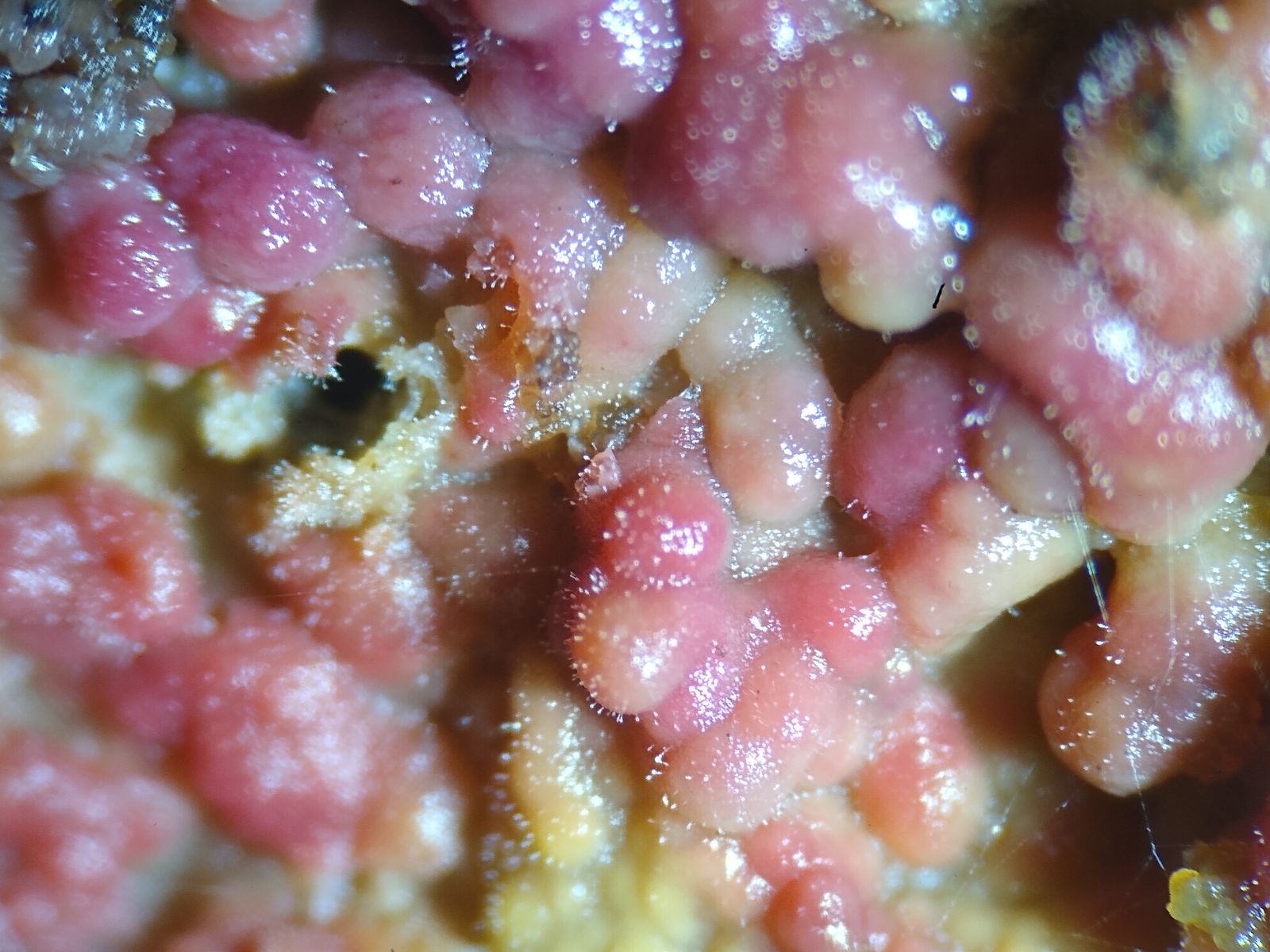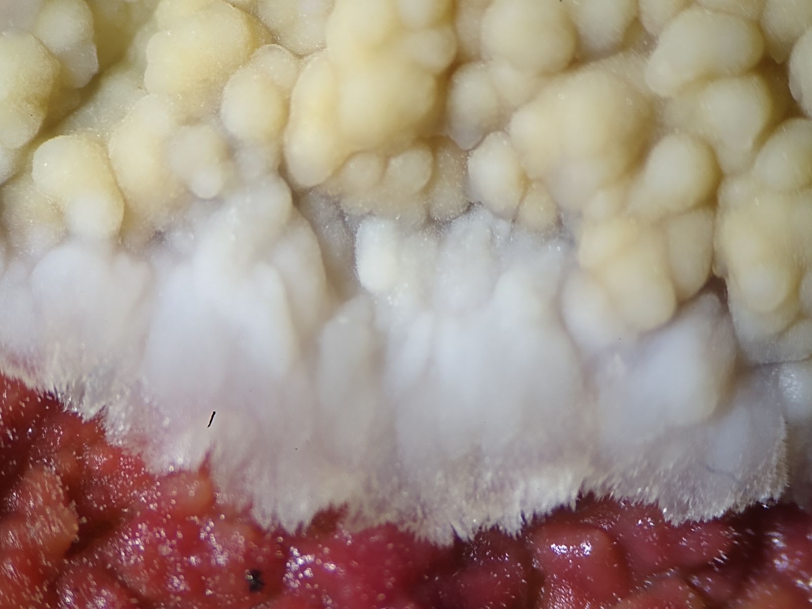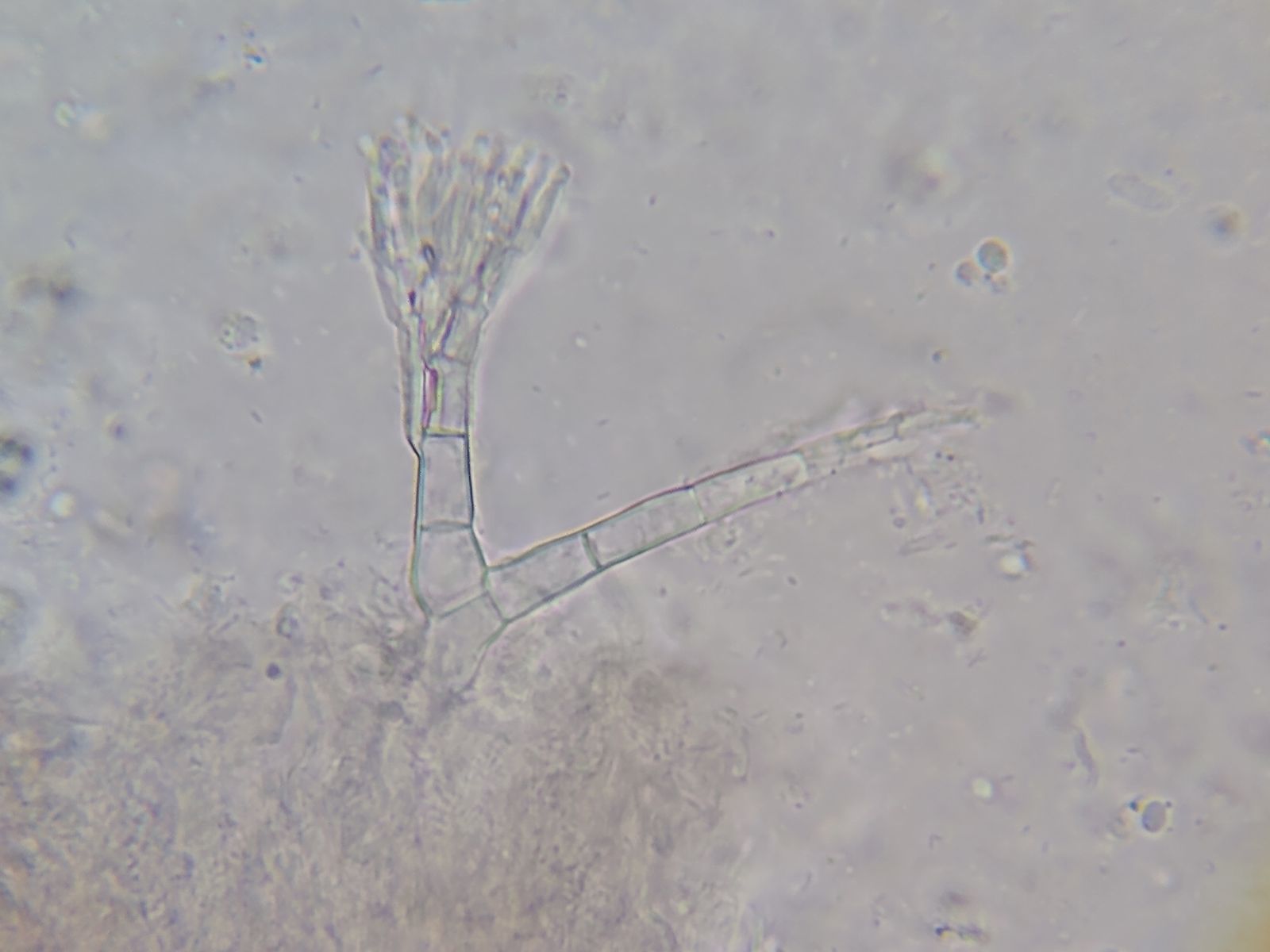 Die rot verfärbten Bereiche sind wahrschienlich befallen, große Konidienträger ragen aus der Oberfläche.
