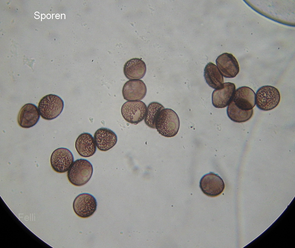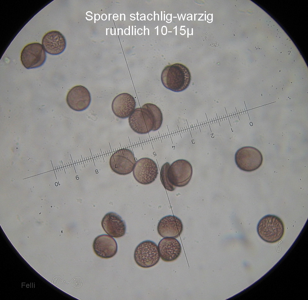 Du schreibst auch : Sporen oft verklumpt. Die Sporen sind stark warzig mit hellerer Seite (dort hingen die Sporen im Klumpen zusammen)