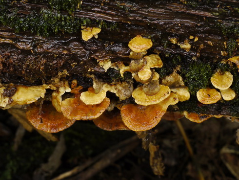 Jedenfalls fällt mir hier auch nichts besseres ein. Klein geratene (und etwas ungewöhnlich gefärbte) Fruchtkörper einer Schmetterlingstramete sind hier immerhin naheliegend. ![]()