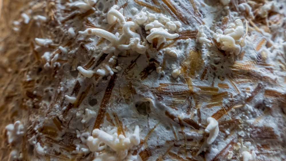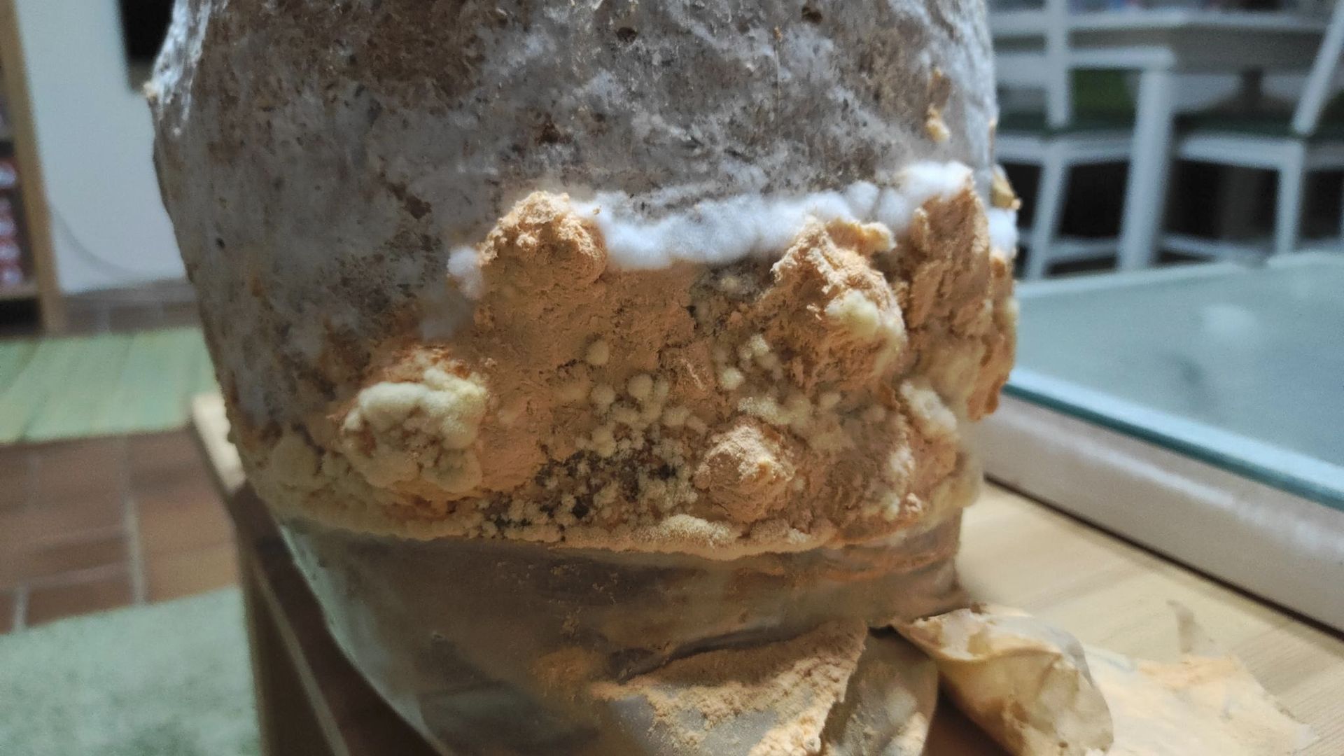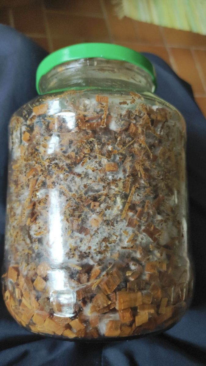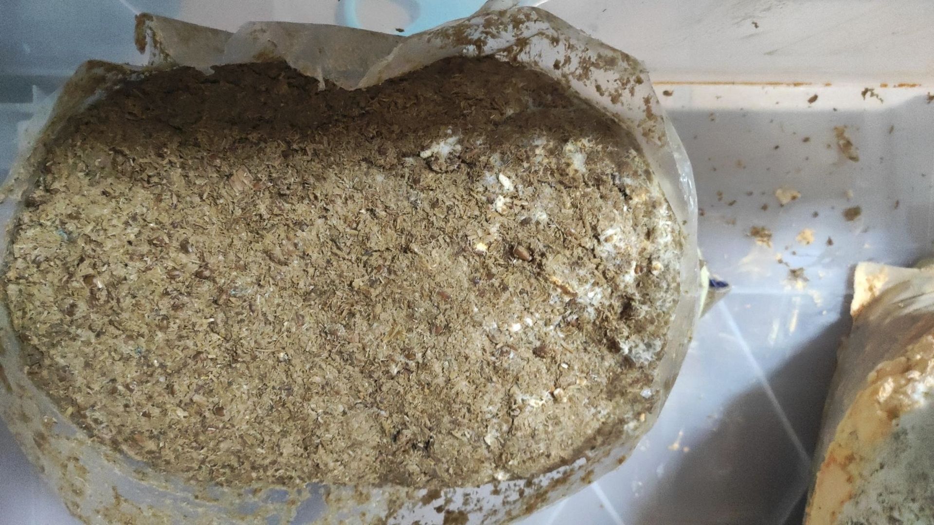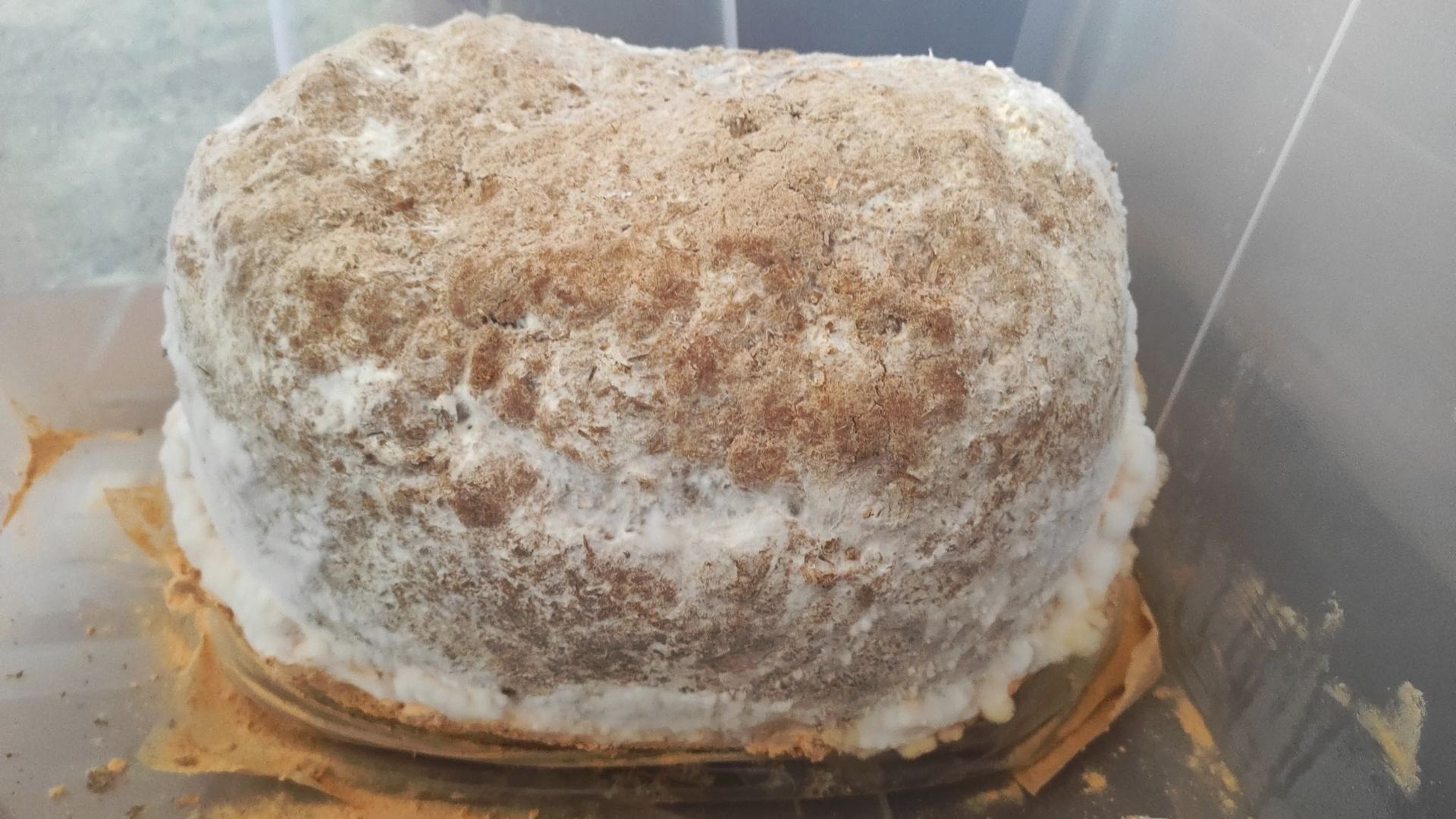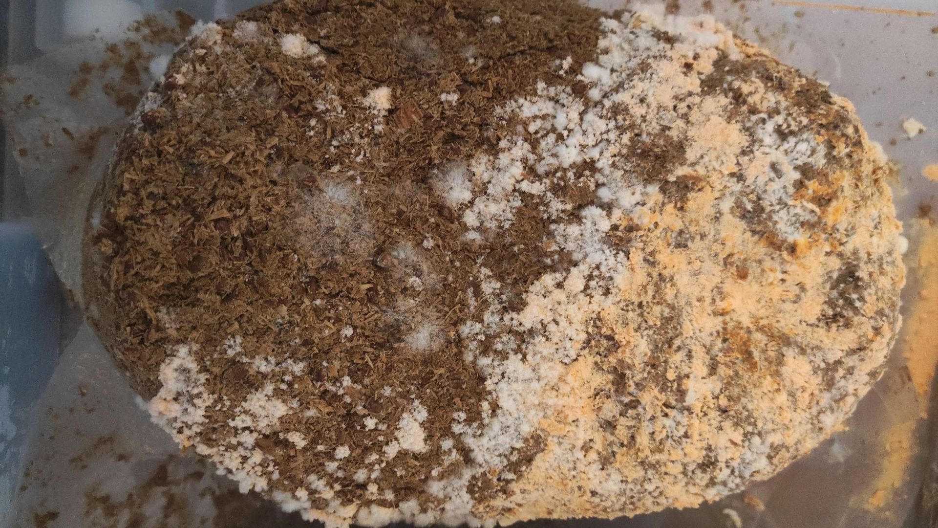 Im nächsten Schritt verteilte ich die Körnerbrut in Stroh und einer Mischung auf aufgelösten Strohpellets und Buchenholzhobelspänen. Im reinen Stroh konnte ich eine saubere Durchwachsung mit Austernseitlingsmyzel erreichen und warte auf die beginnende Fruchtung. Im Pellet-/Buchenholzgemisch sah es auch erst sehr gut aus, aber dann gab es nach dem Entfernen der Plastiktüte und dem Umsetzen in die große Kulturbox eine merkwürdige Entwicklung, die ich in Fotos festgehalten habe. Zunächst bildete sich ringförmig im unteren Teil um den Klotz helles und leicht gelbliches Mycel aus, das innerhalb weniger Stunden plötzlich stark orange ausblühte und bei Berührung als trockenes oranges Pulver herabrieselte. Ich habe einen Teil des Pulver als Proben aus der Box entnommen und den Rest vom Boxboden entfernt. Ein ganz vorsichtiger Geschmackstest des Pulvers mit der Zungenspitze, entsprach dem, was ich dem Schleifstaub bei der Holzbearbeitung zuordne. Etwas milder als Buchenholzstaub, der sich bei mir an der Schleifmaschine sammelt.