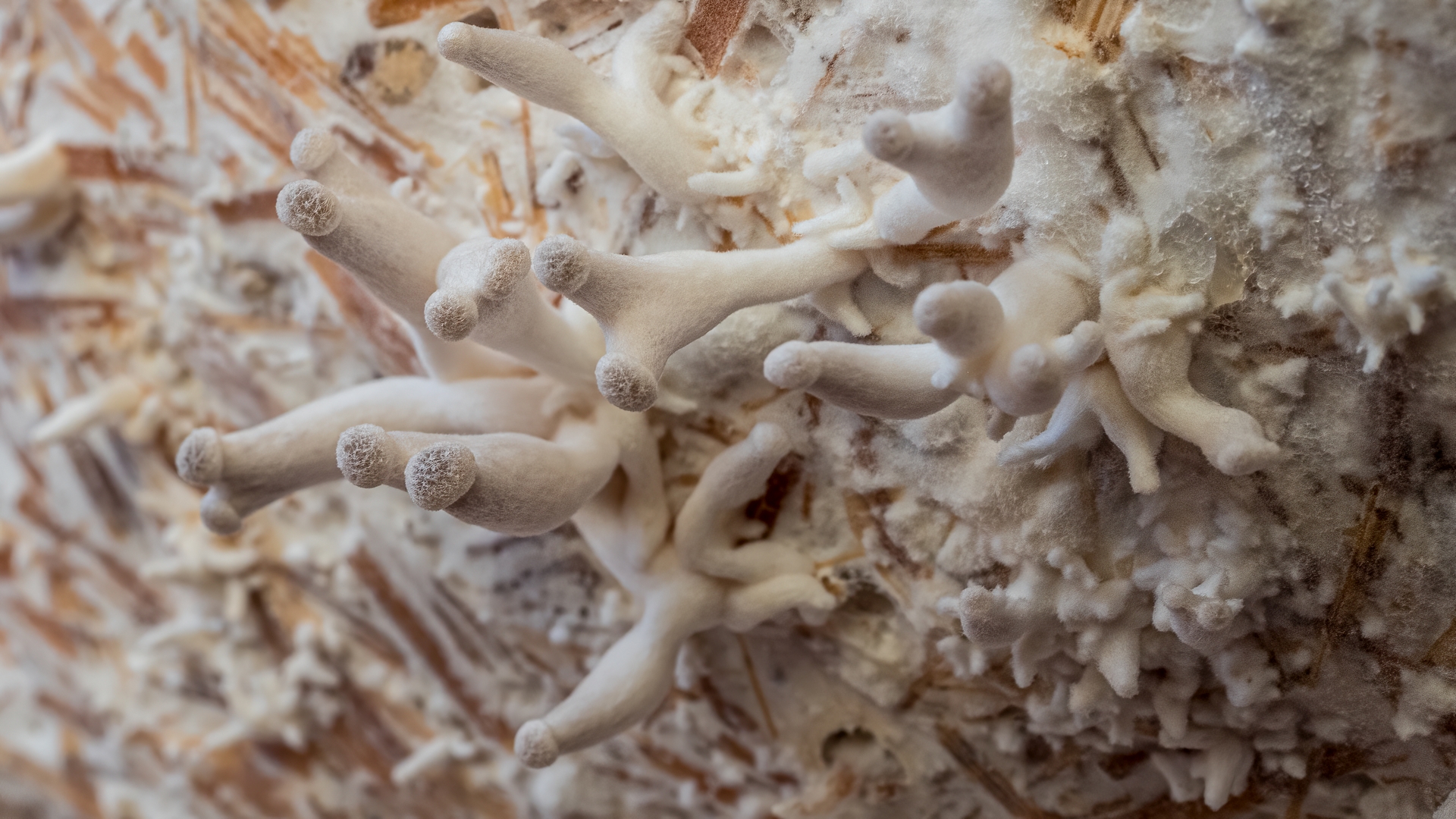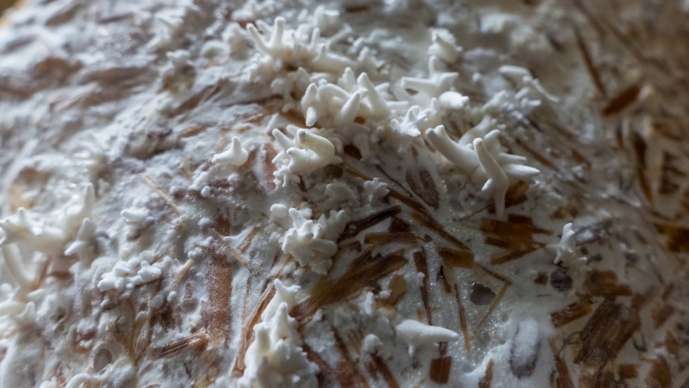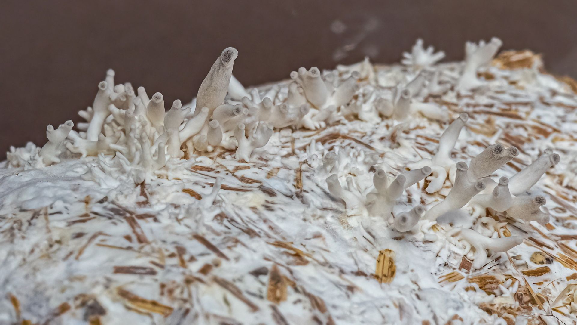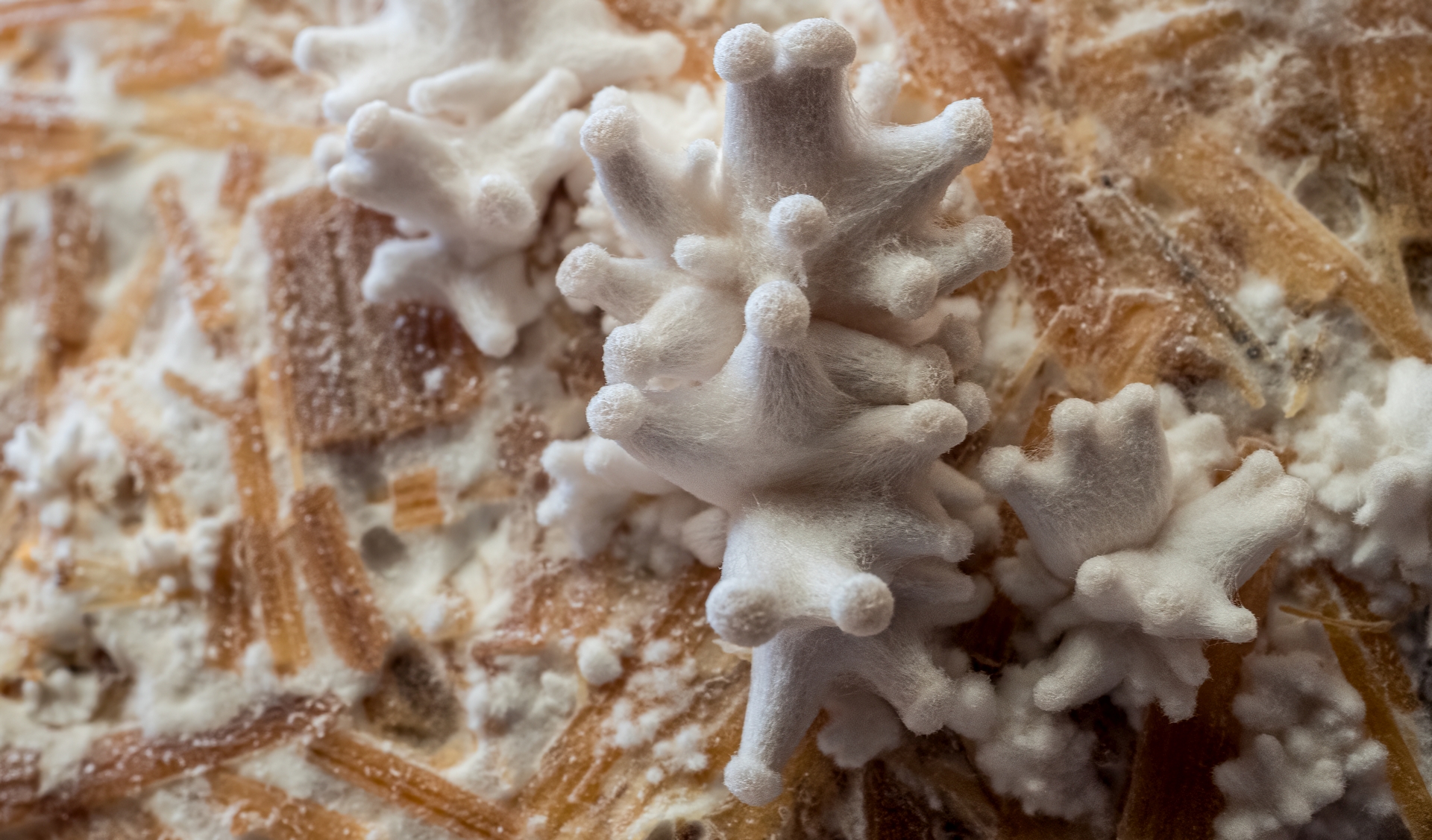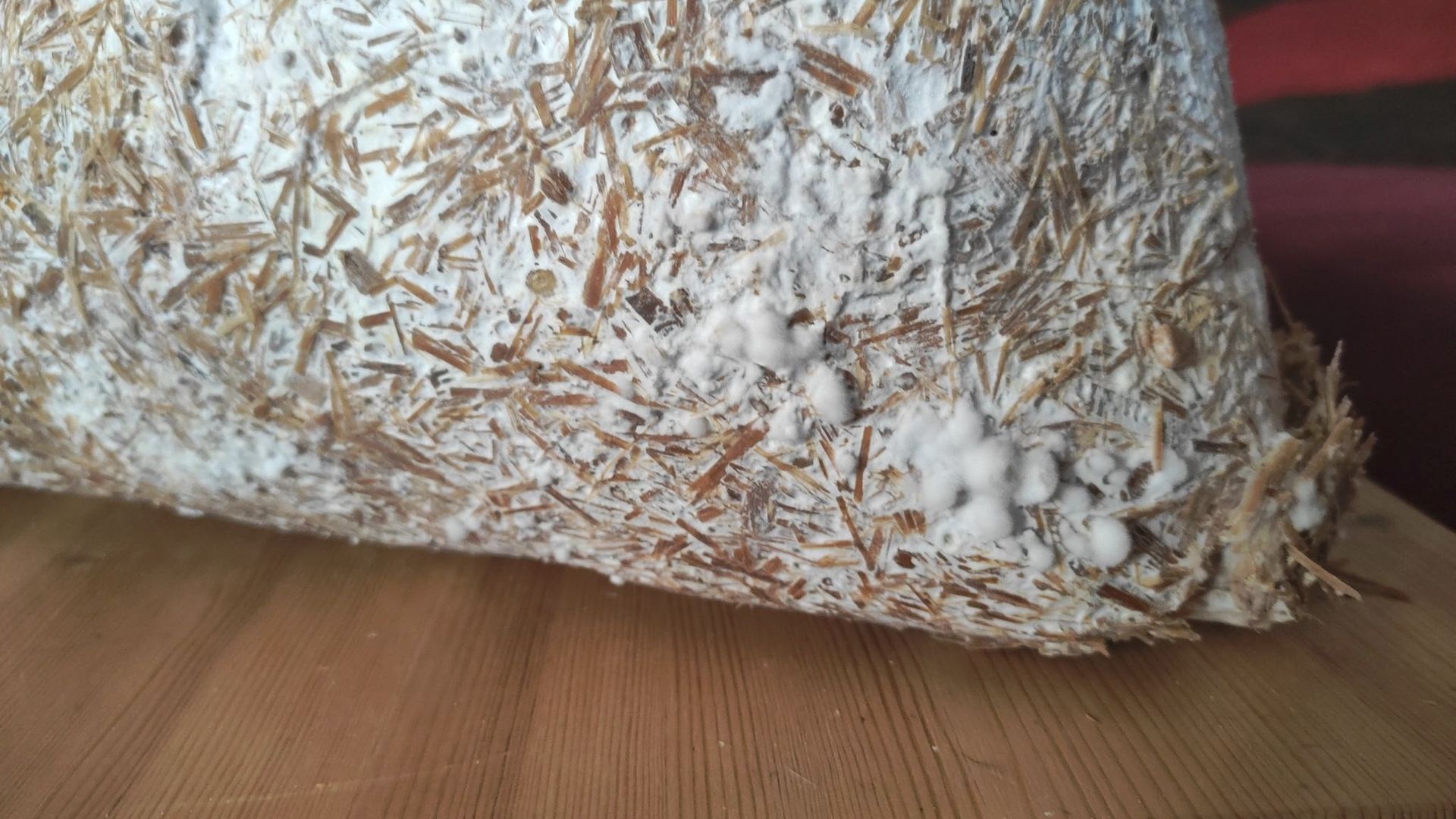Ich bin nun ein Stück weiter. Nach dem ich die verkeimten Blöcke in den Garten verbracht habe, geht der Neurosporenbefall dort stark zurück. Interessanter Weise wurde der reine Strohblock nicht befallen, obwohl dort etwas vom abfallenden orangen Pulver drauf gerieselt war und er mit den beiden anderen Blöcken in einer großen Kiste war. Er steht jetzt alleine in einer kleineren desinfizierten Box bei 14°C und 90% Luftfeuchtigkeit. Heute sah ich neue Entwicklungen und dachte erst an einen weiteren Fremdpilz und holte die Kamera mit Makroobjektiv. Nach Betrachten der Bilder hoffe ich auf winzige Fruchtkörper des Austernpilzes. In ein paar Tagen werde ich es wohl wissen. Auch eine Zugabe einer Stroh-/Kaffeesatz/Buchholzspanmischung auf im Schnellkochtopf sterilisiertes Buchenholz zeigt nach 2 Tagen ein sich ausbreitendes Myzel. In der Anwachsphase von Flüssigmyzel hatte ich bislang weder mit Getreide (Roggen und Weizen) Probleme, sondern erst nach dem Einbingen ins Kultursubstrat.