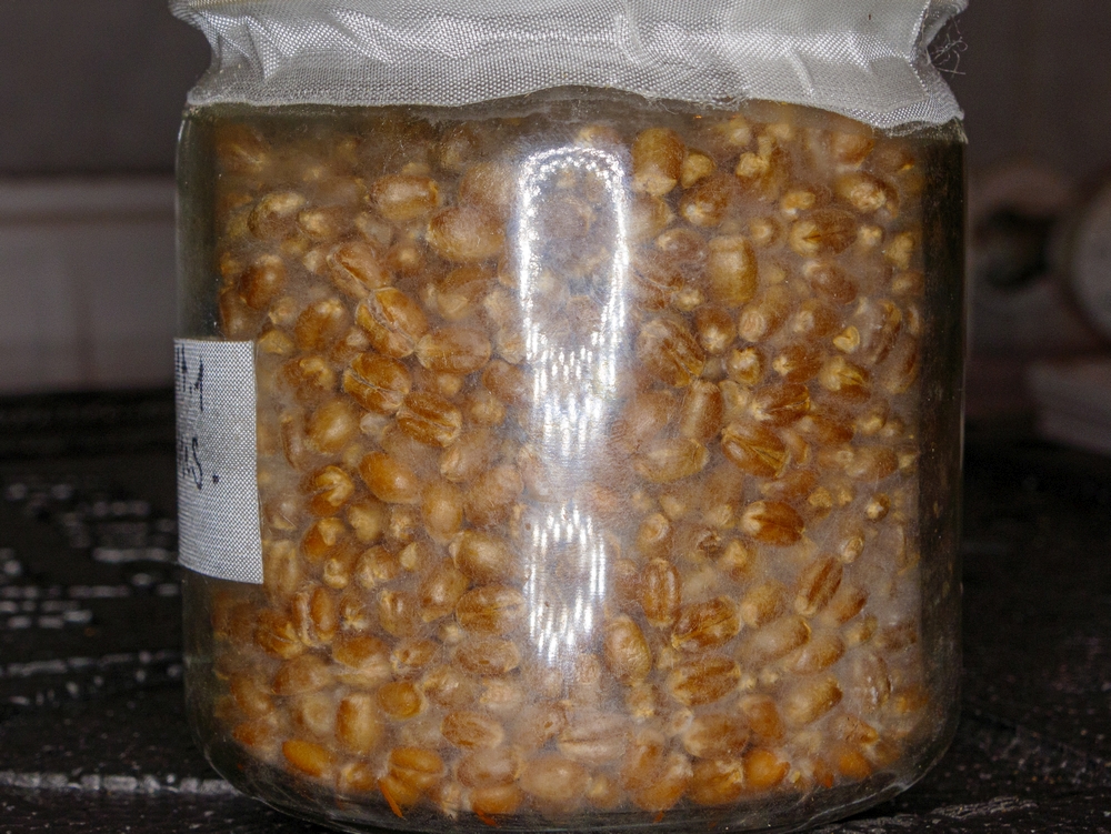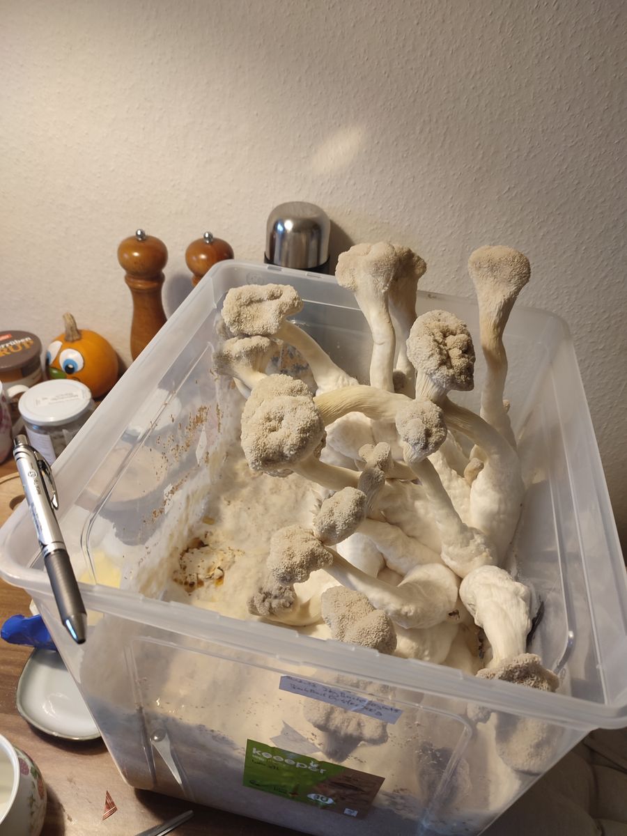 Heute Morgen bin ich mir nach vorangehendem Wachstum und einem neuem Foto ziemlich sicher, dass es sich nicht um Austernseitlinge handelt, was da wächst, sondern um den Block mit den Kräuterseitlingen. Duch das Entsorgen von Beuteln mit Blöcken, die vom Bäckerschimmel befallen waren, gingen auch die Beschriftungen verloren. Insofern bin ich um dieses Wachtum heilfoh, da ich von Austernseitling und wilden Austernseitling noch Kulturen in der frühen Entwicklung habe und weitermachen kann. Habe auch eine 12 cm Petrischale mit Deckel aus Glas besorgt, um mich noch einmal dem Judasohr widmen zu können.