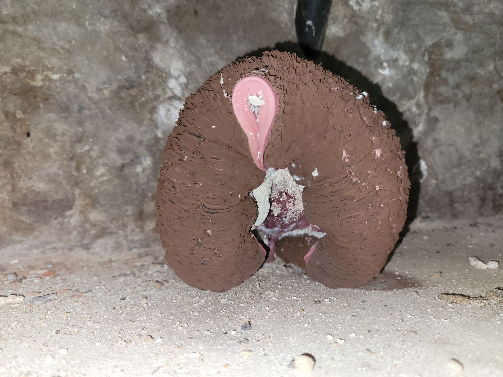 Hast Du das Gebilde vielleicht entnommen und draußen mal durchgeschnitten? Auf dem Foto, das Du nachgereicht hast finde ich schon, dass das wie ein vergammelter Pilz-Fruchtkörper aussieht. Quasi der Stiel und dann der Hut so nach oben gerollt, dass man nur noch Lamellen sieht.