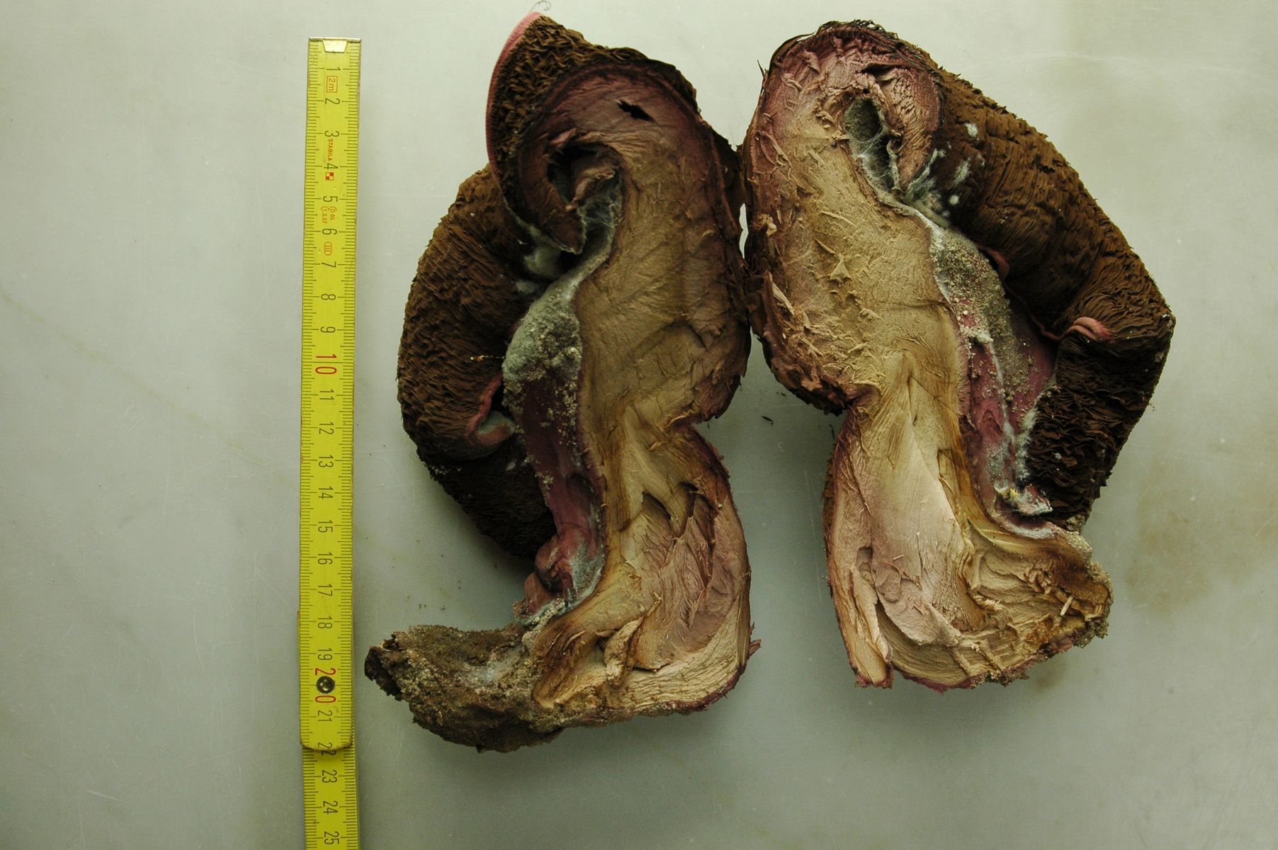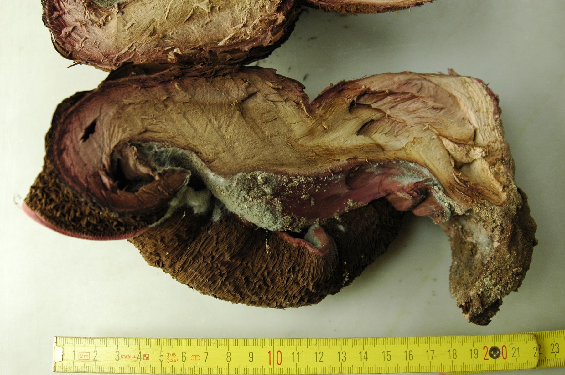 Also ich sehe hier ganz im Ernst einen Rotfuss, dessen hymenium sich so weit nach oben gekrempelt hat, dass es die (rote) Huthaut quasi verschluckt hat. Das ganze Ding ist dann ganz komisch eingetrocknet wie es nur in einem Keller möglich ist.