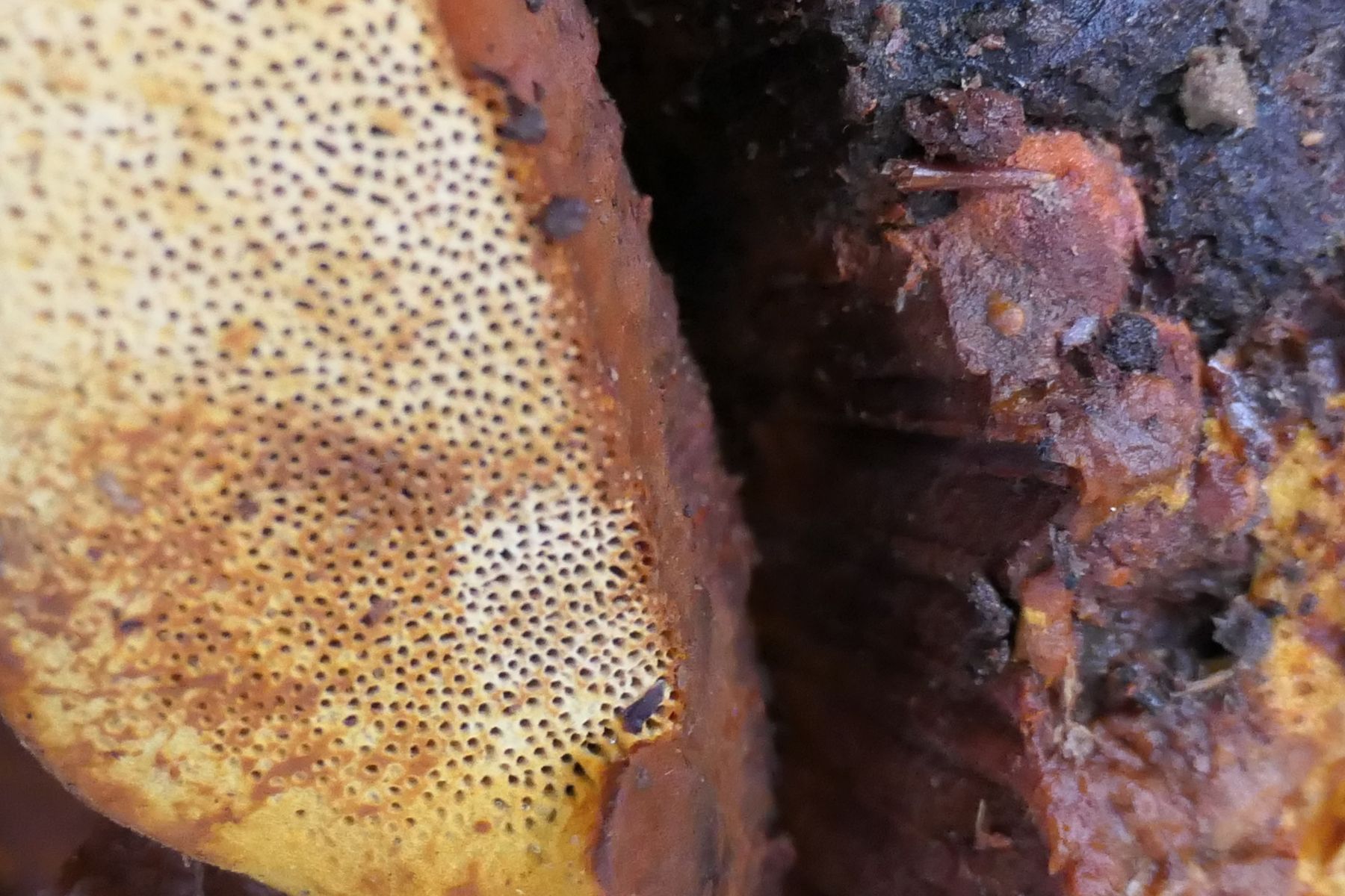 06.01.2023 an verrottetem Baumstrunk (Laub-Nadelholz?), mit starkem Geruch nach..