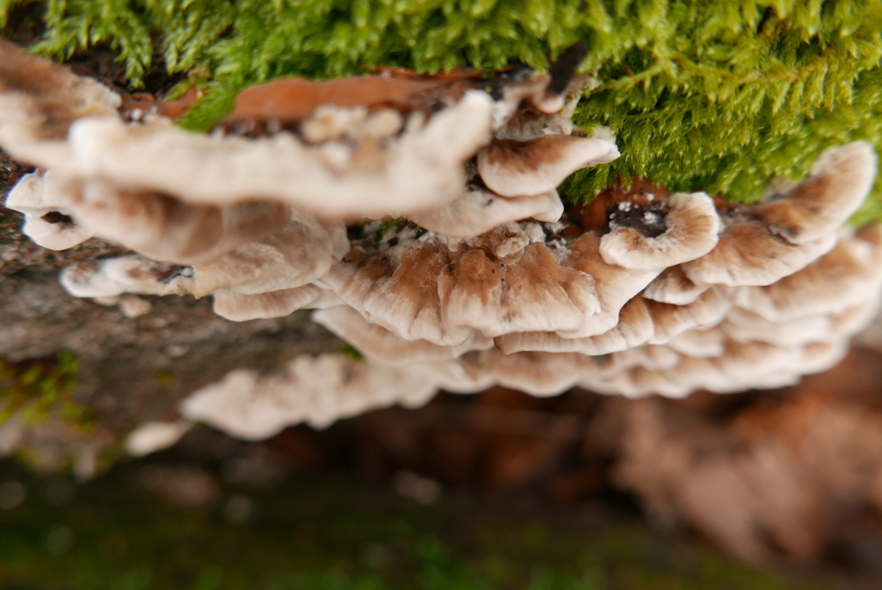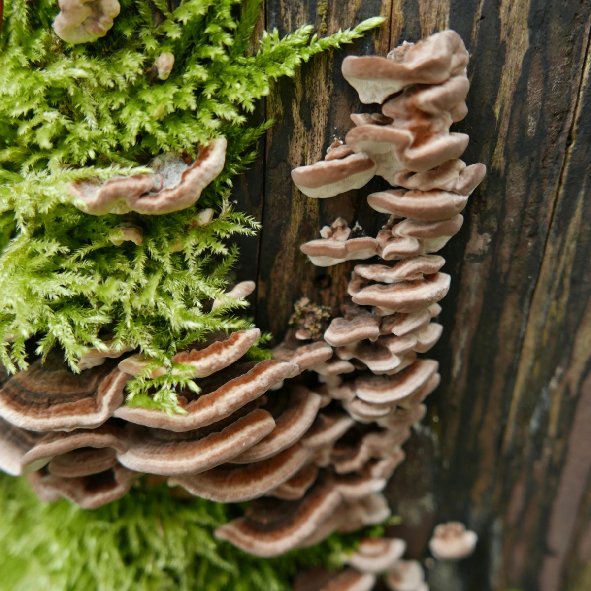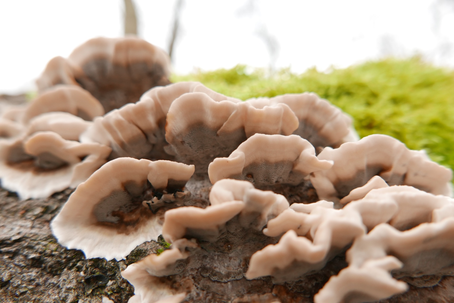 Frische Fruchtkörper sprießen am feuchten Totholz. Nun ist es doch gar nicht mehr tot, finde ich