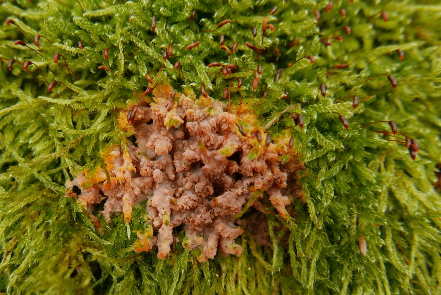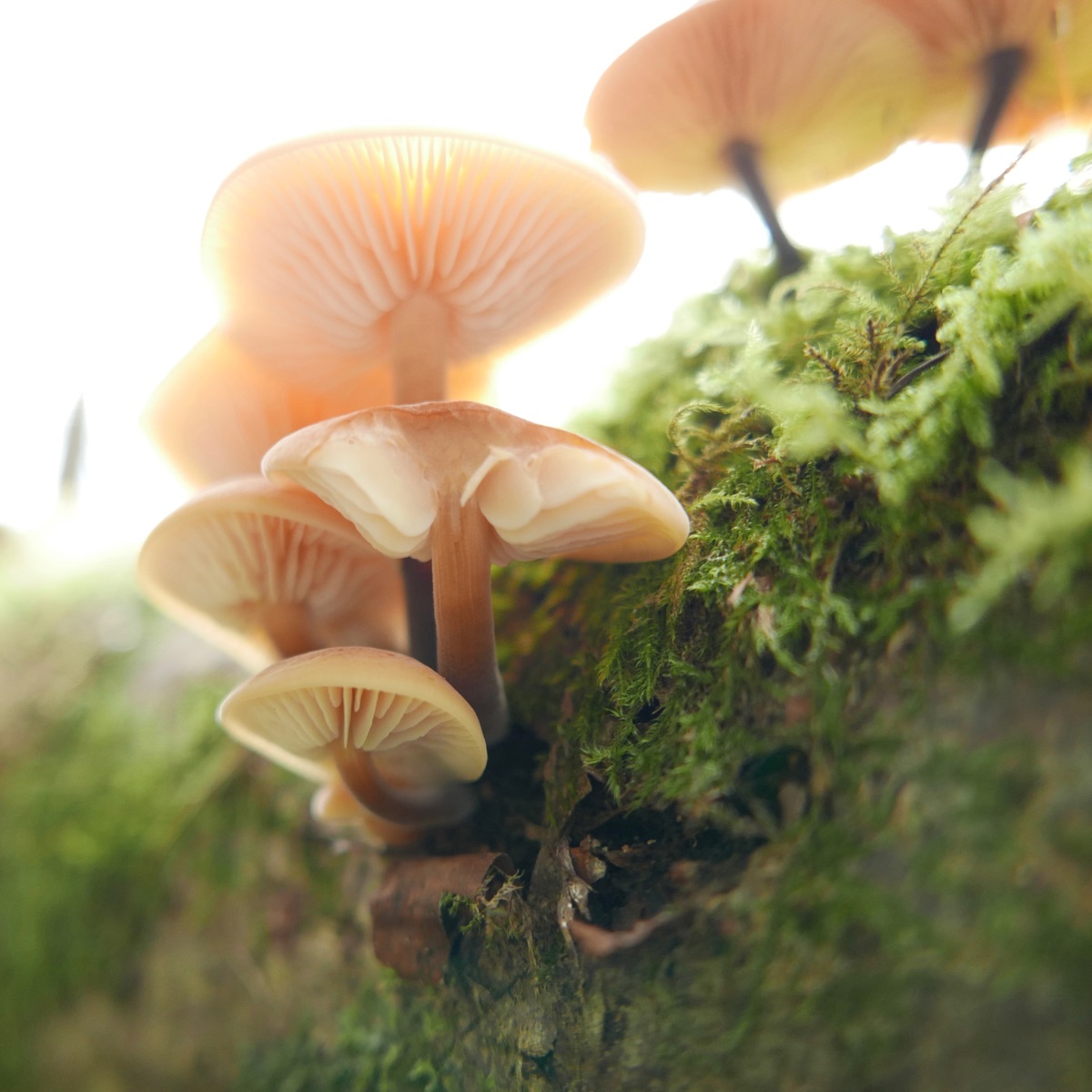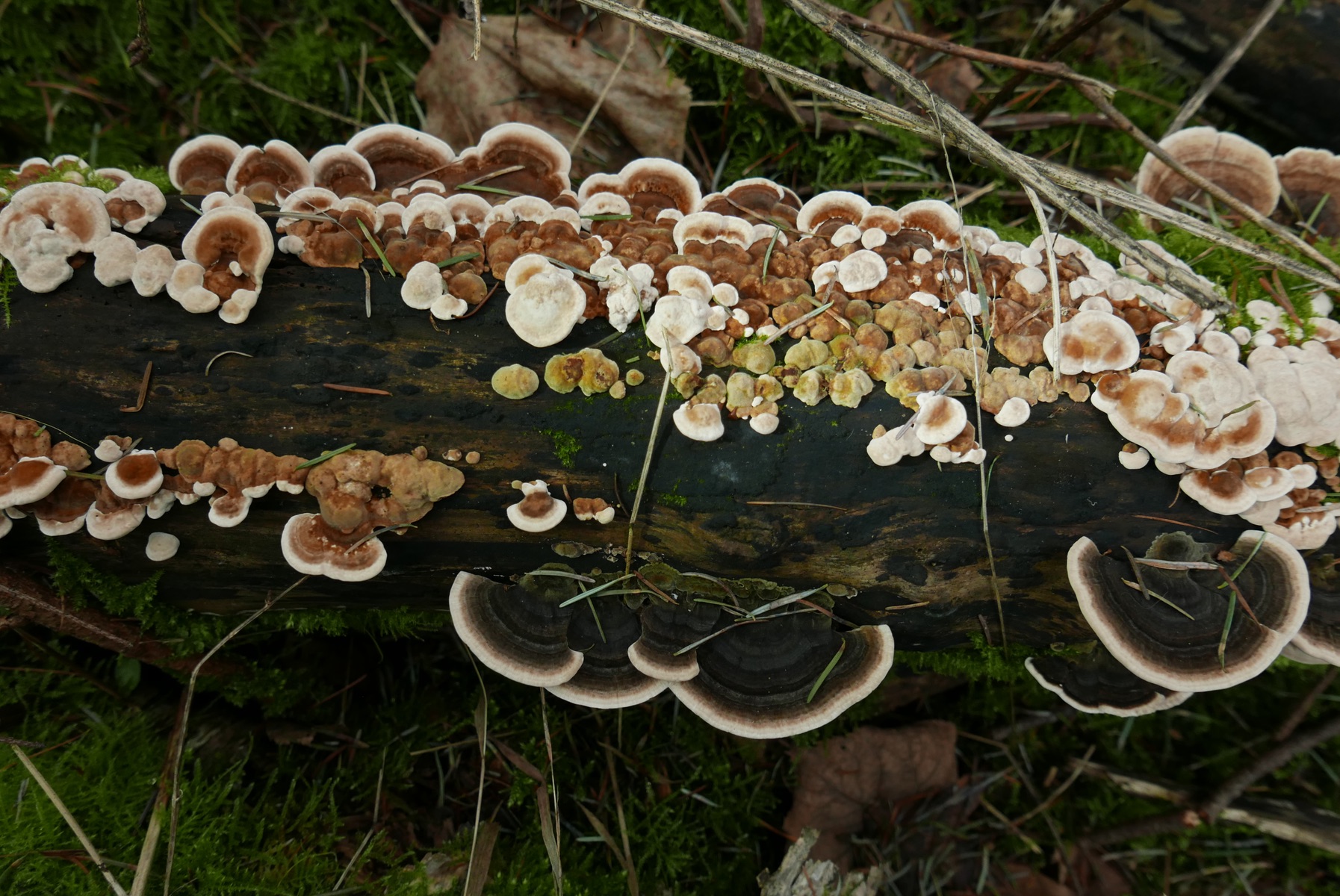 Frische Fruchtkörper sprießen am feuchten Totholz. Nun ist es doch gar nicht mehr tot, finde ich