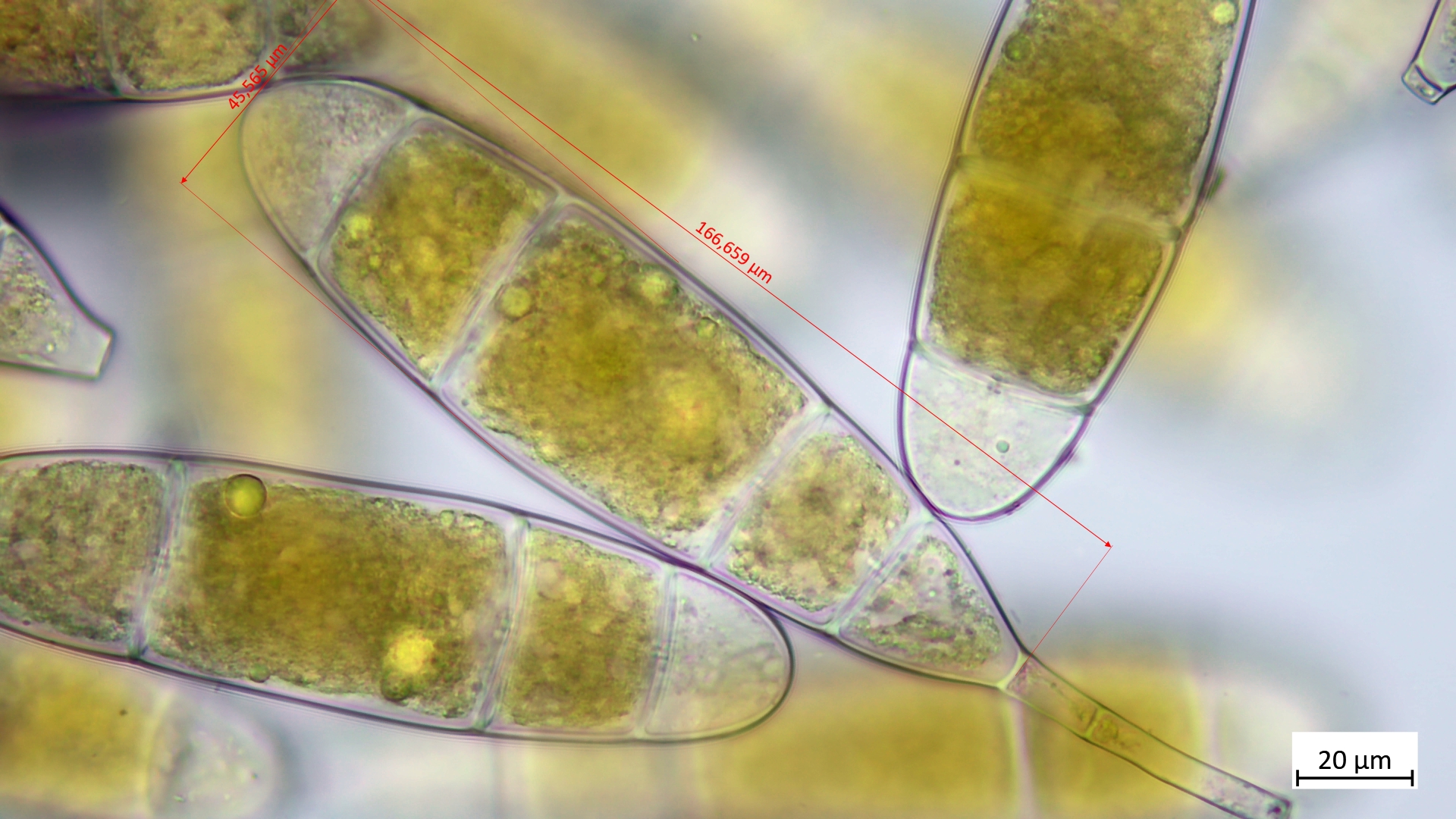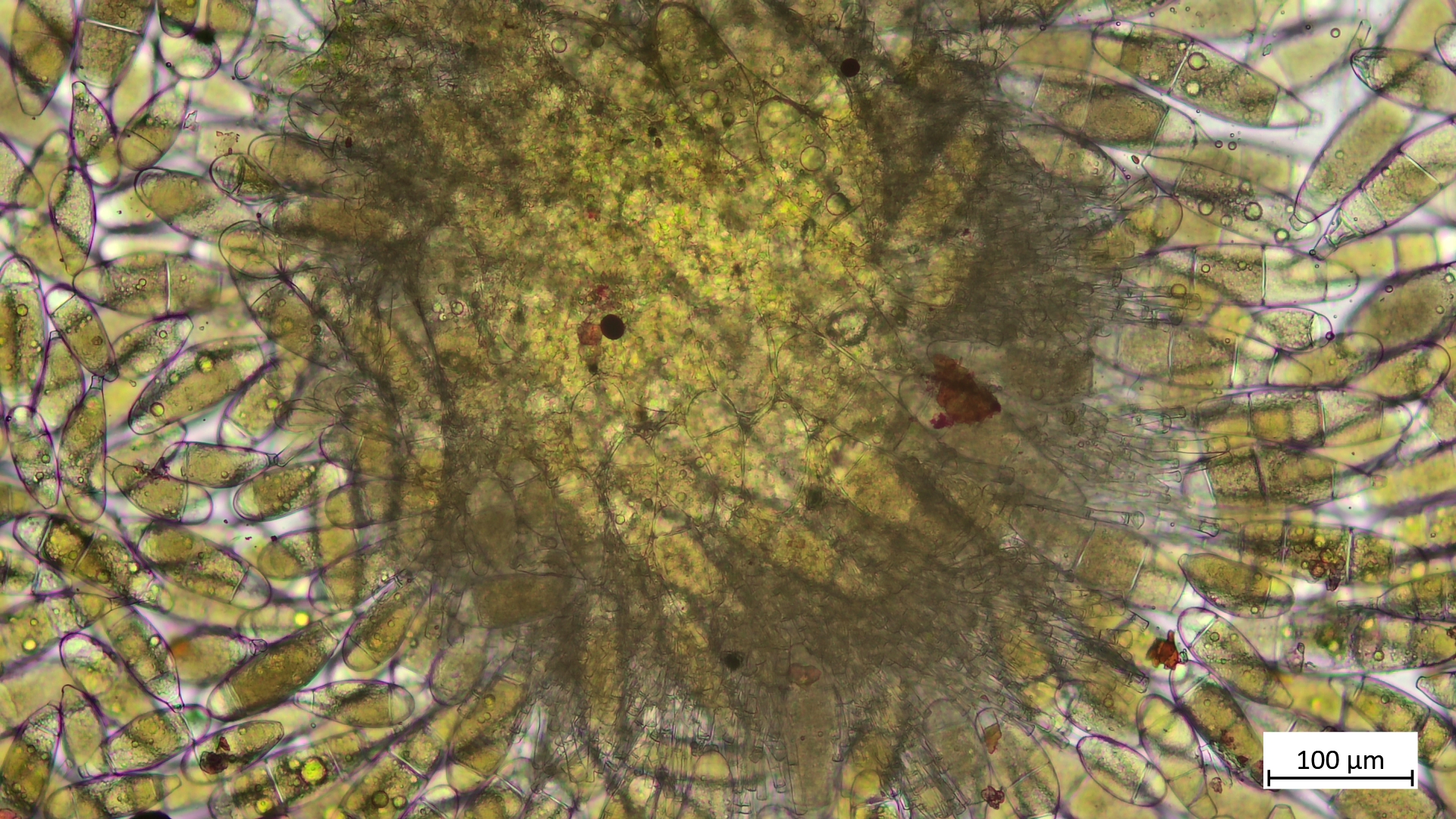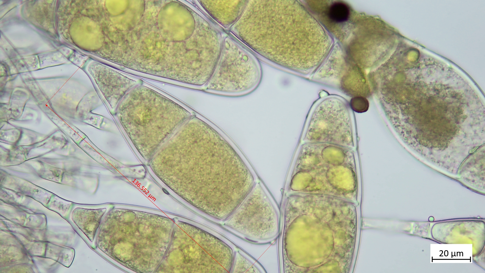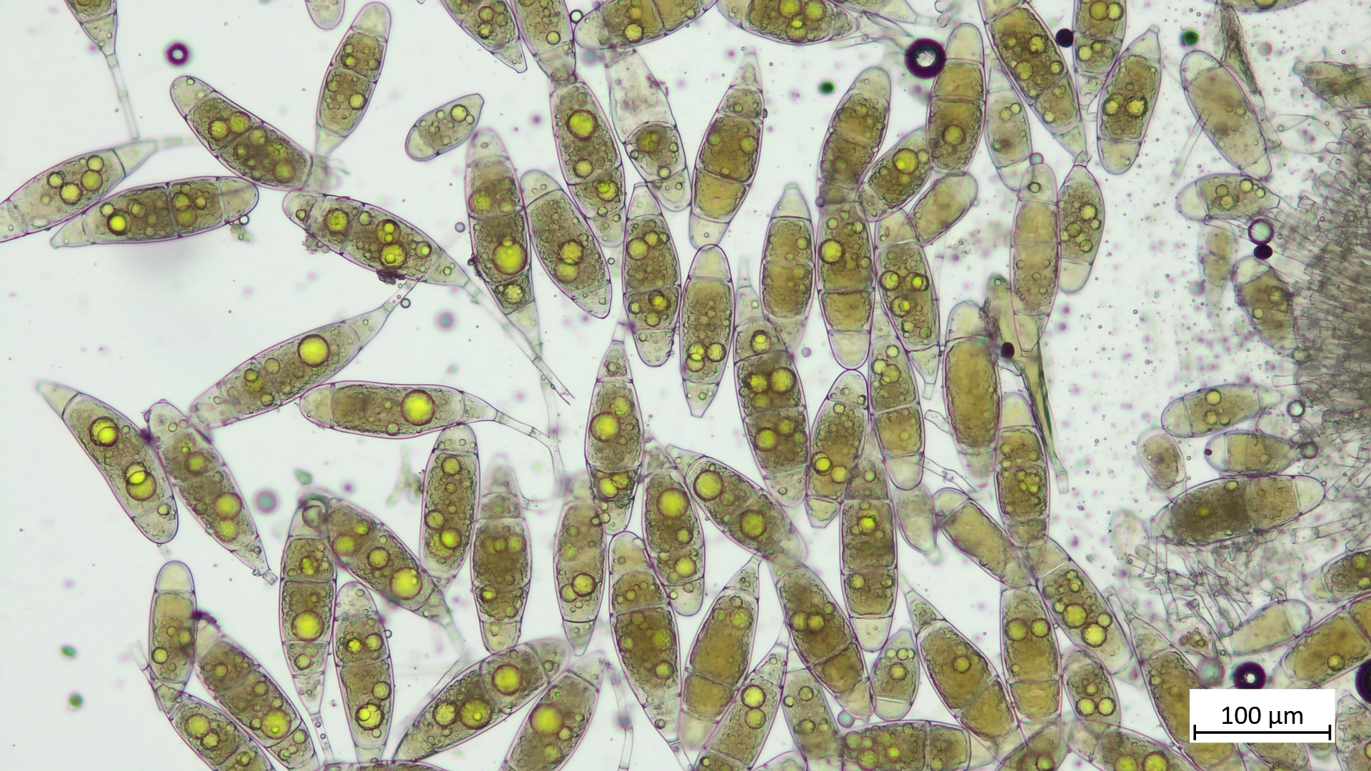 Mit riesigen, septierten Sporen (166µm), welche große gelbe Öltropfen beinhalten: