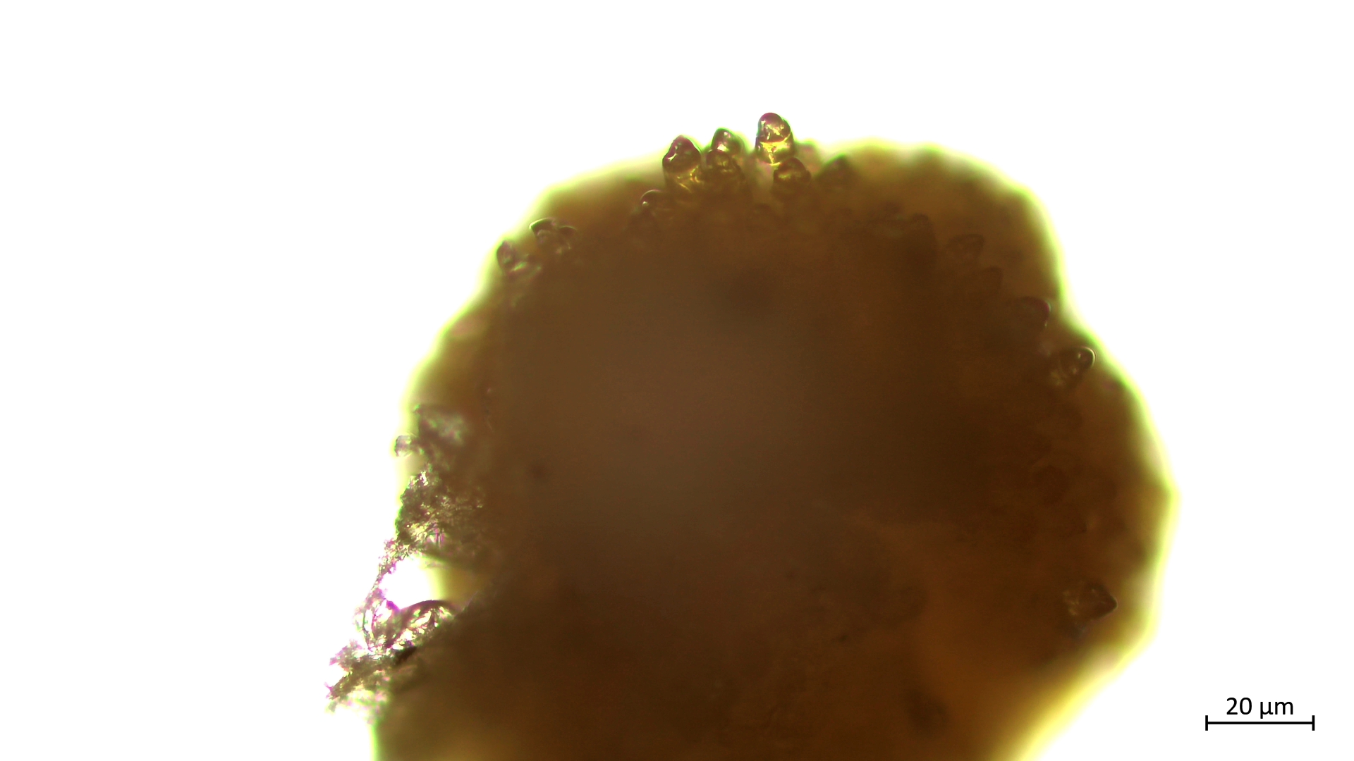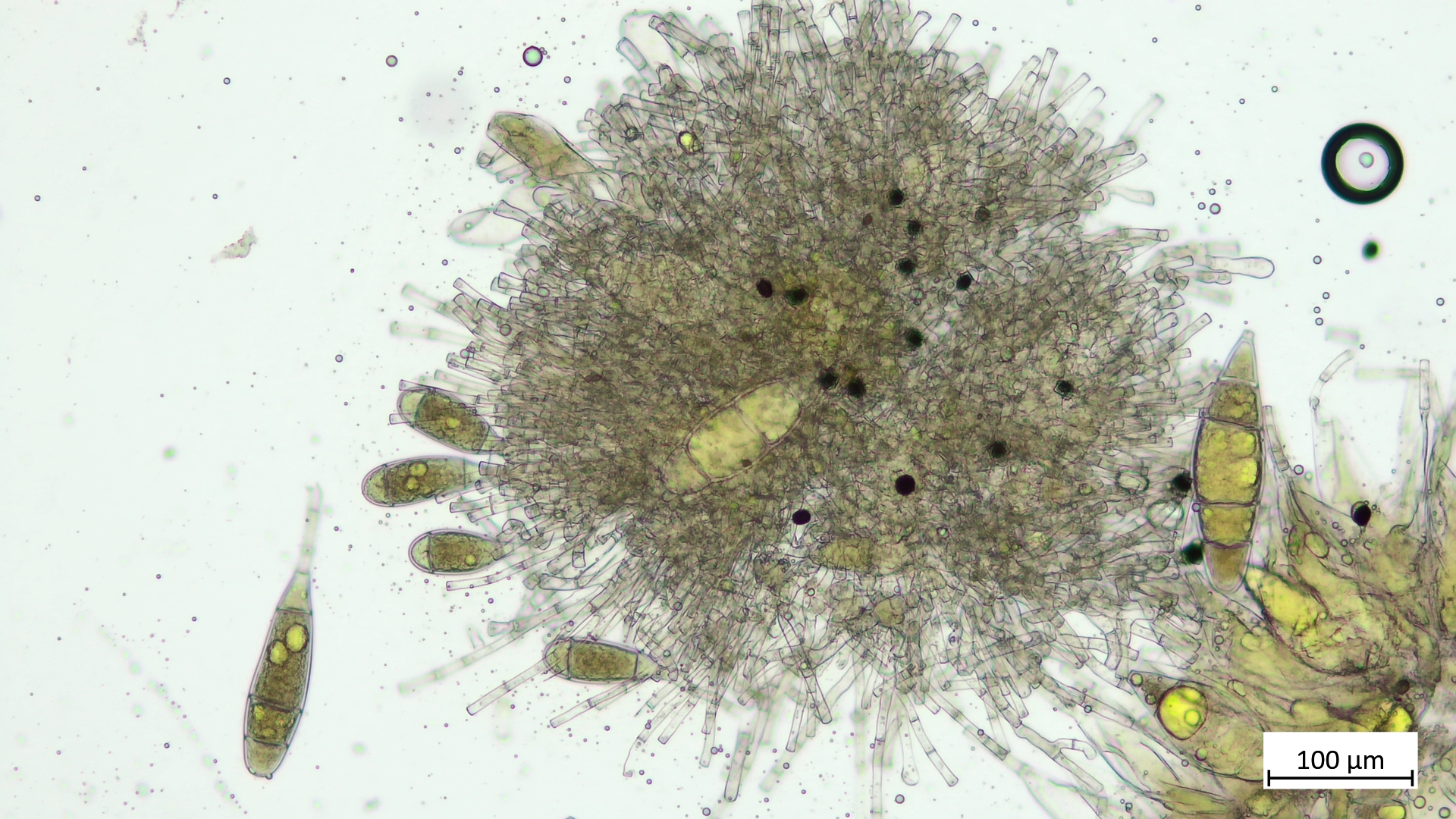Der kurze Stiel ist nicht leicht darstellbar. Ein Trockenpräparat lässt aber die Anordnung der Sporen ebenfalls erahnen (Cave: Mikrometerangabe im folgenden Bild falsch, nicht umgestellt, eher 100 statt 20µm):