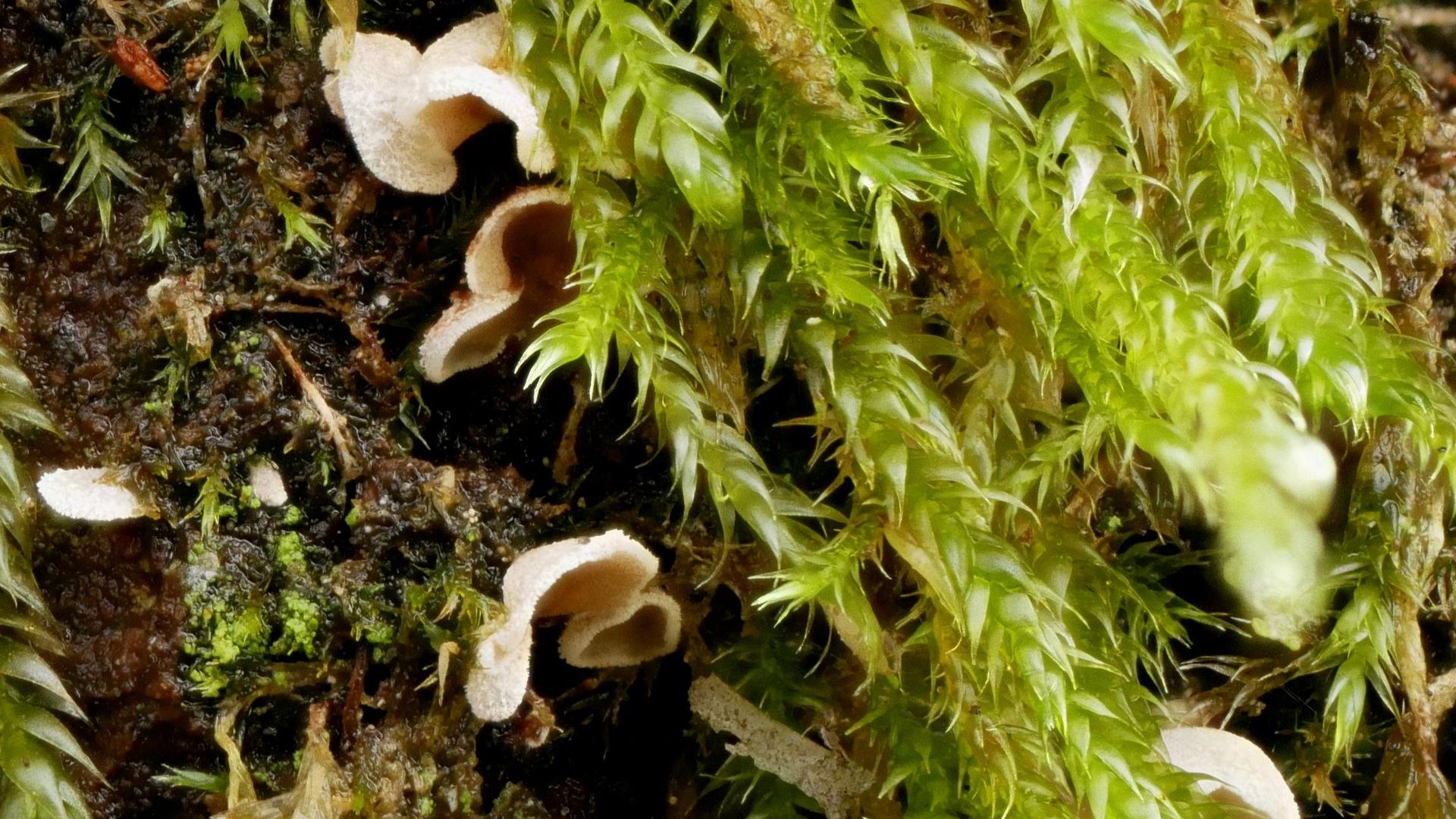Der Cyphelloide könnte Chromocyphella muscicola sein und im hellen Drüsling würde ich eher Myxarium nucleatum vermuten.