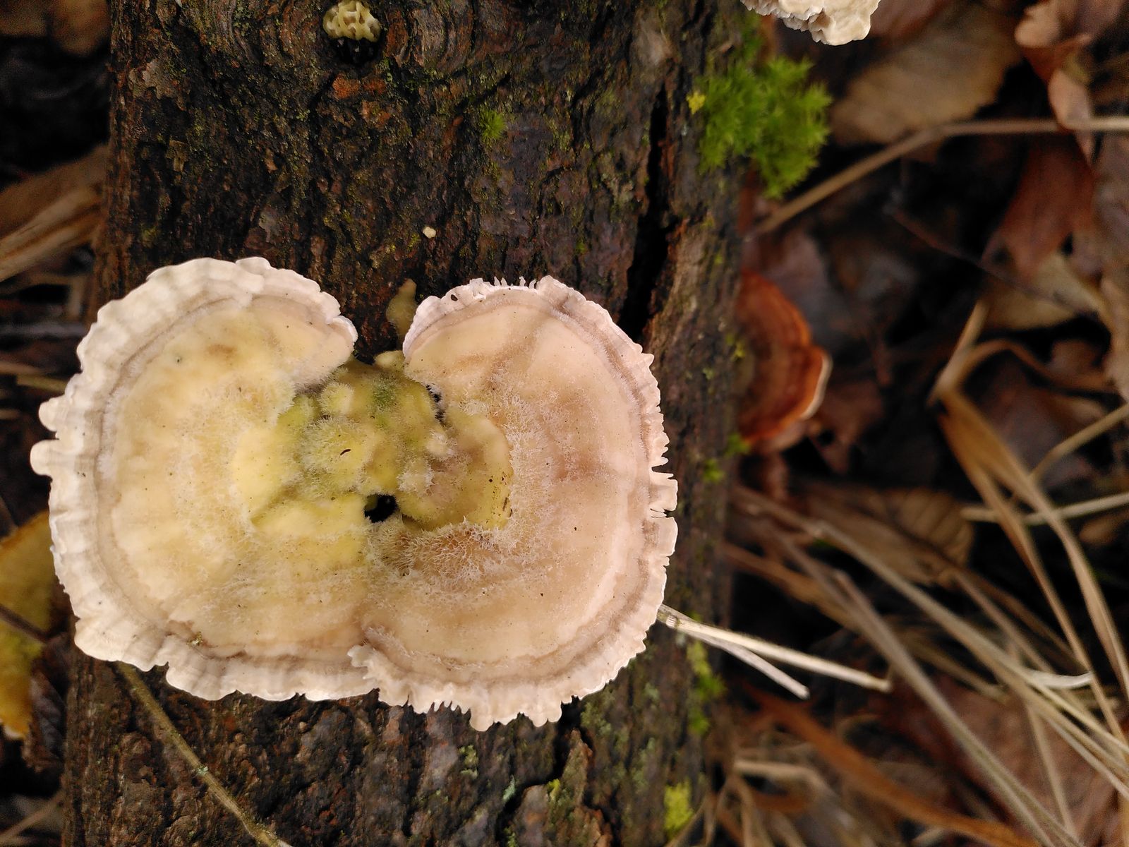 bei diesem Pilz war ich mir beim Blick von oben schon fast sicher, eine Striegelige Tramete (Trametes hirsuta) vor mir zu haben, denn die ist bei mir Massenpilz: