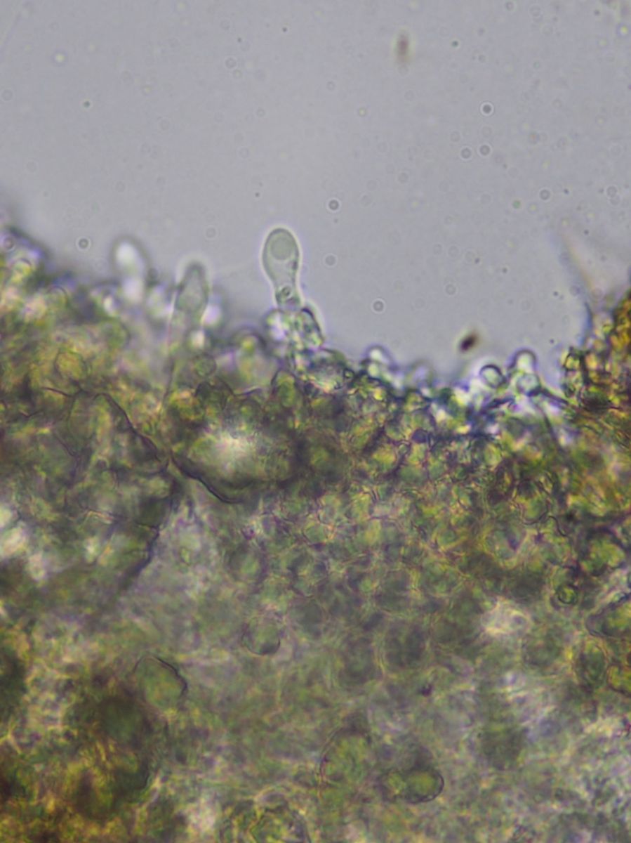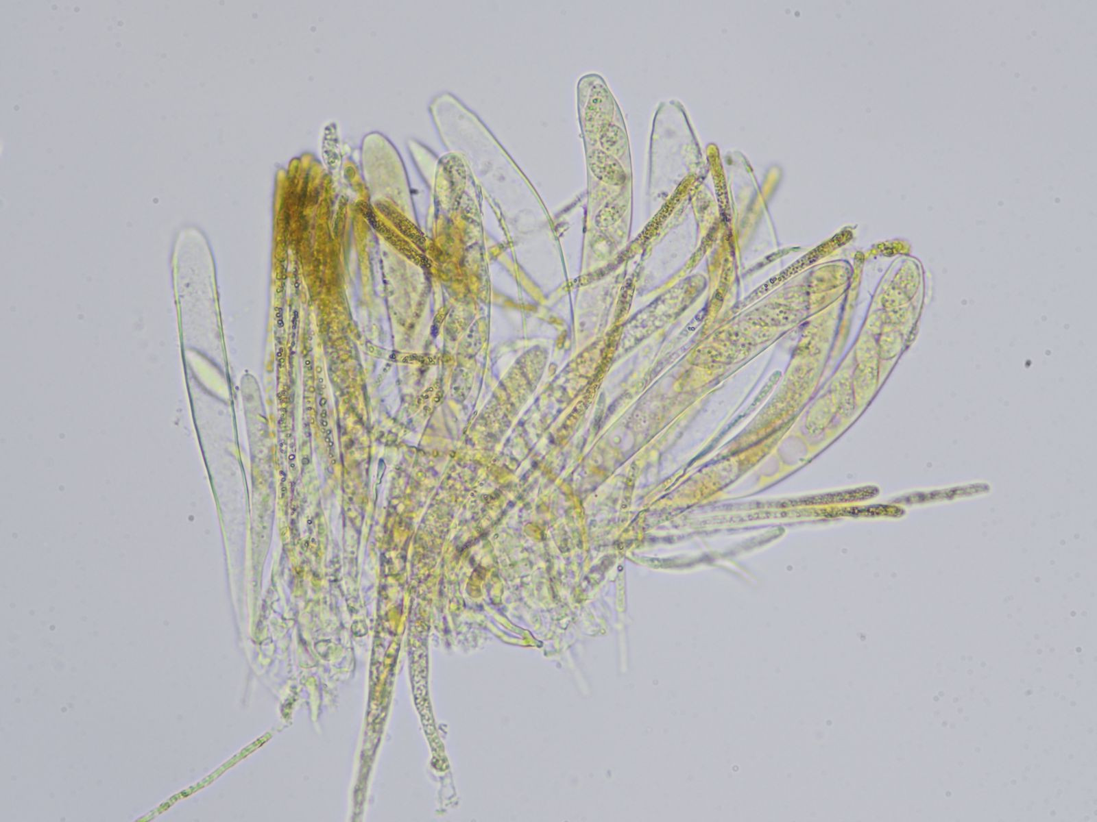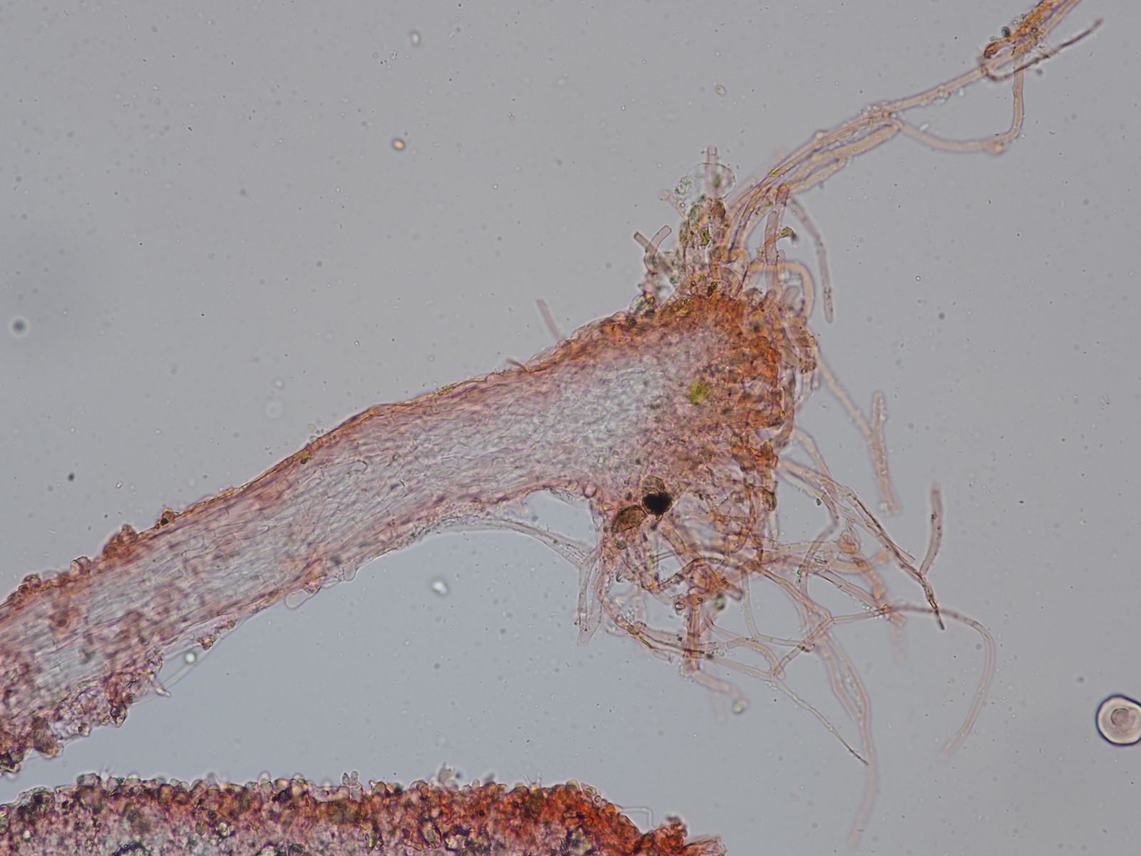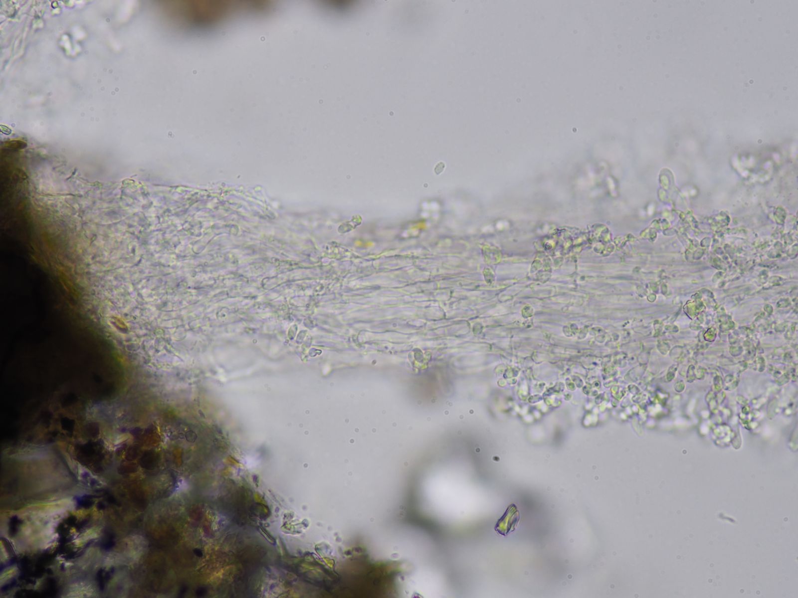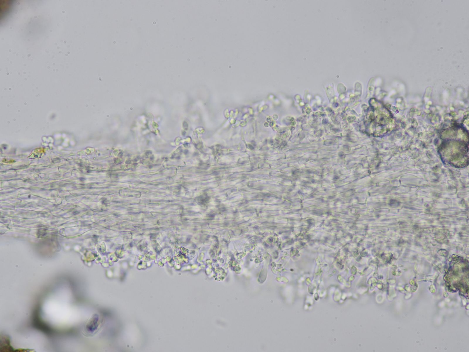 Den zweiten Fund, den ich vorstellen möchte machte ich an einer vertikalen Seite eines großen (Silikat-) Sandsteinquaders. Es handelt sich um gruppierte reinweisse "Eiszapfen" bis ca 1,5mm Länge auf abgestorbenem Moos/Rhizoid. Wie erwartet gestaltet sich die Bestimmung schwierig. Die Sporenmaße passen gut zu Mucronella calva, die allerdings auf Holz (ausschließlich?) vorkommt. Ebenfalls in Frage kommt Ceratellopsis spec. die auf abgestorbenen Moosen vorkommen soll, was besser passt, für sie werden jedoch größere Sporenmaße angegeben. Kristalle, Schnallen und amyloide Sporen sind wohl kein Trennmerkmal da bei beiden Gattungen beschrieben. Ich kann daher keine definitive Zuordnung treffen. Aber vielleicht hat sich ja jemand von euch bereits eingehender damit beschäftigt und hat eine Meinung dazu?