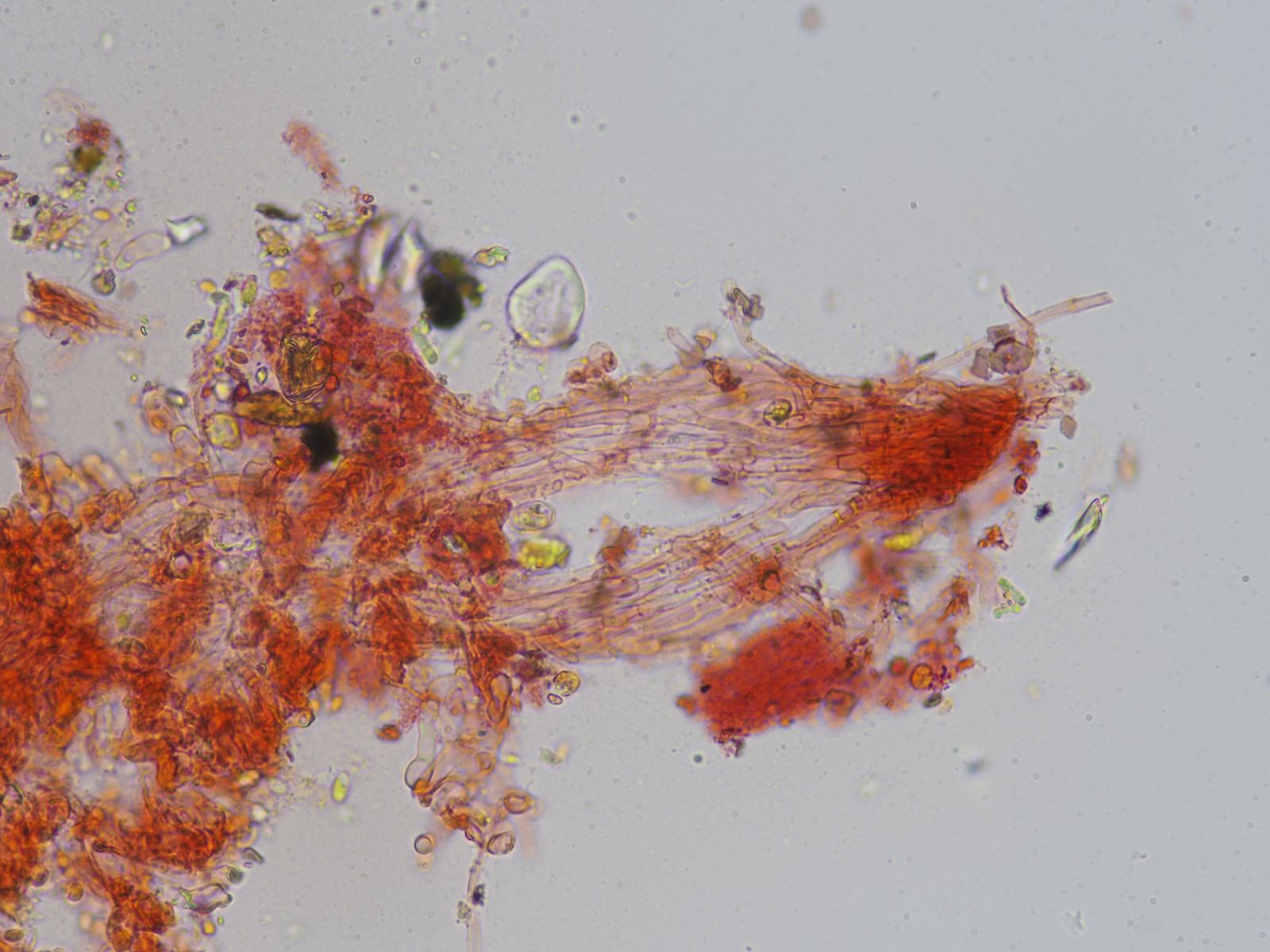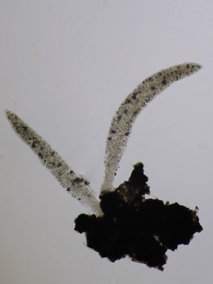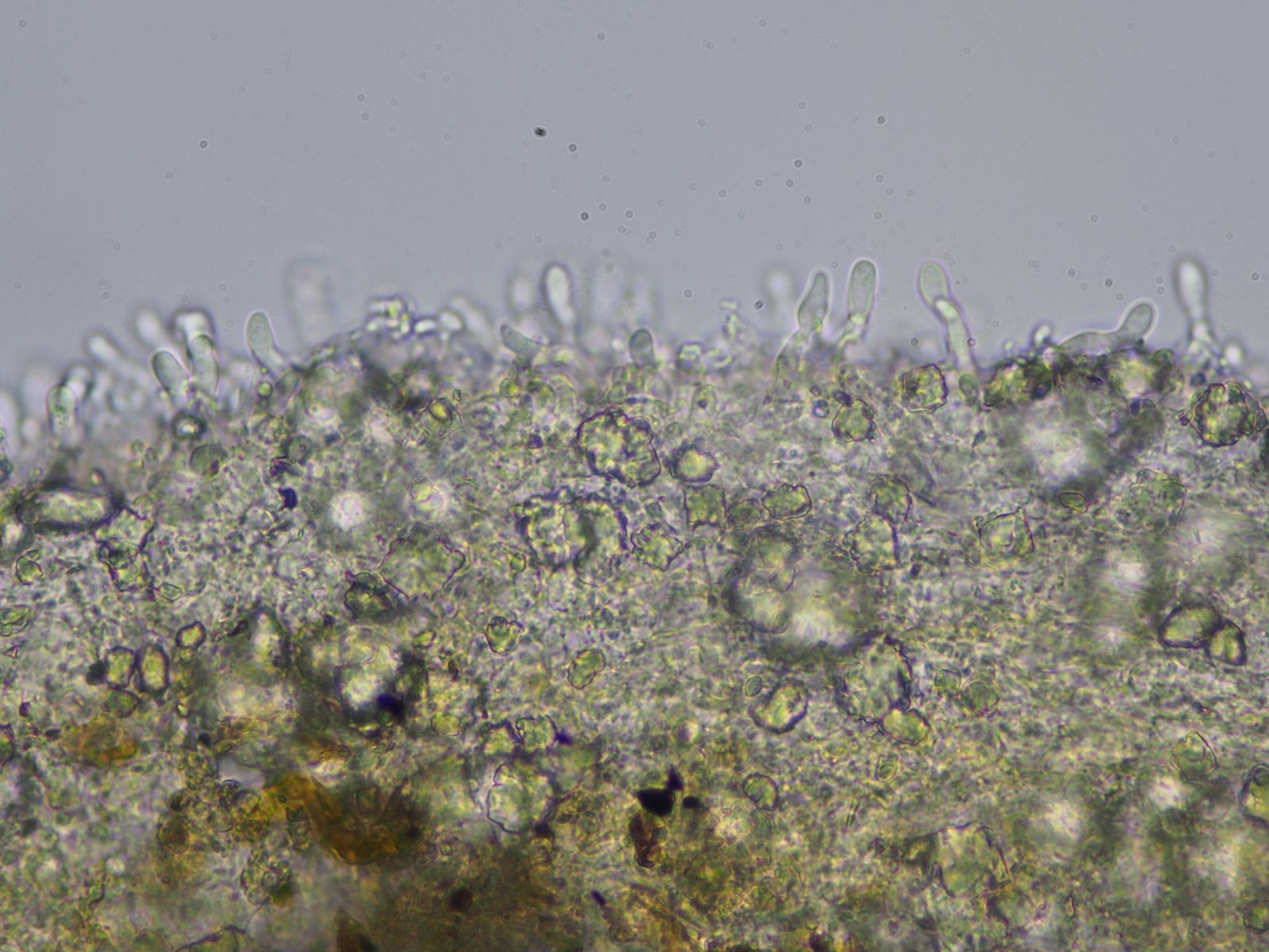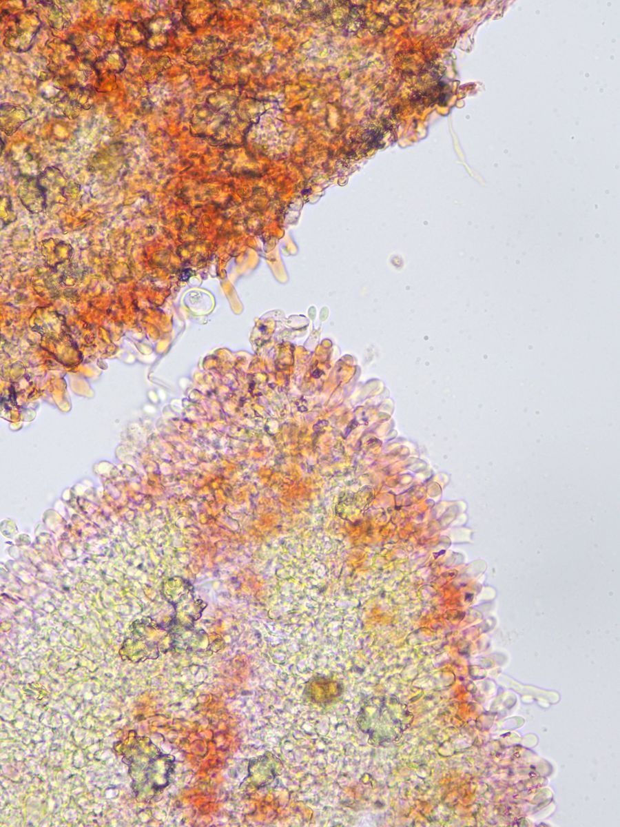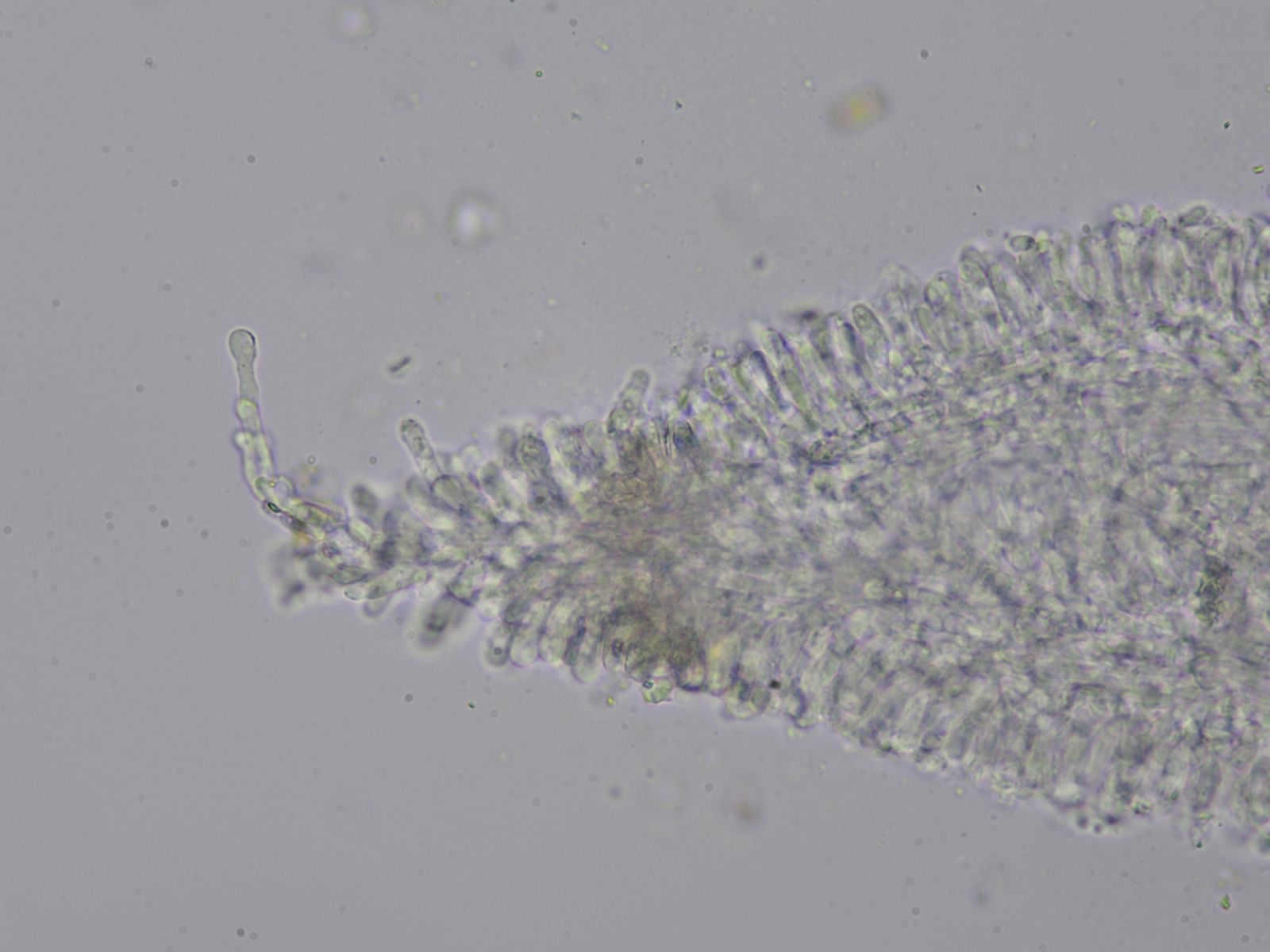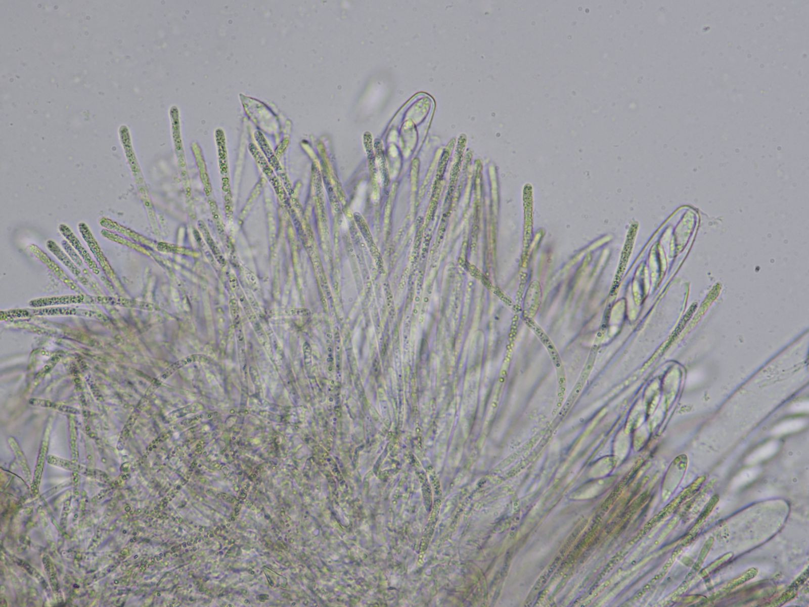 Den zweiten Fund, den ich vorstellen möchte machte ich an einer vertikalen Seite eines großen (Silikat-) Sandsteinquaders. Es handelt sich um gruppierte reinweisse "Eiszapfen" bis ca 1,5mm Länge auf abgestorbenem Moos/Rhizoid. Wie erwartet gestaltet sich die Bestimmung schwierig. Die Sporenmaße passen gut zu Mucronella calva, die allerdings auf Holz (ausschließlich?) vorkommt. Ebenfalls in Frage kommt Ceratellopsis spec. die auf abgestorbenen Moosen vorkommen soll, was besser passt, für sie werden jedoch größere Sporenmaße angegeben. Kristalle, Schnallen und amyloide Sporen sind wohl kein Trennmerkmal da bei beiden Gattungen beschrieben. Ich kann daher keine definitive Zuordnung treffen. Aber vielleicht hat sich ja jemand von euch bereits eingehender damit beschäftigt und hat eine Meinung dazu?