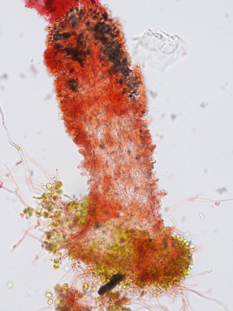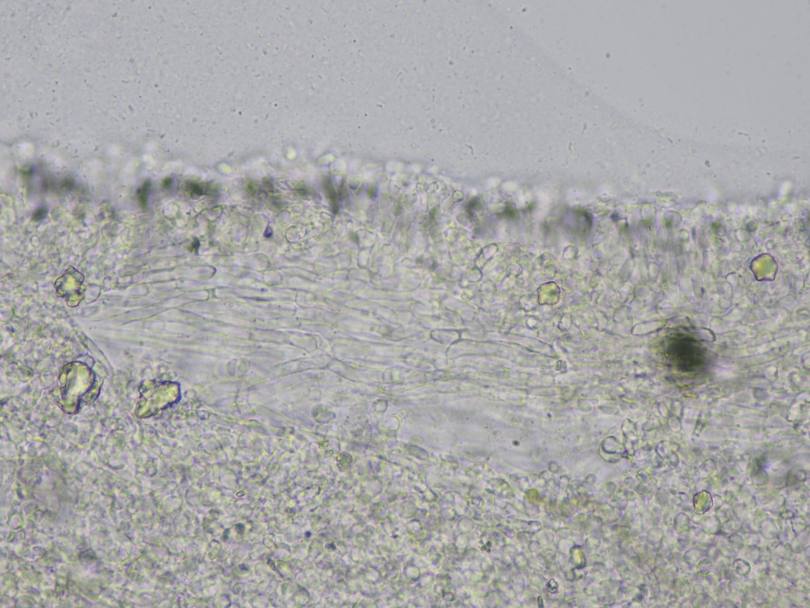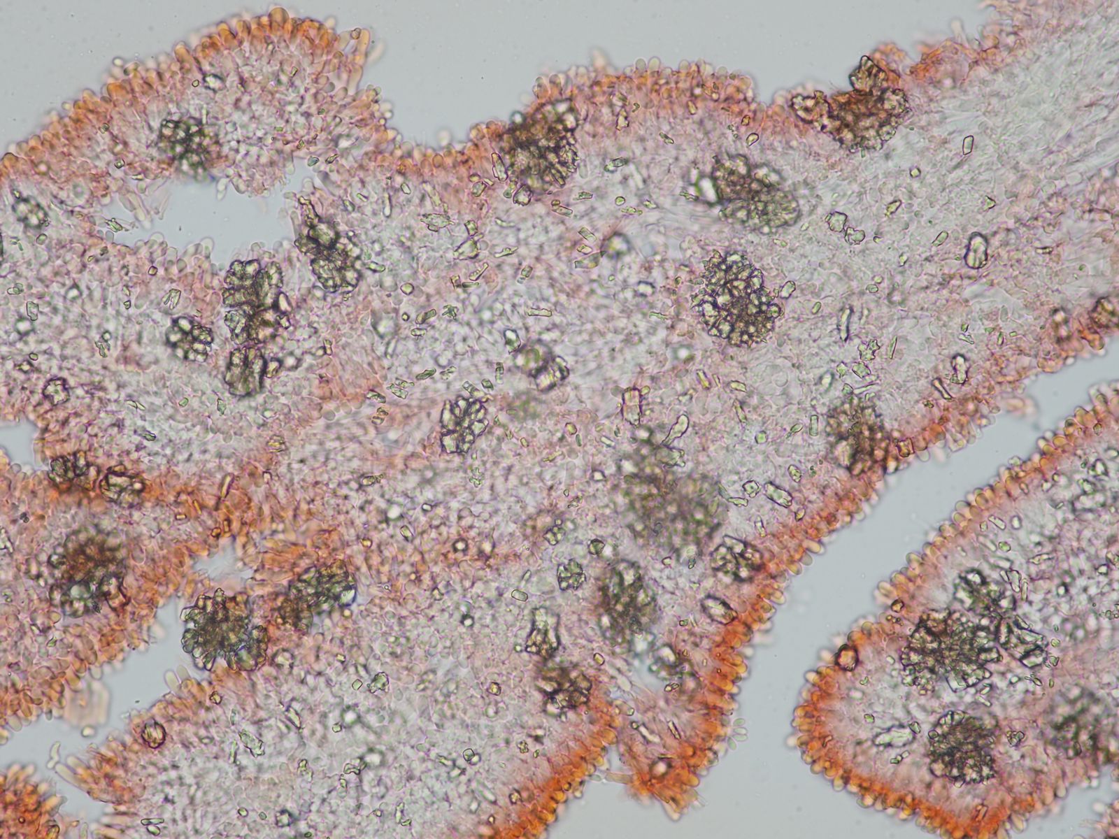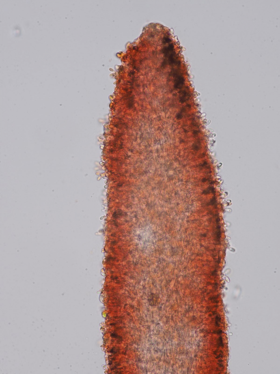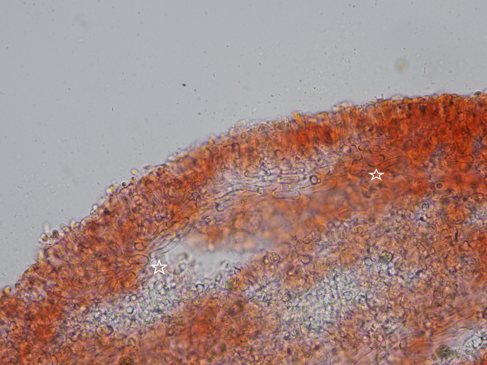 Den zweiten Fund, den ich vorstellen möchte machte ich an einer vertikalen Seite eines großen (Silikat-) Sandsteinquaders. Es handelt sich um gruppierte reinweisse "Eiszapfen" bis ca 1,5mm Länge auf abgestorbenem Moos/Rhizoid. Wie erwartet gestaltet sich die Bestimmung schwierig. Die Sporenmaße passen gut zu Mucronella calva, die allerdings auf Holz (ausschließlich?) vorkommt. Ebenfalls in Frage kommt Ceratellopsis spec. die auf abgestorbenen Moosen vorkommen soll, was besser passt, für sie werden jedoch größere Sporenmaße angegeben. Kristalle, Schnallen und amyloide Sporen sind wohl kein Trennmerkmal da bei beiden Gattungen beschrieben. Ich kann daher keine definitive Zuordnung treffen. Aber vielleicht hat sich ja jemand von euch bereits eingehender damit beschäftigt und hat eine Meinung dazu?