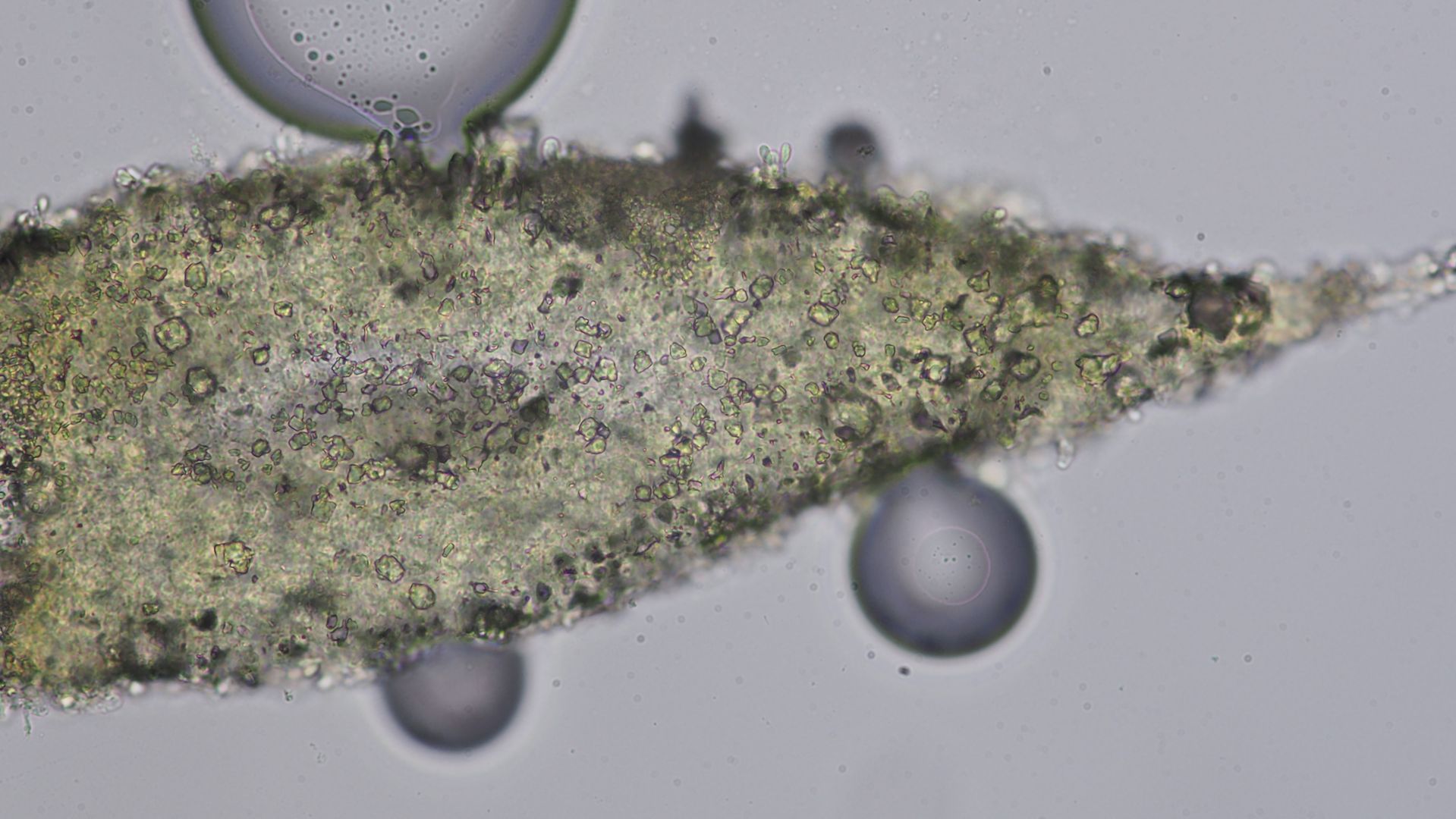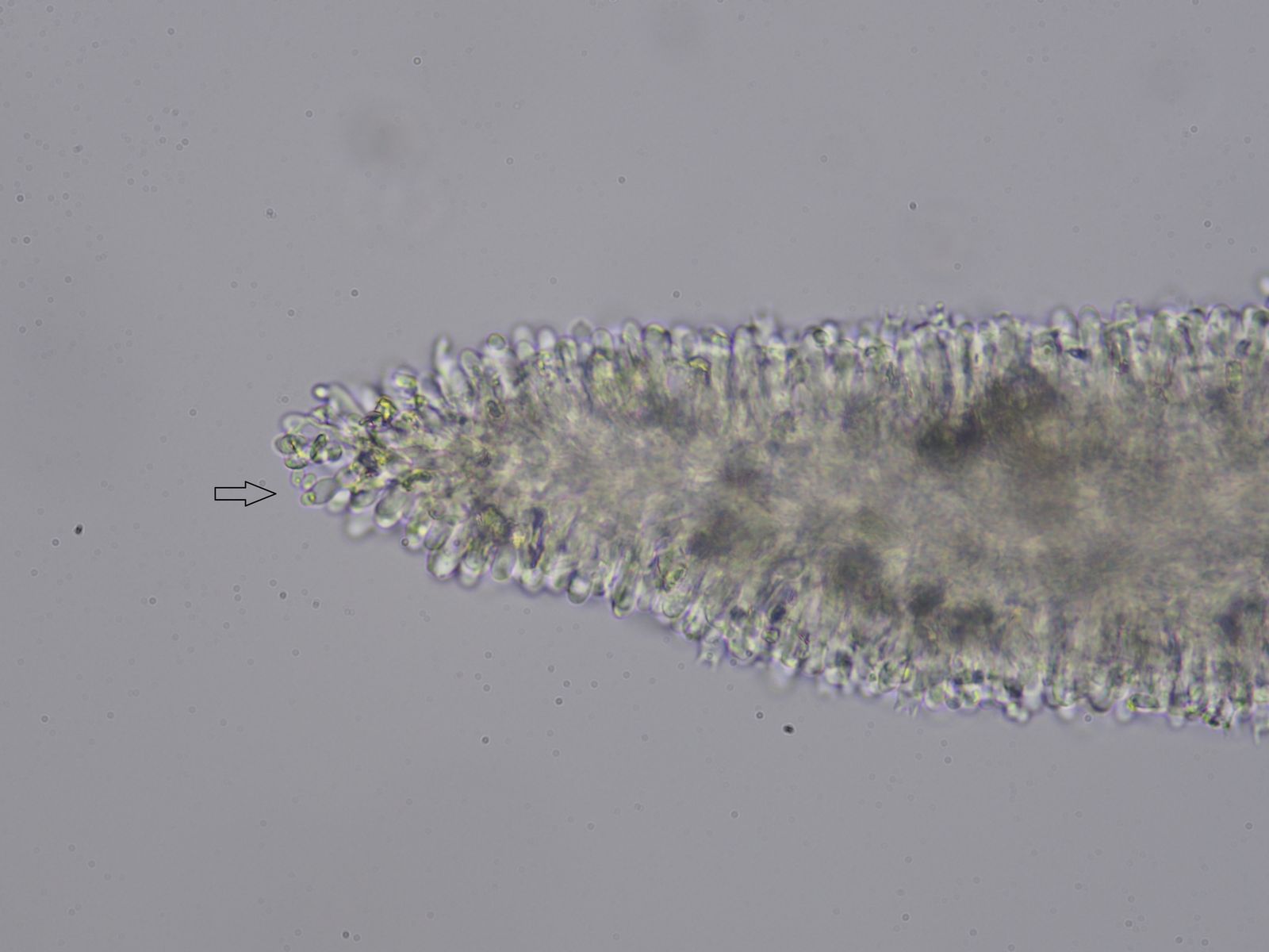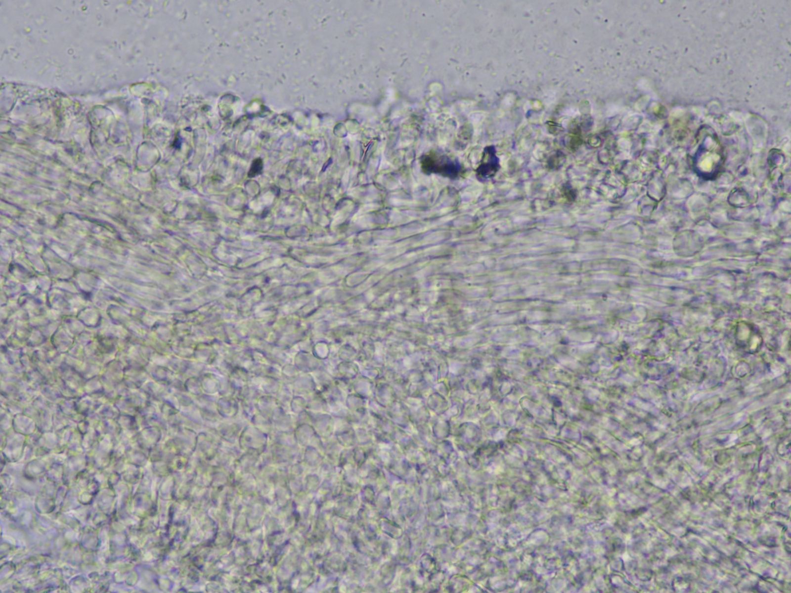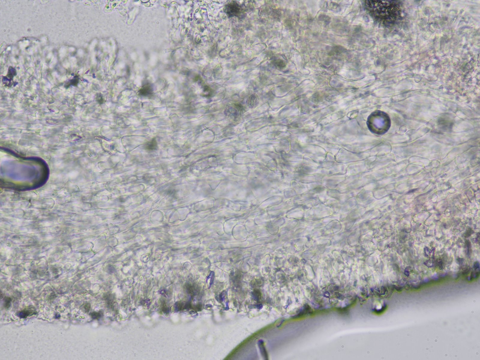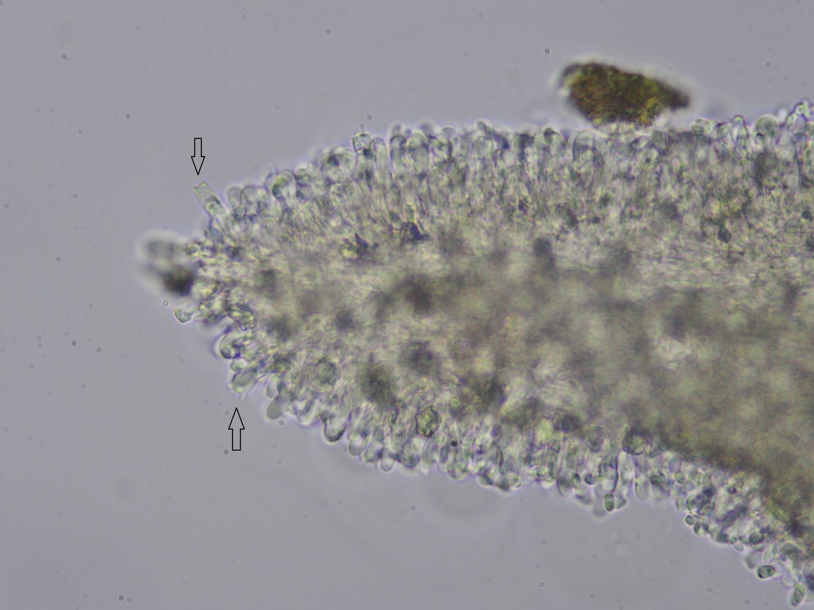 Den zweiten Fund, den ich vorstellen möchte machte ich an einer vertikalen Seite eines großen (Silikat-) Sandsteinquaders. Es handelt sich um gruppierte reinweisse "Eiszapfen" bis ca 1,5mm Länge auf abgestorbenem Moos/Rhizoid. Wie erwartet gestaltet sich die Bestimmung schwierig. Die Sporenmaße passen gut zu Mucronella calva, die allerdings auf Holz (ausschließlich?) vorkommt. Ebenfalls in Frage kommt Ceratellopsis spec. die auf abgestorbenen Moosen vorkommen soll, was besser passt, für sie werden jedoch größere Sporenmaße angegeben. Kristalle, Schnallen und amyloide Sporen sind wohl kein Trennmerkmal da bei beiden Gattungen beschrieben. Ich kann daher keine definitive Zuordnung treffen. Aber vielleicht hat sich ja jemand von euch bereits eingehender damit beschäftigt und hat eine Meinung dazu?