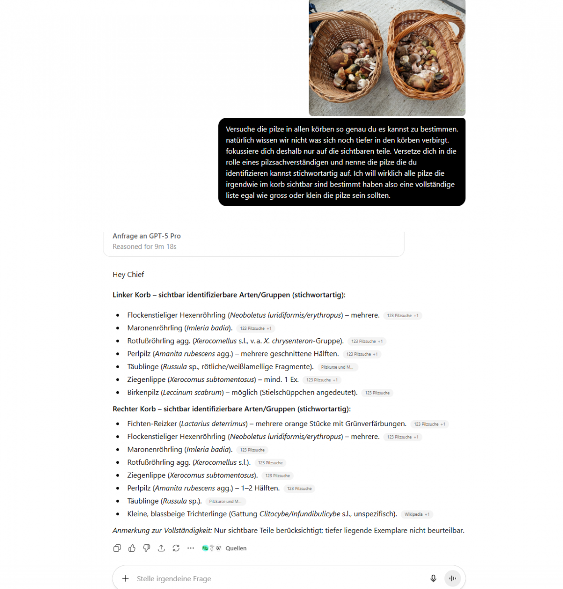 Man kann die prompts natürlich auch so schreiben dass es die Pilze dann trotzdem bestimmt zumindest wenn wir auf GPT 5 thinking und pro gehen allerdings habe ich mir den Prozugang nur für einen einzigen Monat geholt um zu schauen was das Ding halt alles kann (spoiler: preis aus meiner Sicht nicht gerechtfertigt) und habe auch da für den GPT 5 Pro nur 15 Nachrichten im Monat sonst hätte ich es auf jeden Fall genutzt um noch viel mehr Tests rauszuholen.