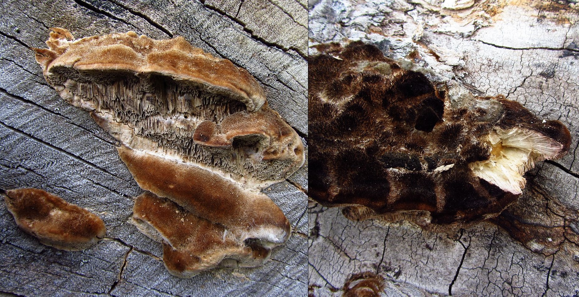 Die Substratvorlieben von Trametes trogii (Blasse Borstentramete) und Coriolopsis gallica (Braune Borstentramete) sind zwar verschieden, aber grundsätzlich können beide Arten so ziemlich jedes verfügbare Laubholz besiedeln. Vergesellschaftet an einem Stamm sind mir beide Arten zusammen auch schon begegnet, und zwar sowohl an Rotbuche als auch an Pappel.