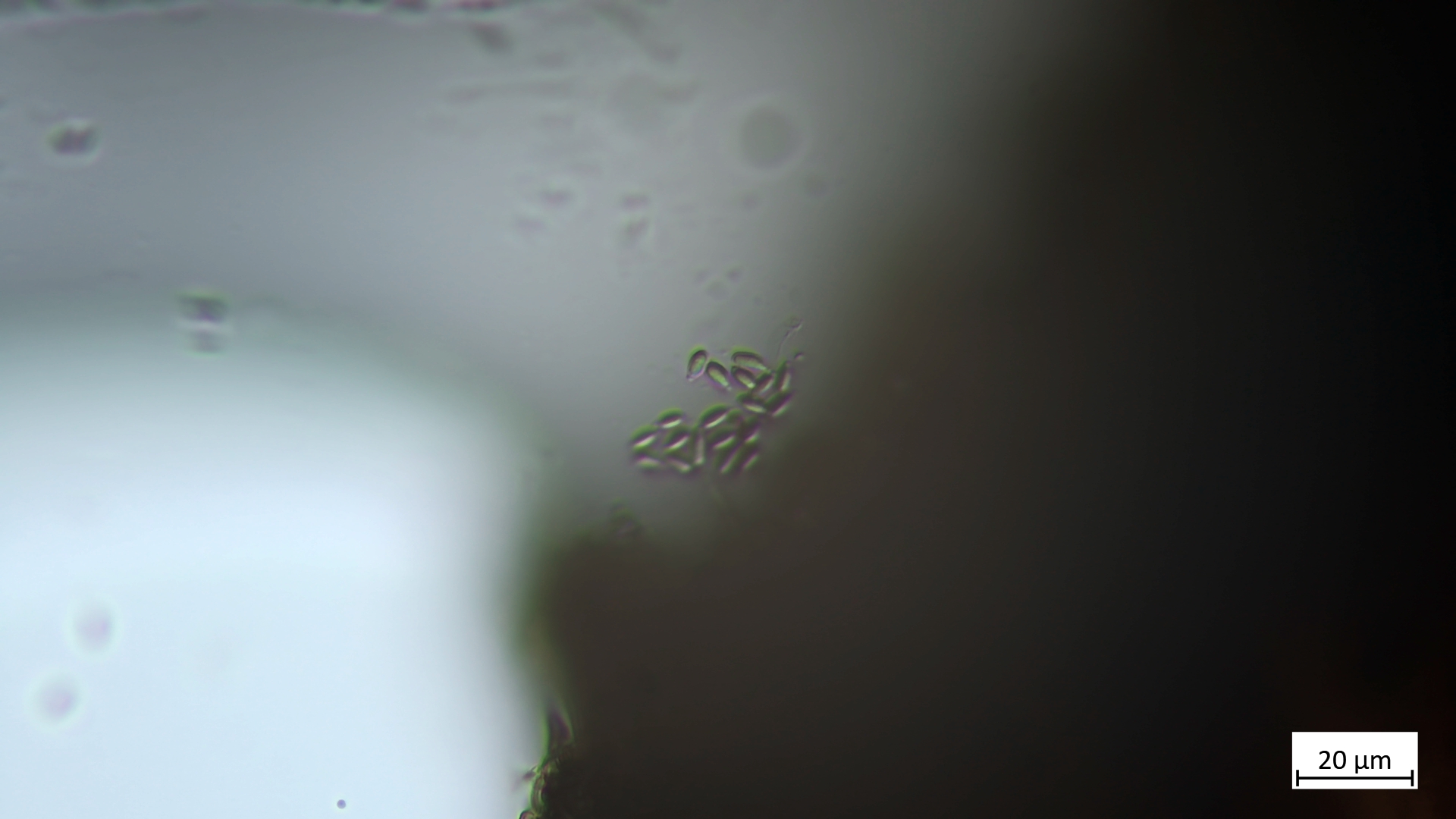Die Sporen habe ich erst vermisst, fand nur etwas ganz Kleines. Dank dem sehr schönen Portrait von Pablo: Tectella patellaris = Klebriger Schleierseitling konnte ich die Winzlinge dann aber doch als Sporen zuordnen: