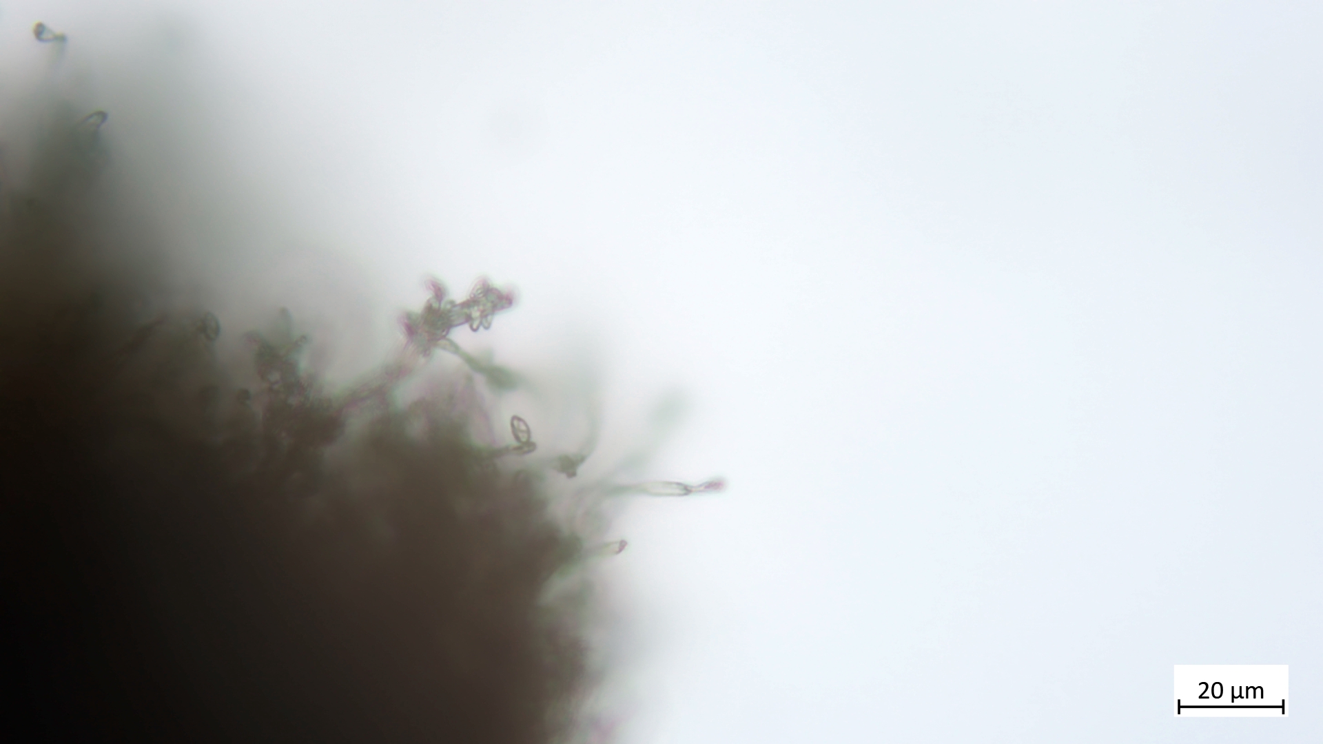 Und die Elemente auf der Oberfläche in KOH3% (in KOH3% entfärbt der Pilz übrigens Braun, Trägerflüssigkeit färbt sich braungelb)