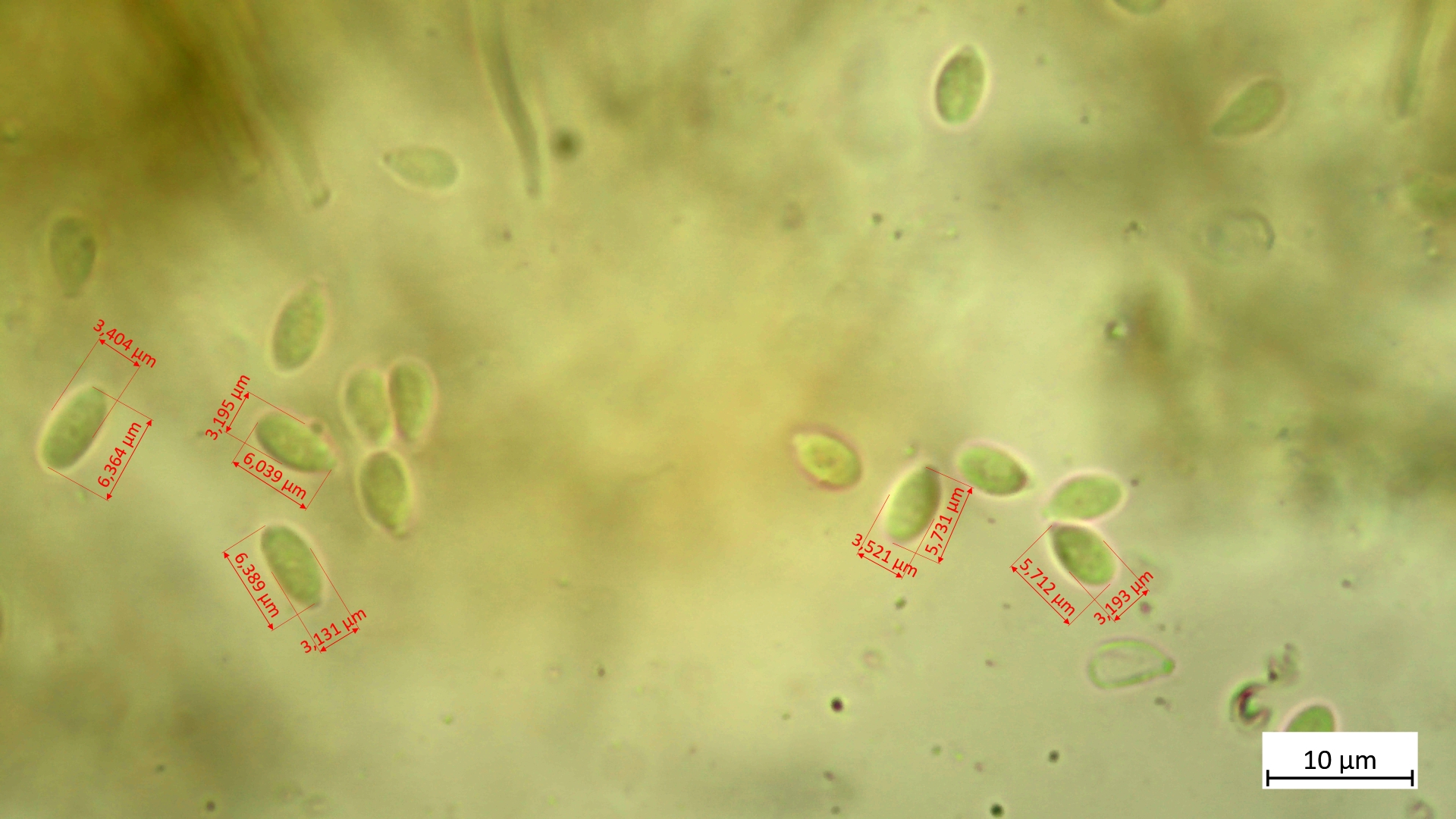 Sporen ellipsoid, mit Apikulus: 5,7-6,4 µm (av. 6,0 µm, SD 0,3 µm) x 3,1-3,5 µm (av. 3,3 µm, SD 0,1 µm); Q = 1,6-2,0 (av. 1,8, SD 0,1)(n = 5)