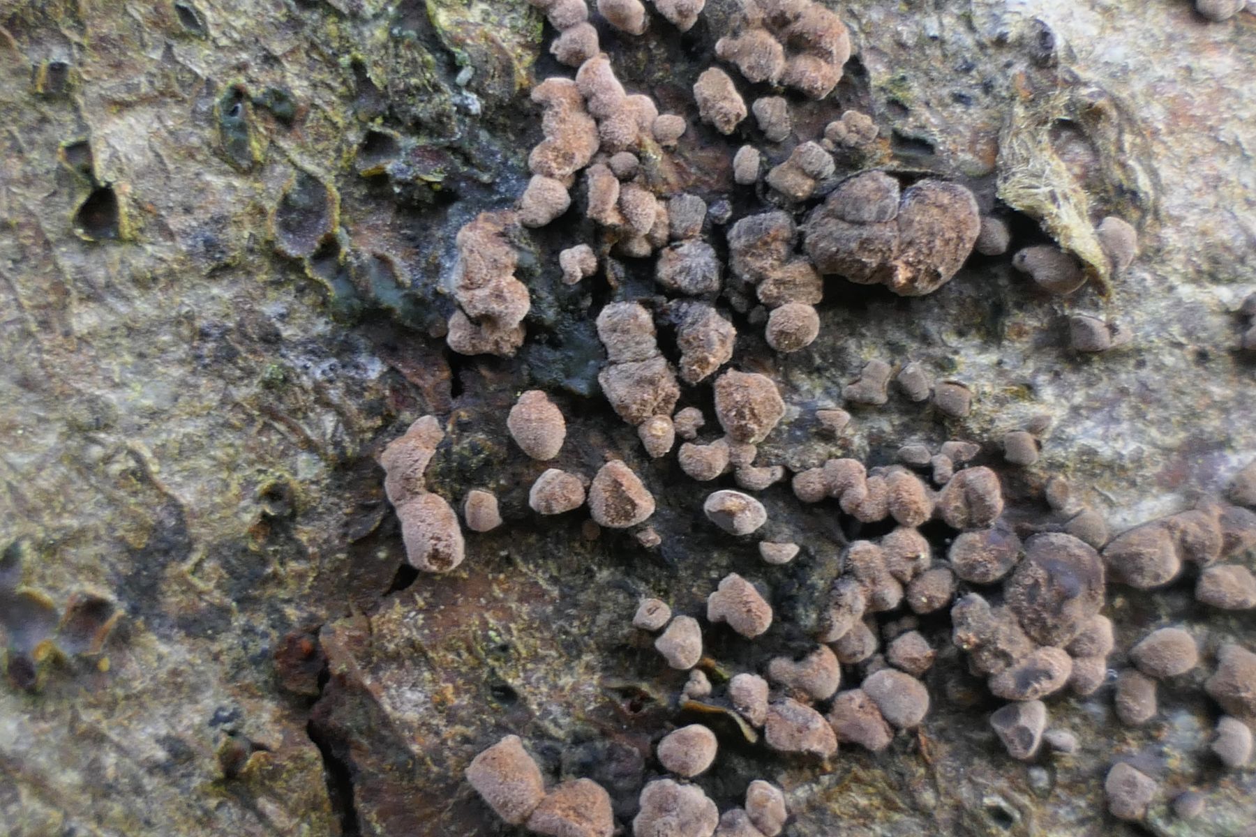 Mein Weihnachts-Erstfund von Phleogena faginea saß teilweise auch ohne sichtbaren Stiel auf der Rinde auf; den Stiel gab es aber dennoch und er durchbrach die Rinde.