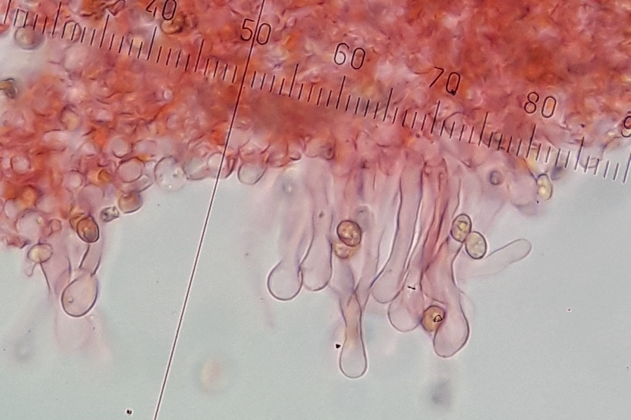 Lamellen: Breit angewachsen bis leicht herablaufend, rötlich braun gefärbt. Viele Lameletten.