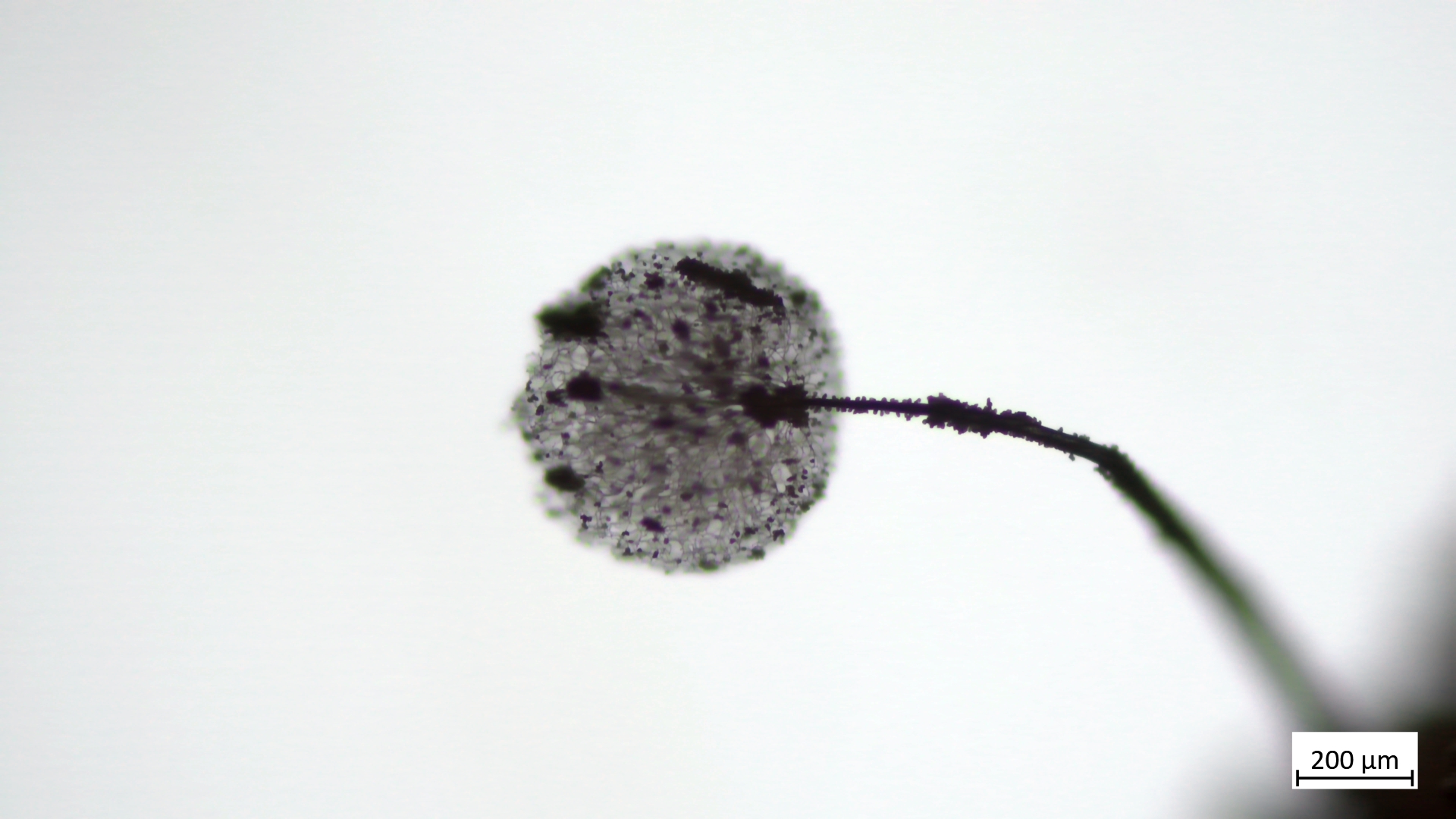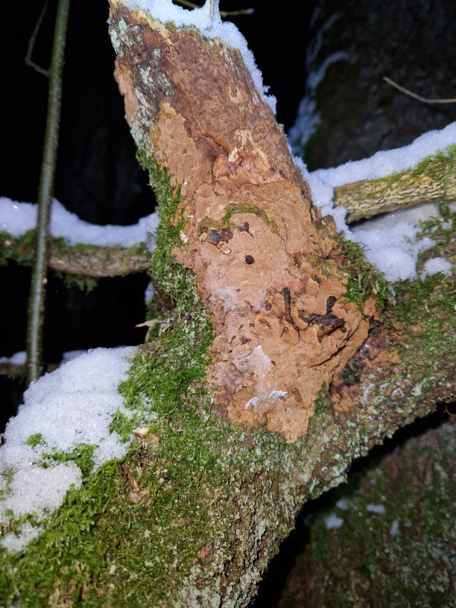 Interessant, auf einem corticoid wachsenden Pilz aufsitzend (kann der wohl), die corticoide Art konnte ich nicht bestimmen, habe im Halbdunkel auch nur schlechte Handybilder hinbekommen:
