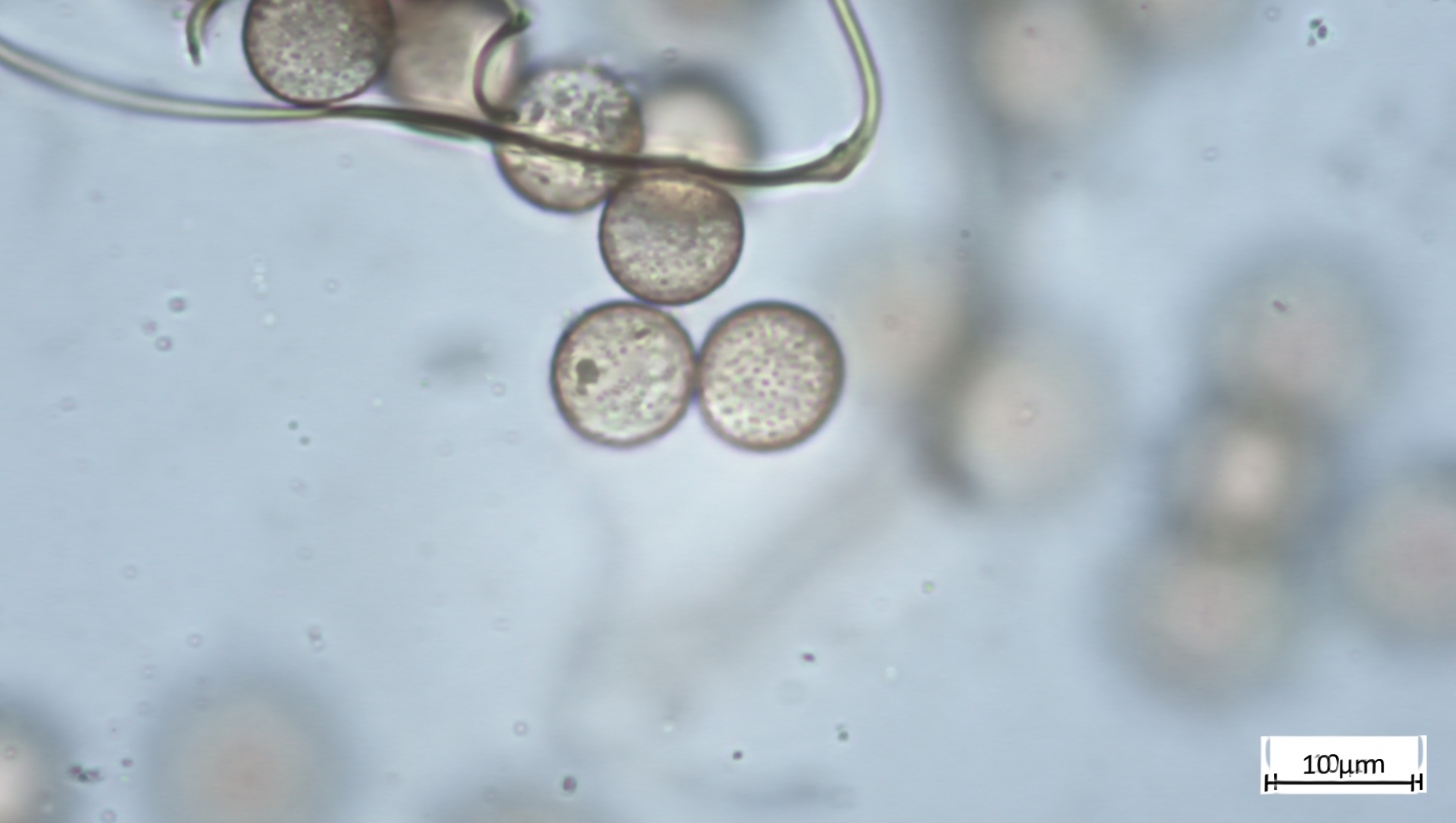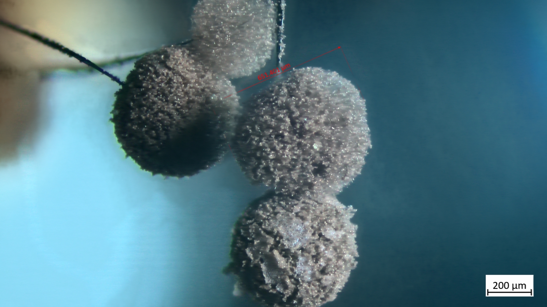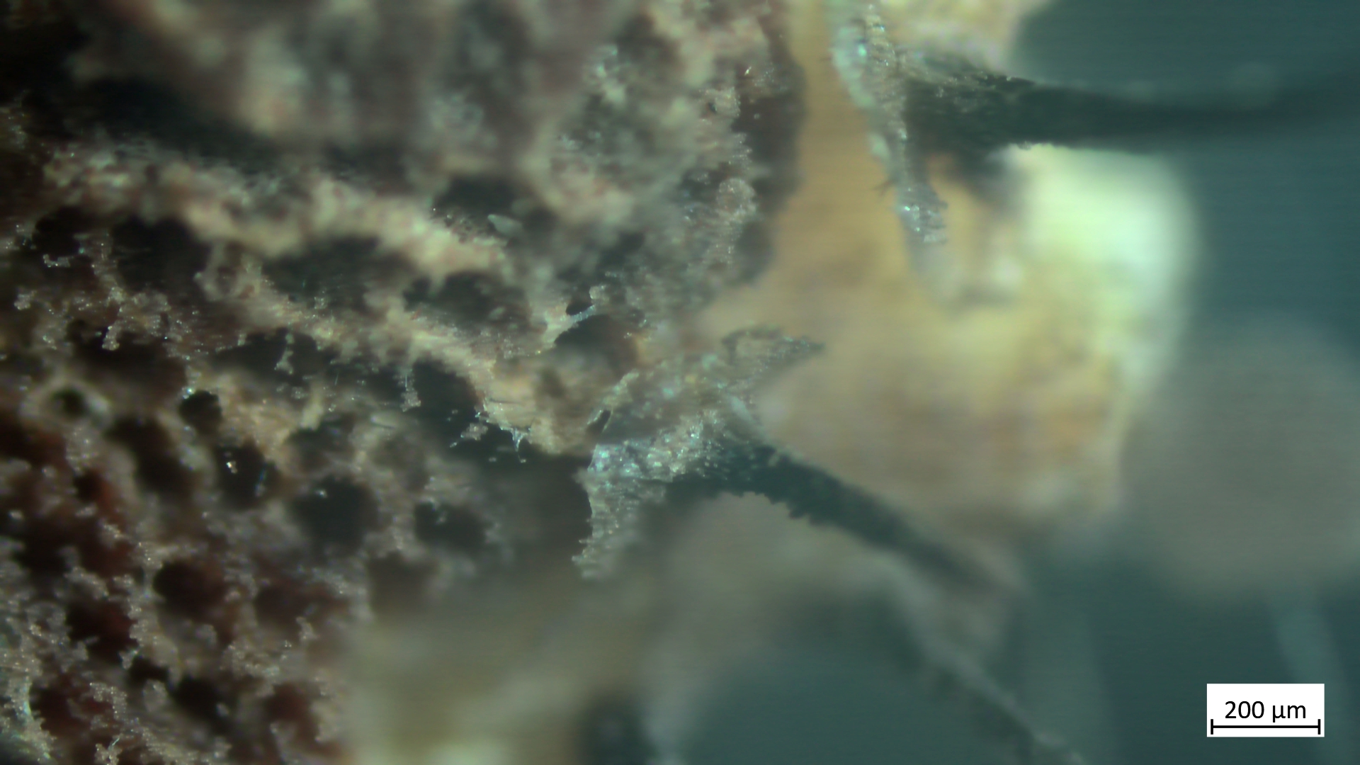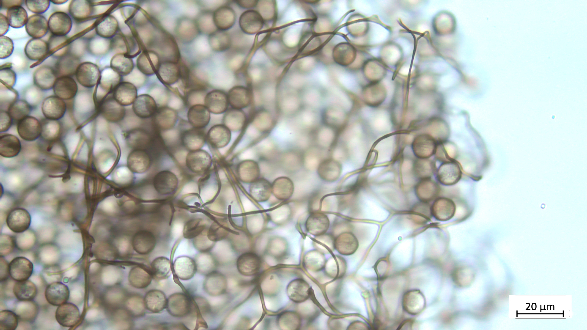 Da sind die langgestielten Fruchtkörper etwa in der Bildmitte (etwas mehr rechts) auf dem anderen Pilz zu erkennen.
