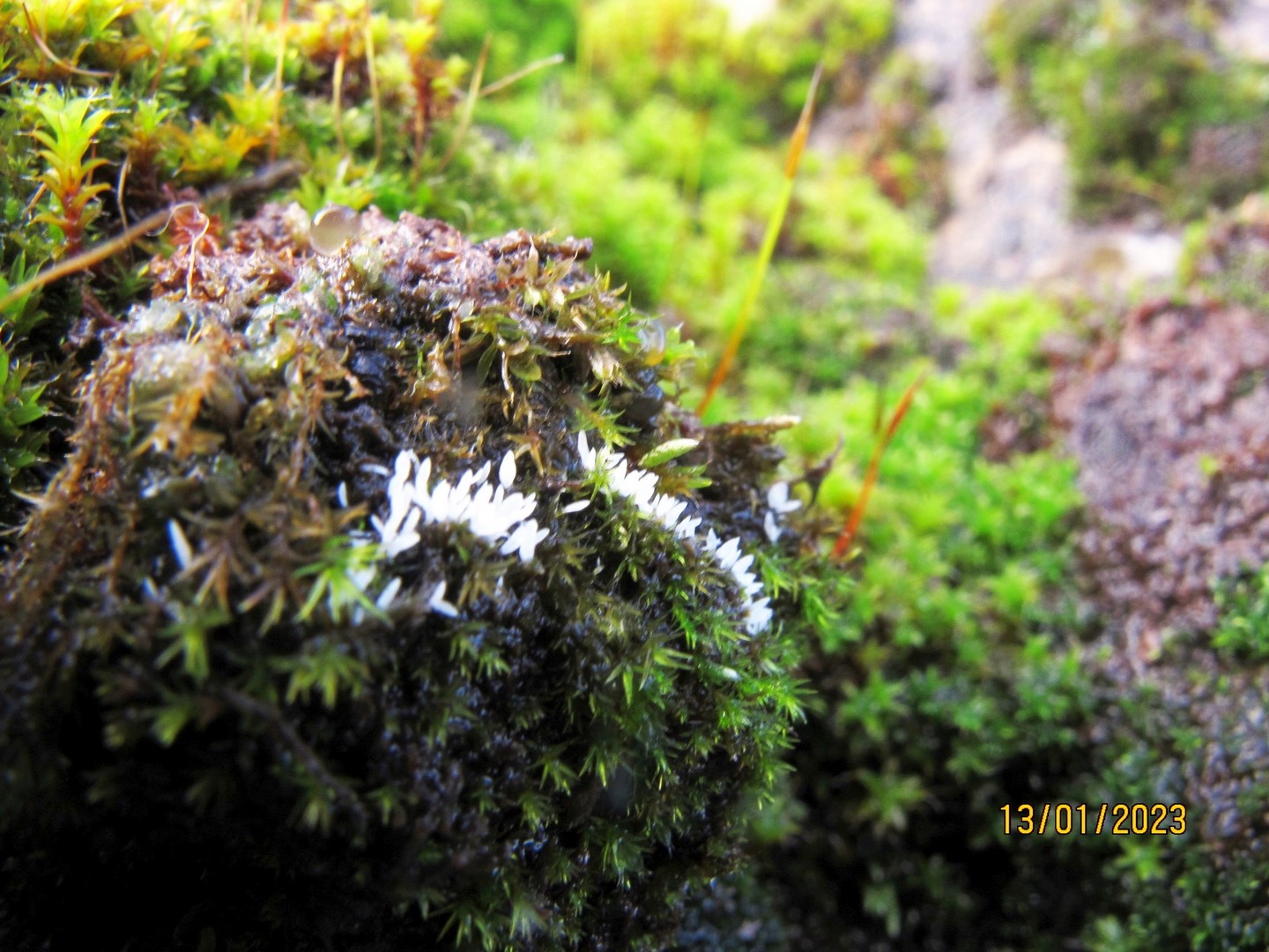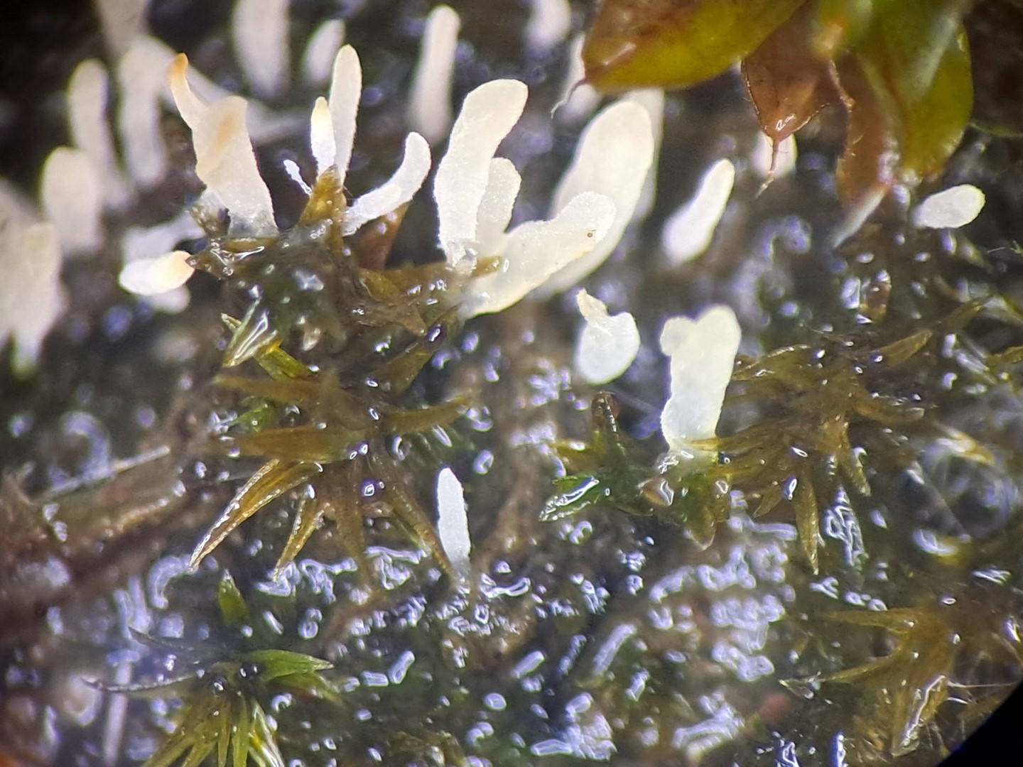 Auf diesem nassem "Bryophyta-Bioptop" fand ich neben Arrhenia (Omphalina) rickenii, der Mauer-Geröllnabeling und Arrhenia retiruga, der Blasse Adermoosling (ungewöhnlich klein 1-2mm), eine kleine Gruppe mit schönen weißen Minikeulchen von ca. 1mm.