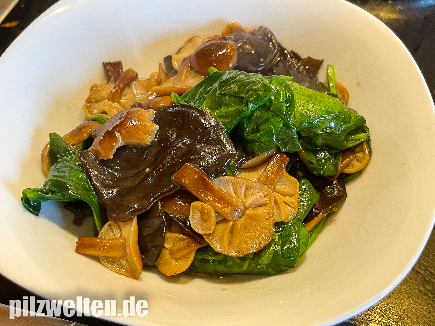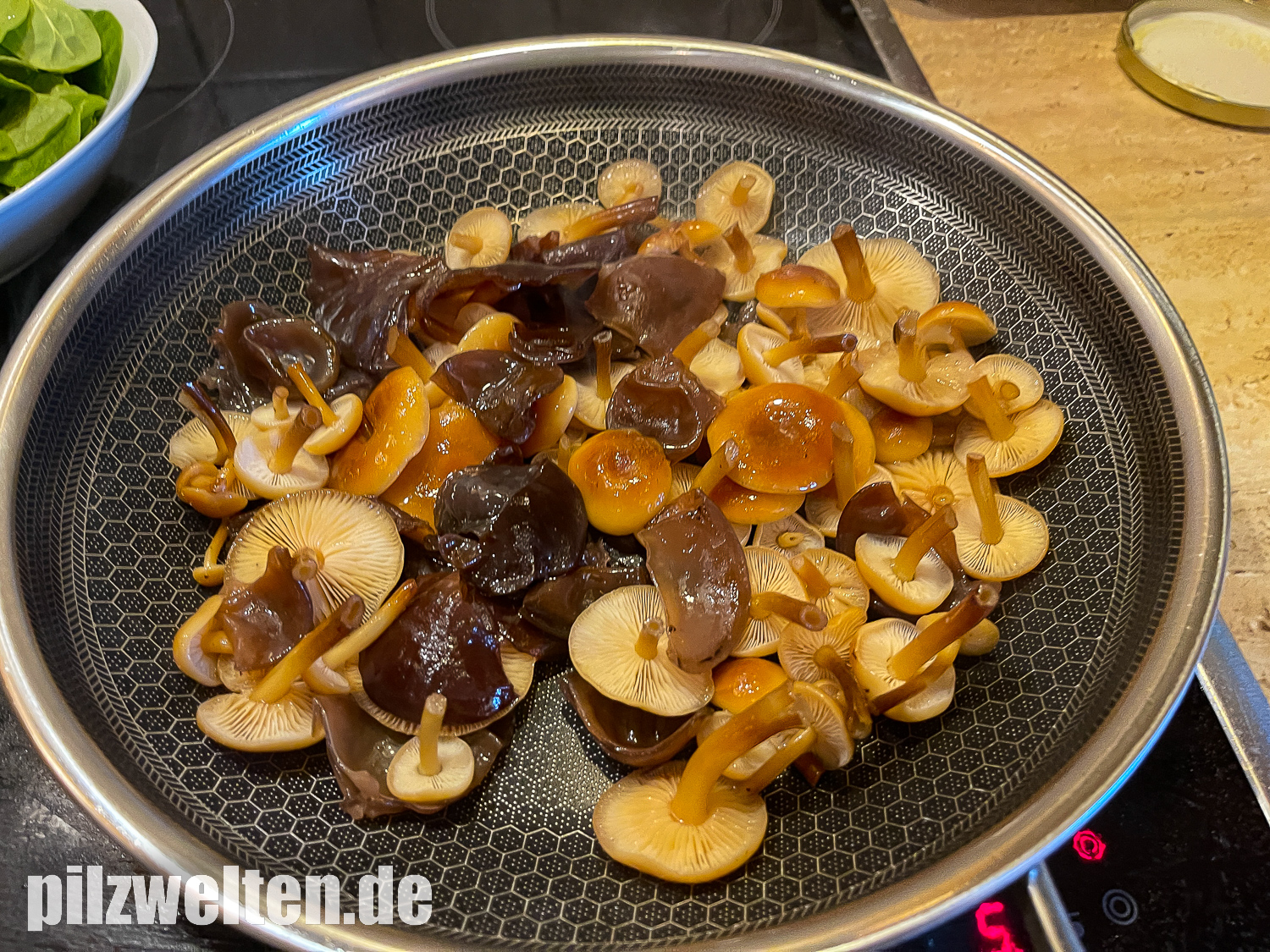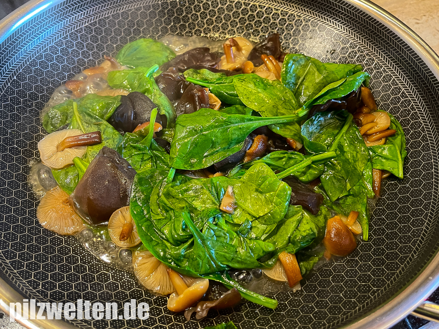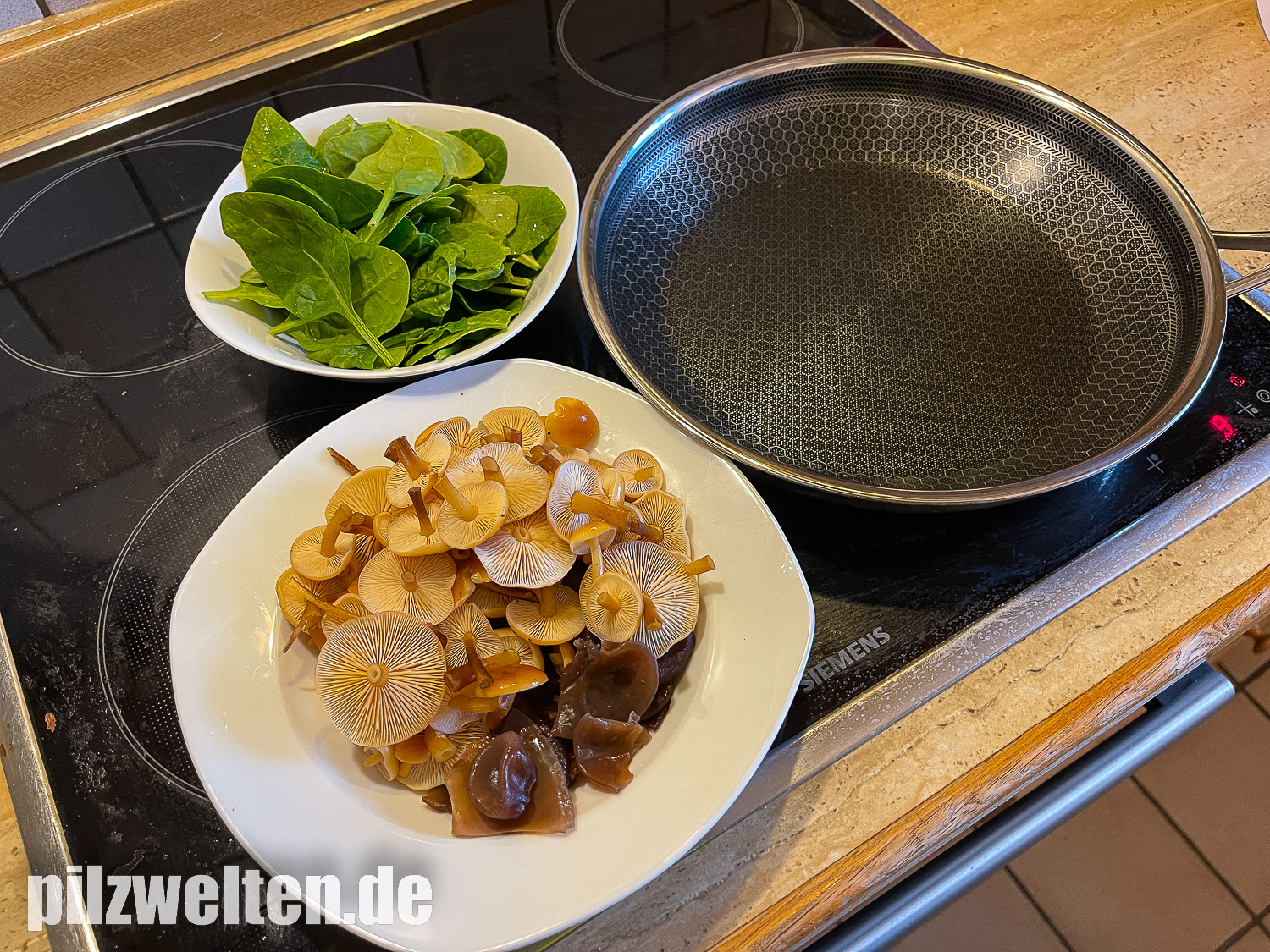Die Judasohren sollten vor der Zubereitung kleingeschnitten werden, damit sie nicht aus der Pfanne hüpfen. Bei den Samtfüßen sollte der dunkle Teil des Stiels weggeschnitten werden, da der ja bekanntlich recht zäh ausfällt. Ansonsten braucht es noch den Spinat. Wichtig ist bei dem Rezept, dass der Anteil der relativ geschmacksneutralen, aber sehr gesunden, Judasohren bei maximal 20-30% liegt und der Rest aus aromatischen Arten wie Samtfußrüblingen oder Austernseitlingen besteht.
