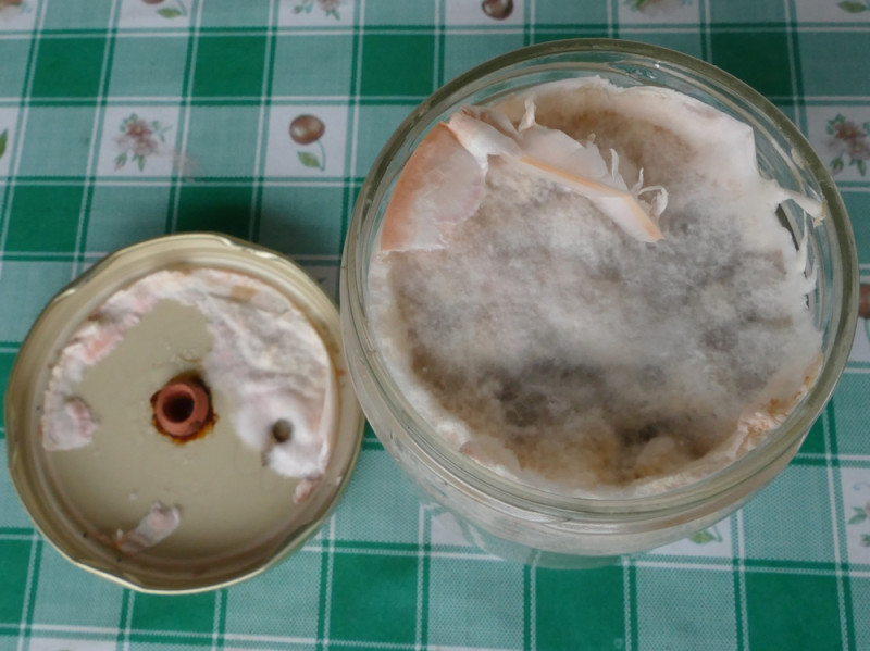 Heute entdeckte ich in der Thermobox, wo die Gläser mit Körnerbrut stehen, nach einer Erhöhung der Luftfeuchtigkeit von 40 auf 70% auf einem Glas eine explosionsartige Ausblühung von Bäckerschimmel. Das Ganze ist in nur 6-7 Stunden passiert, ohne dass vorher irgend etwas zu sehen gewesen wäre. Ich kontrolliere alles 3-4x täglich auf Temperatur, Luftfeuchte und Aussehen.