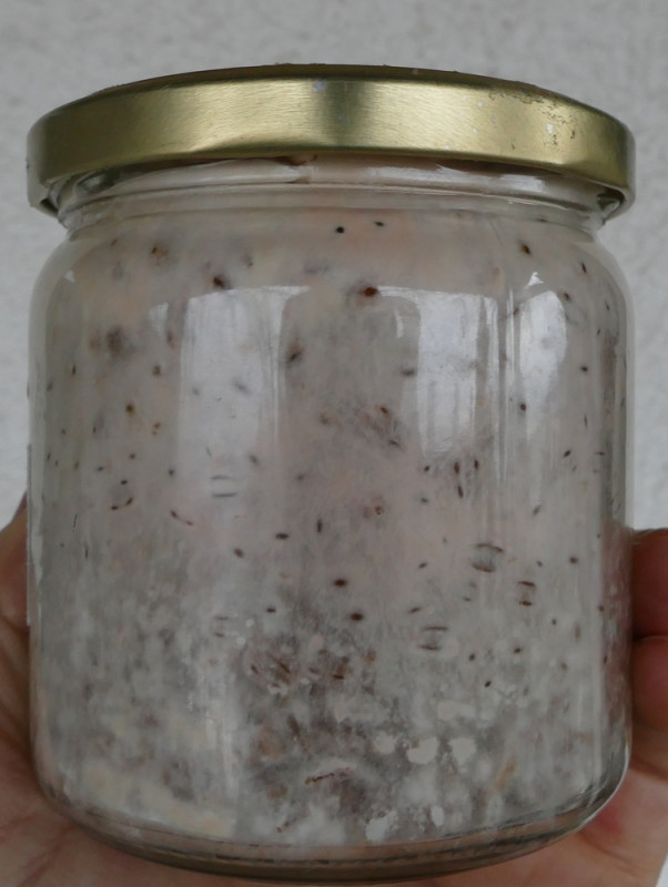 Ich habe das Glas sofort entnommen und abgewaschen. Danach die Box und alle Gläser mit Chlorlösung zu desinfizieren versucht. Ich hoffe nicht, dass mir jetzt durch das Micropore hindurch alle Brut abgetötet wird. Das Glas steht nun isoliert. Die Körnerbrut ist mit dem Rosenseitlingmyzel bis unten durchwachsen. Woraus der Bäckerpilz seine Energie zieht, ist mir völlig schleiherhaft, da er bei dem Glas keinen Zugang zum Getreide hat, es sei denn er hätte es in der kurze Zeit durch das Micropore und das Rosenseitlingsmyzel geschafft. Auf jeden Fall braucht der Bäckerschimmel unbedingt Sauerstoff, denn er wächst immer nur da, wo er Luft bekommt. Das war auch in den Tüten so. Unter diesen Bedingungen mit offensichtlich Sporen überall bekomme ich auf jeden Fall nie eine eigene Kultivierung hin.