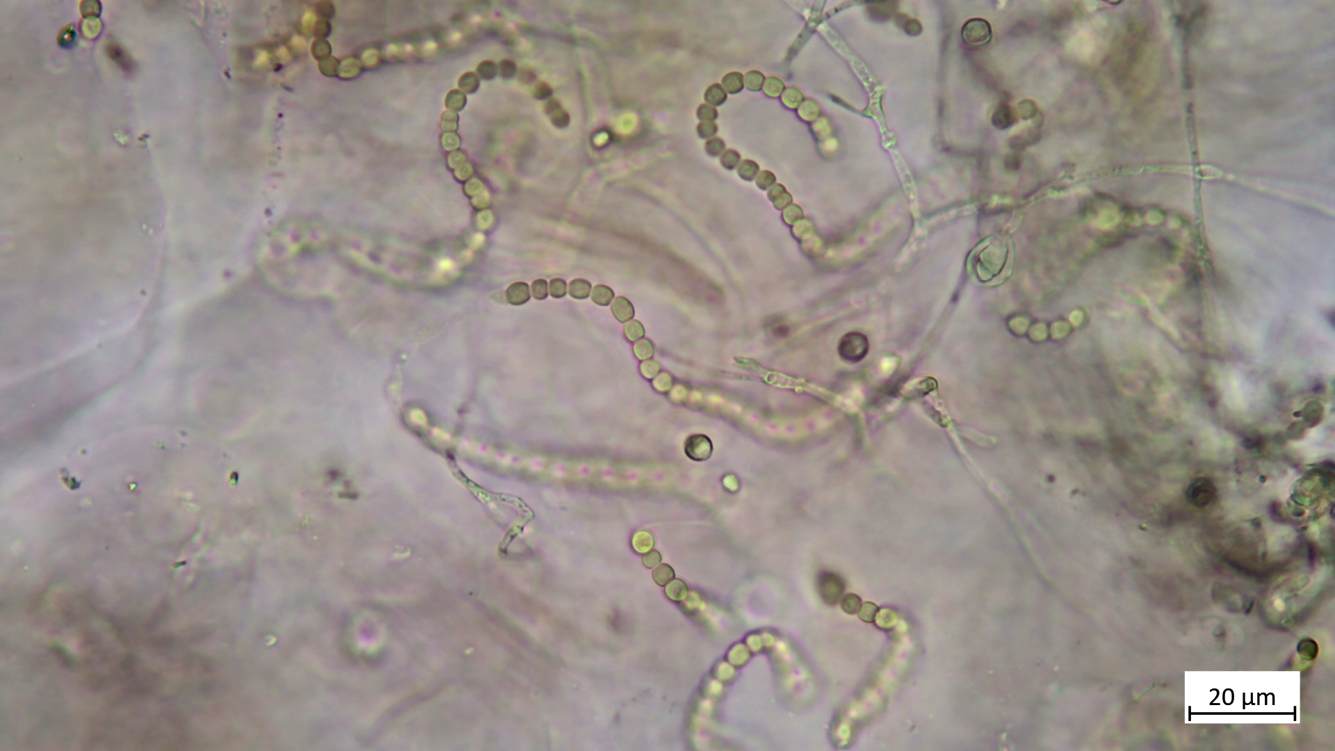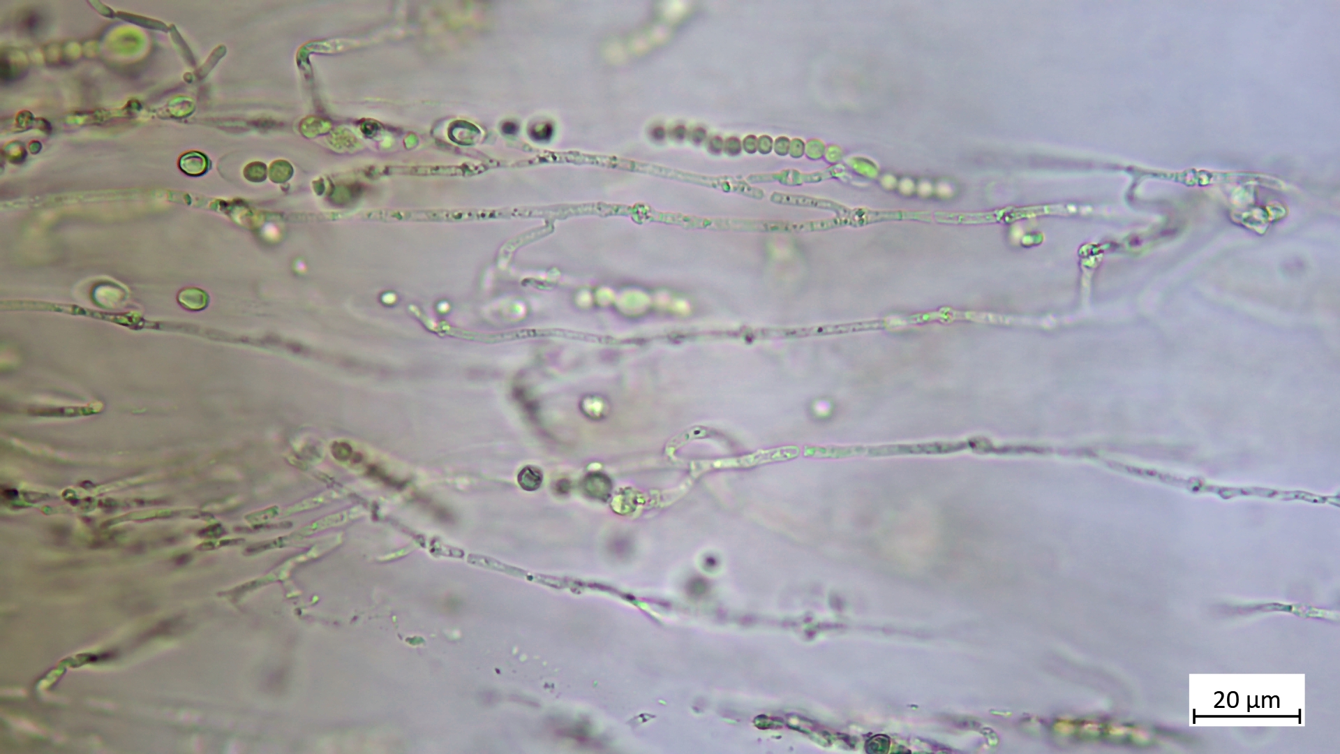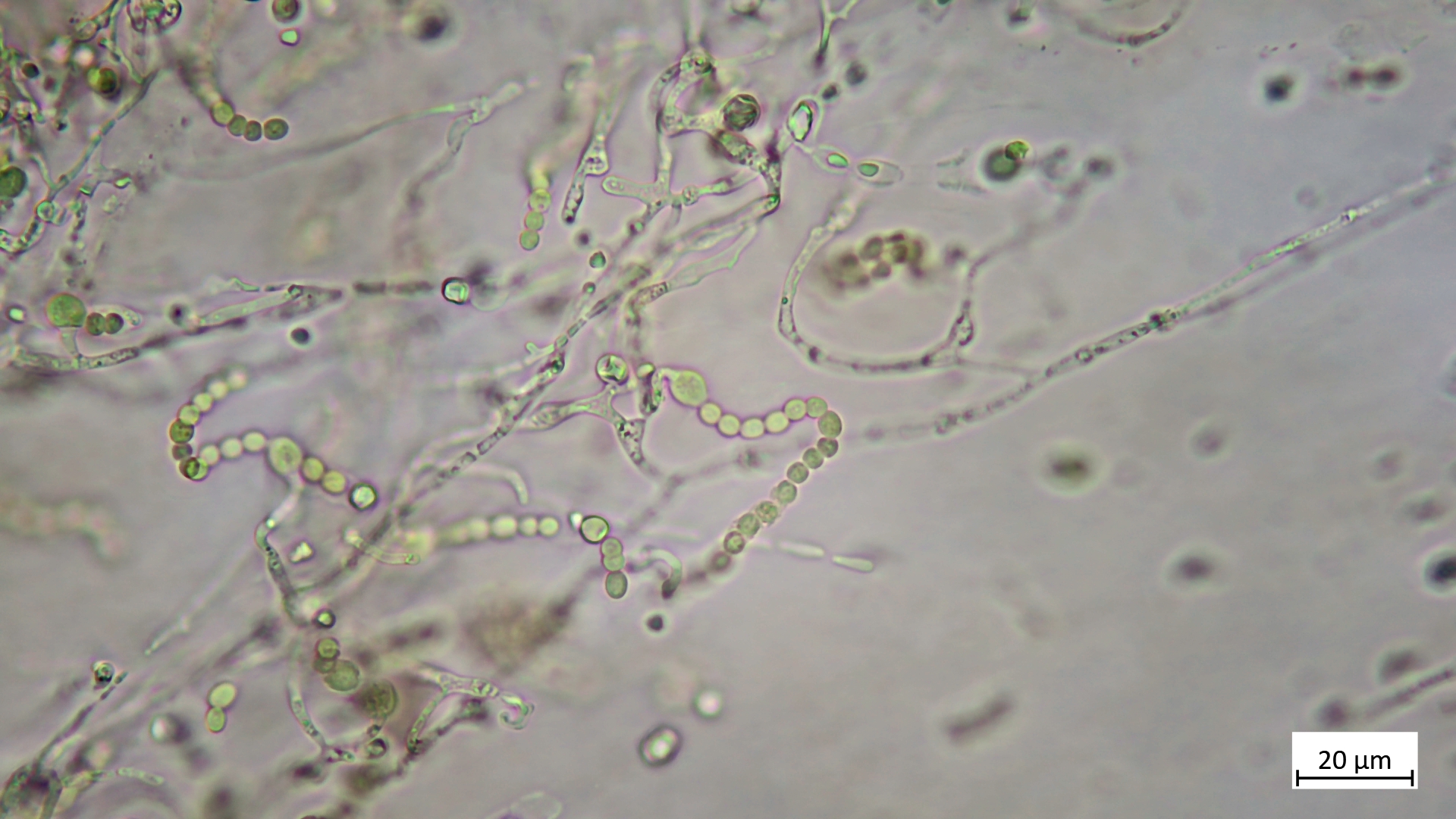 jedenfalls mit teils verzweigten Hyphen und unzähligen perlschnurartigen Elementen (Sporen????):