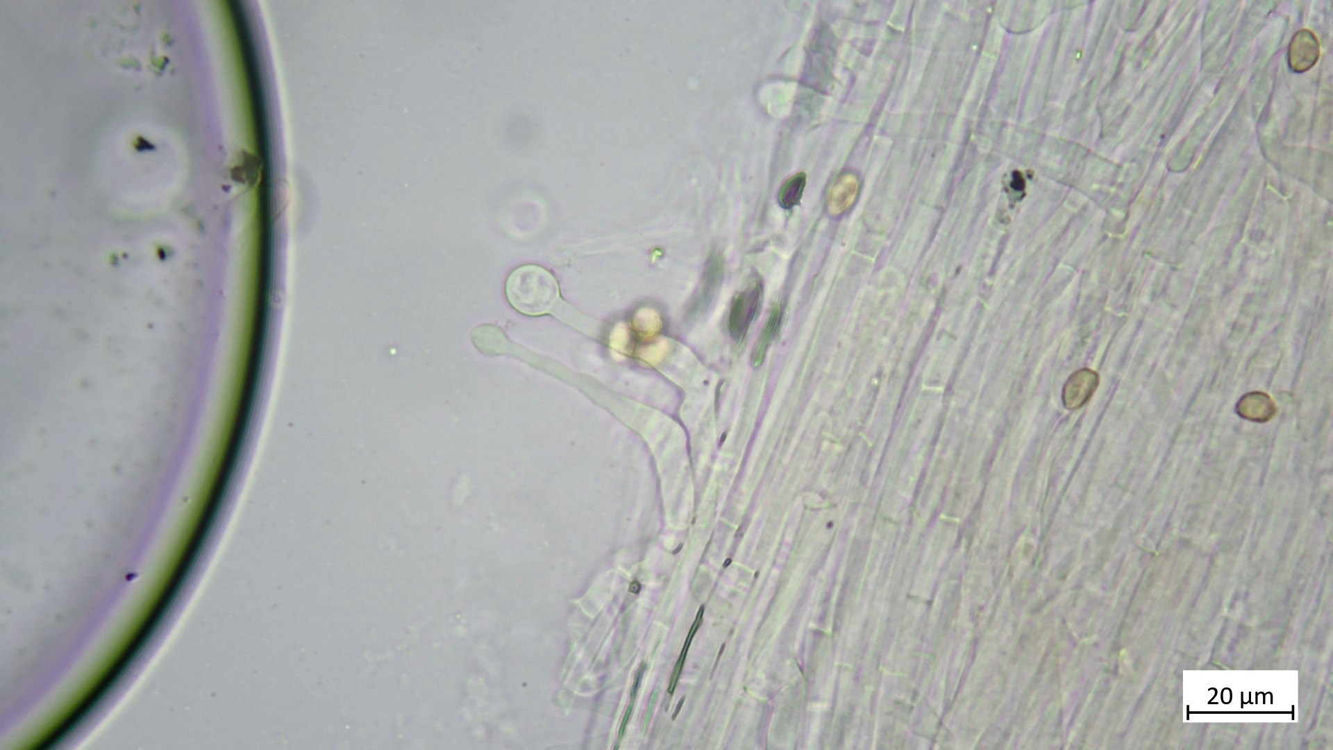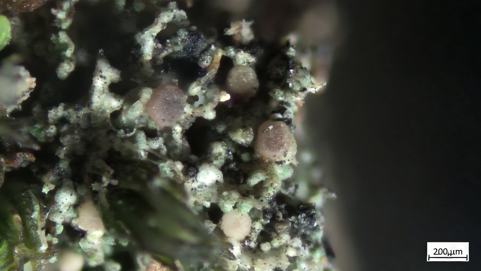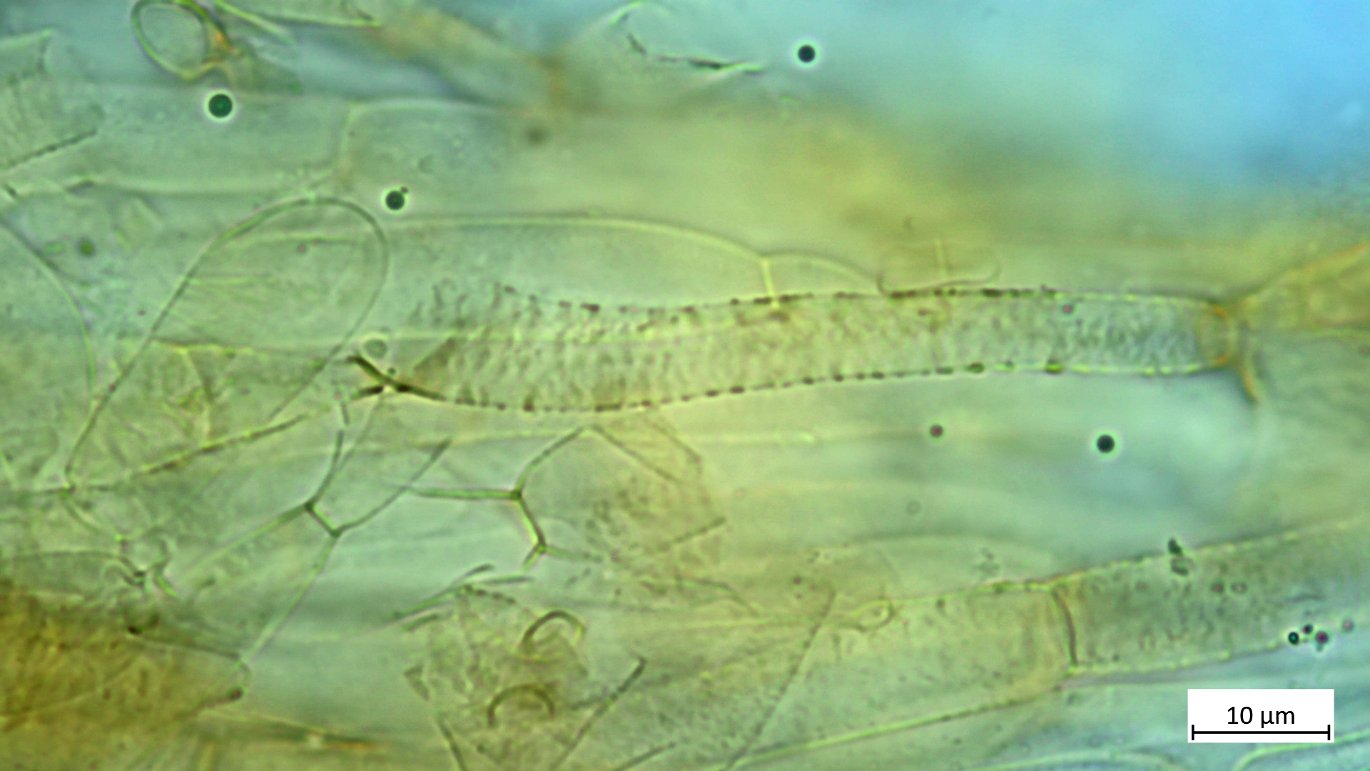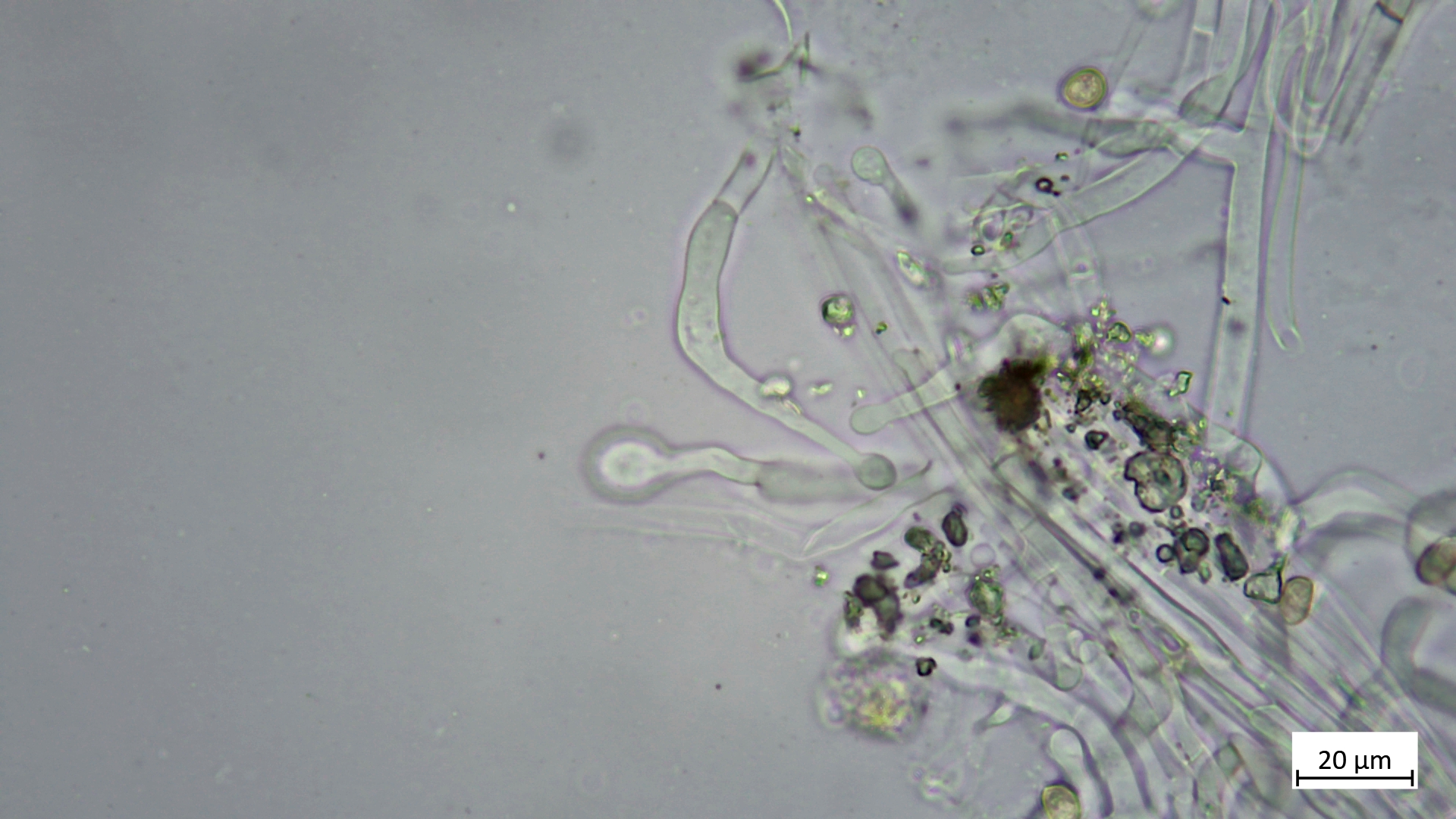 jedenfalls mit teils verzweigten Hyphen und unzähligen perlschnurartigen Elementen (Sporen????):
