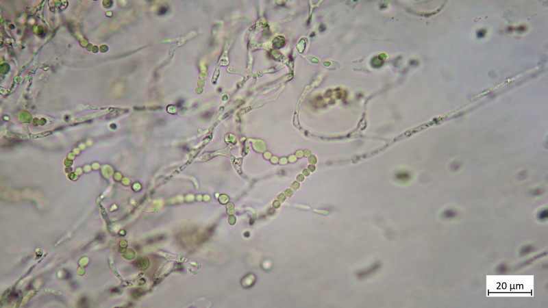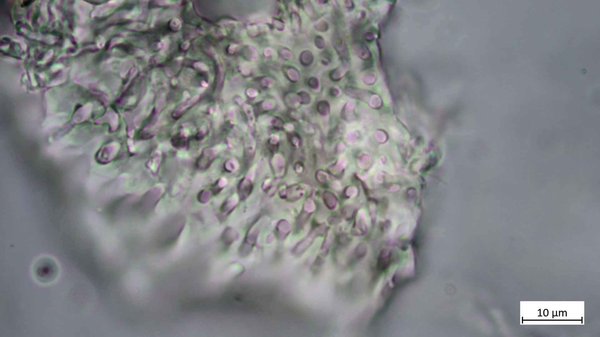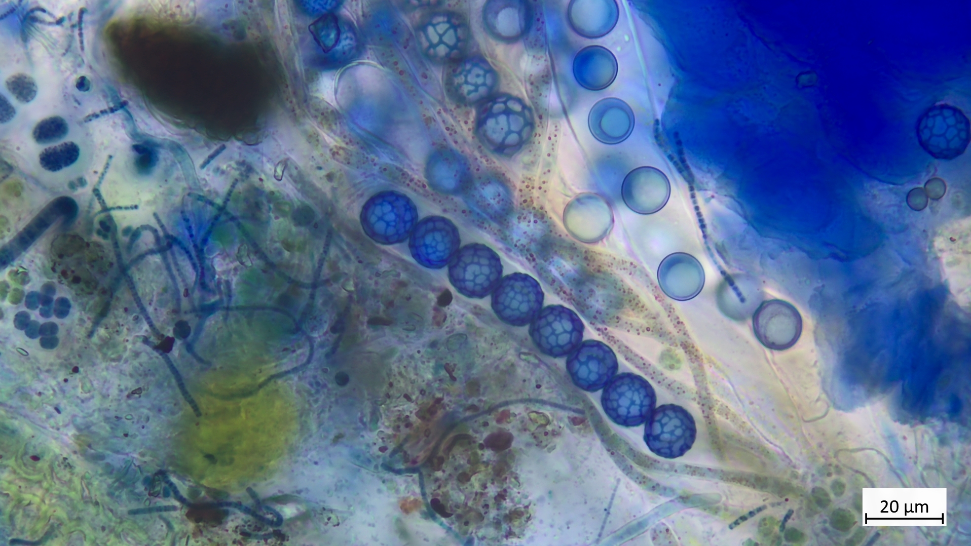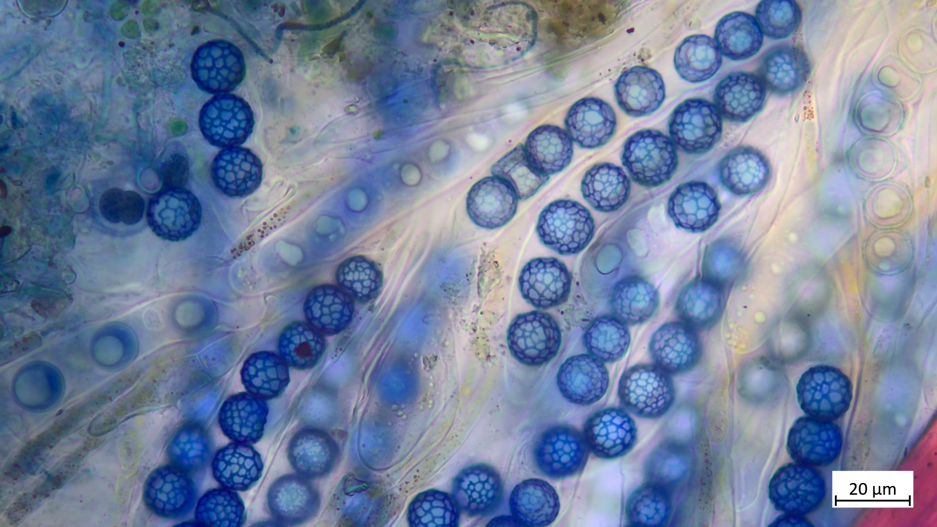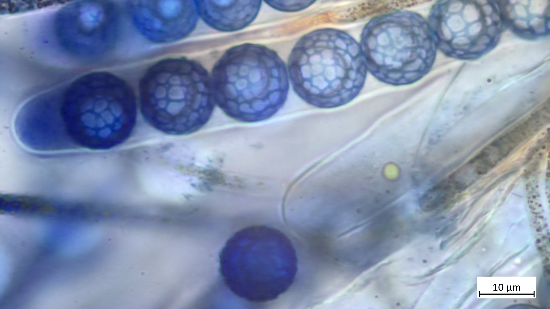 Sporen netzartig (mitunter interessanterweise mit nicht geschlossenem Netz). In Baumwollblau (erhitzt!). Sporen um die 15µm.