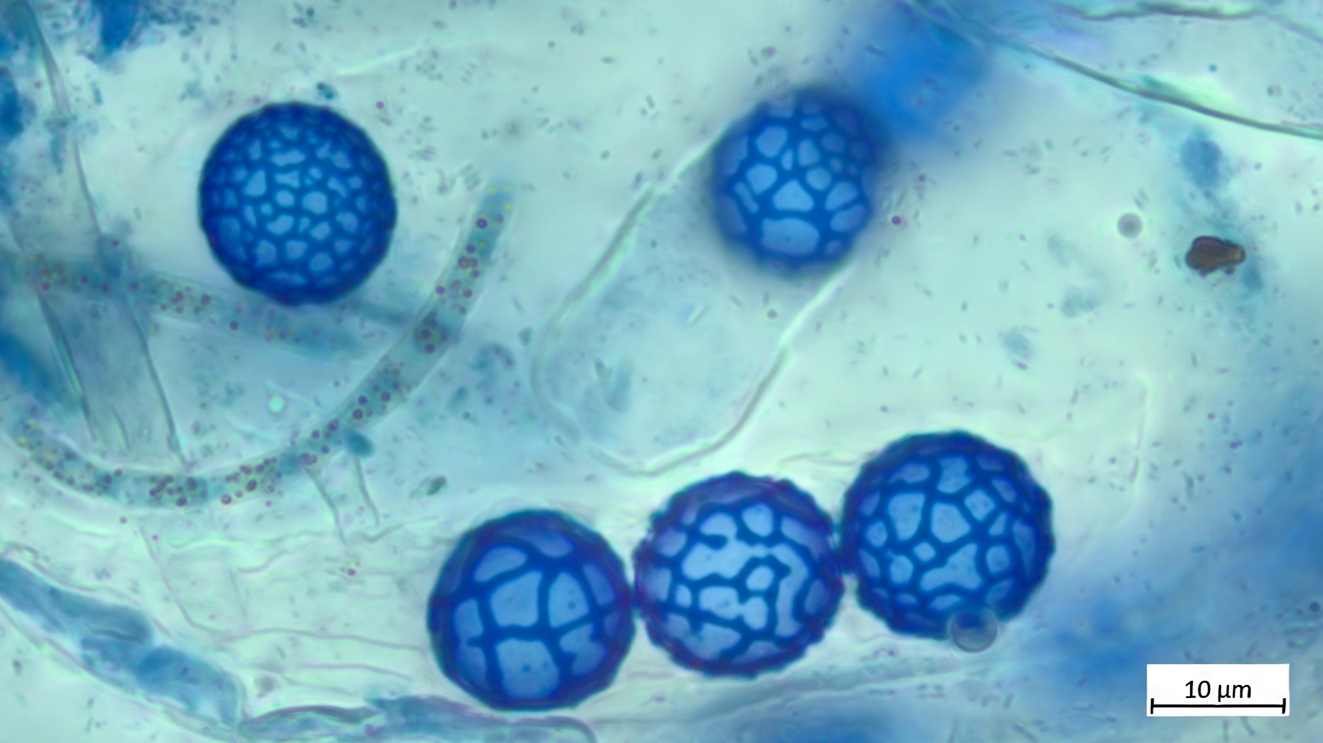 Nun ja, Sporen auch hier um die 15µm und genetzt (Baumwollblau, erhitzt):