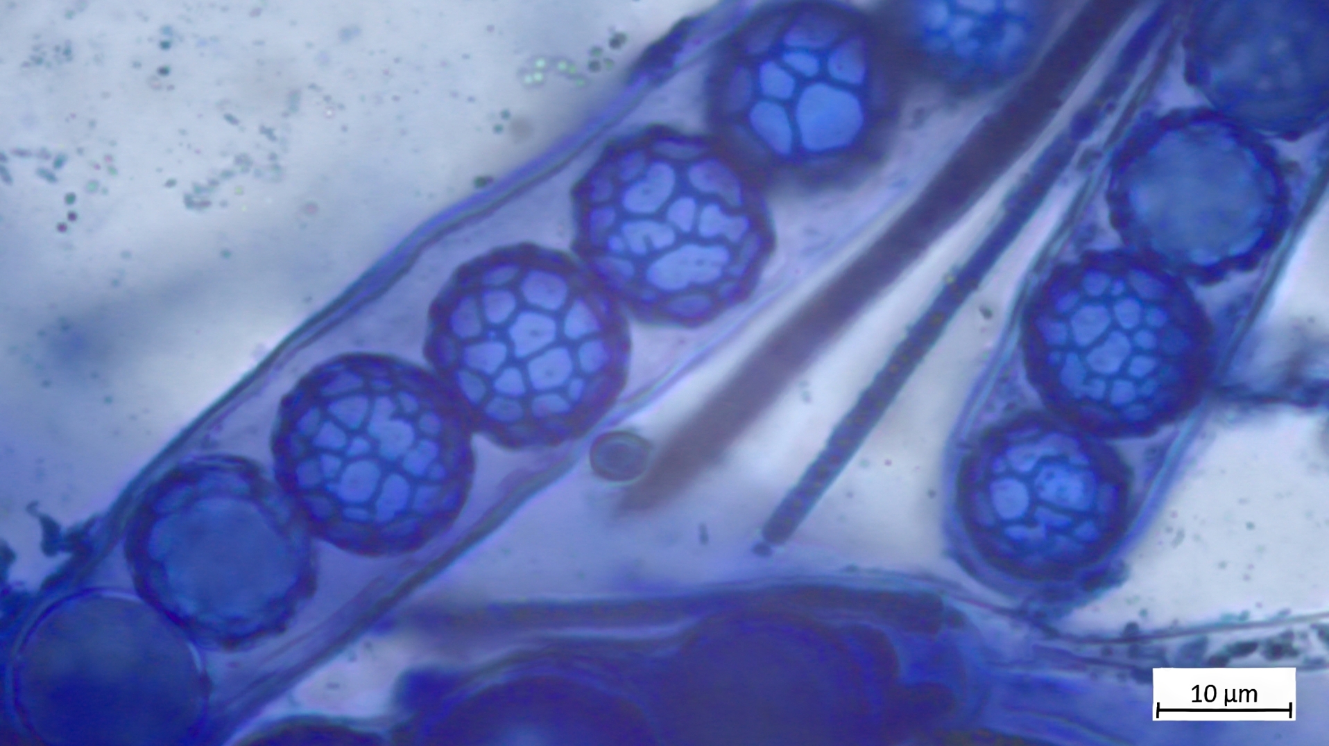 schwer zu präparieren, hier eine Ahnung von den dichtgepackten septierten Sporen im Asco: