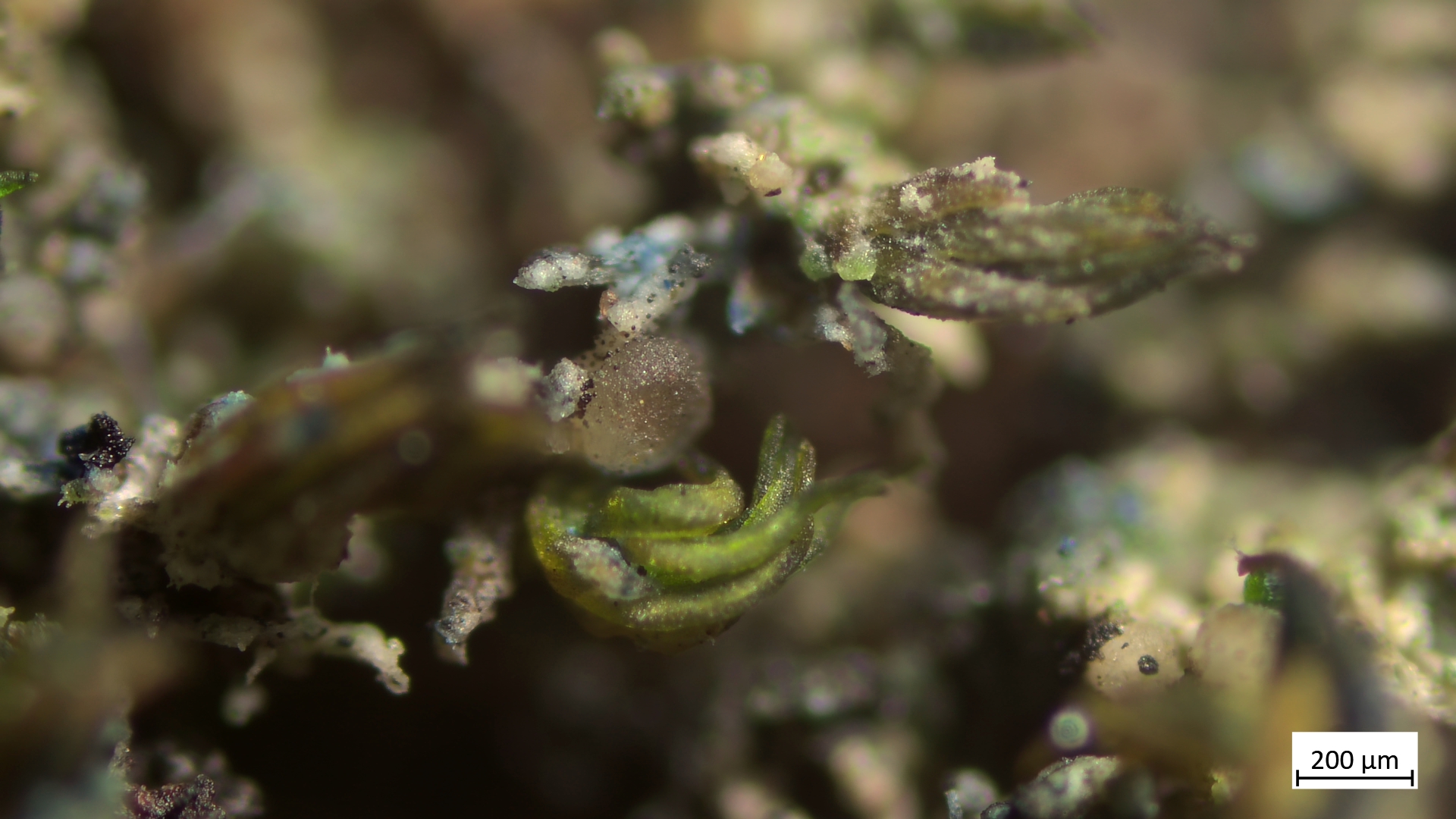 von den Sporen eigentlich ähnlich, aber dort verschiedene Moosarten, teils kaum zu bestimmen, weil stark angegriffen (durch den Parasiten).