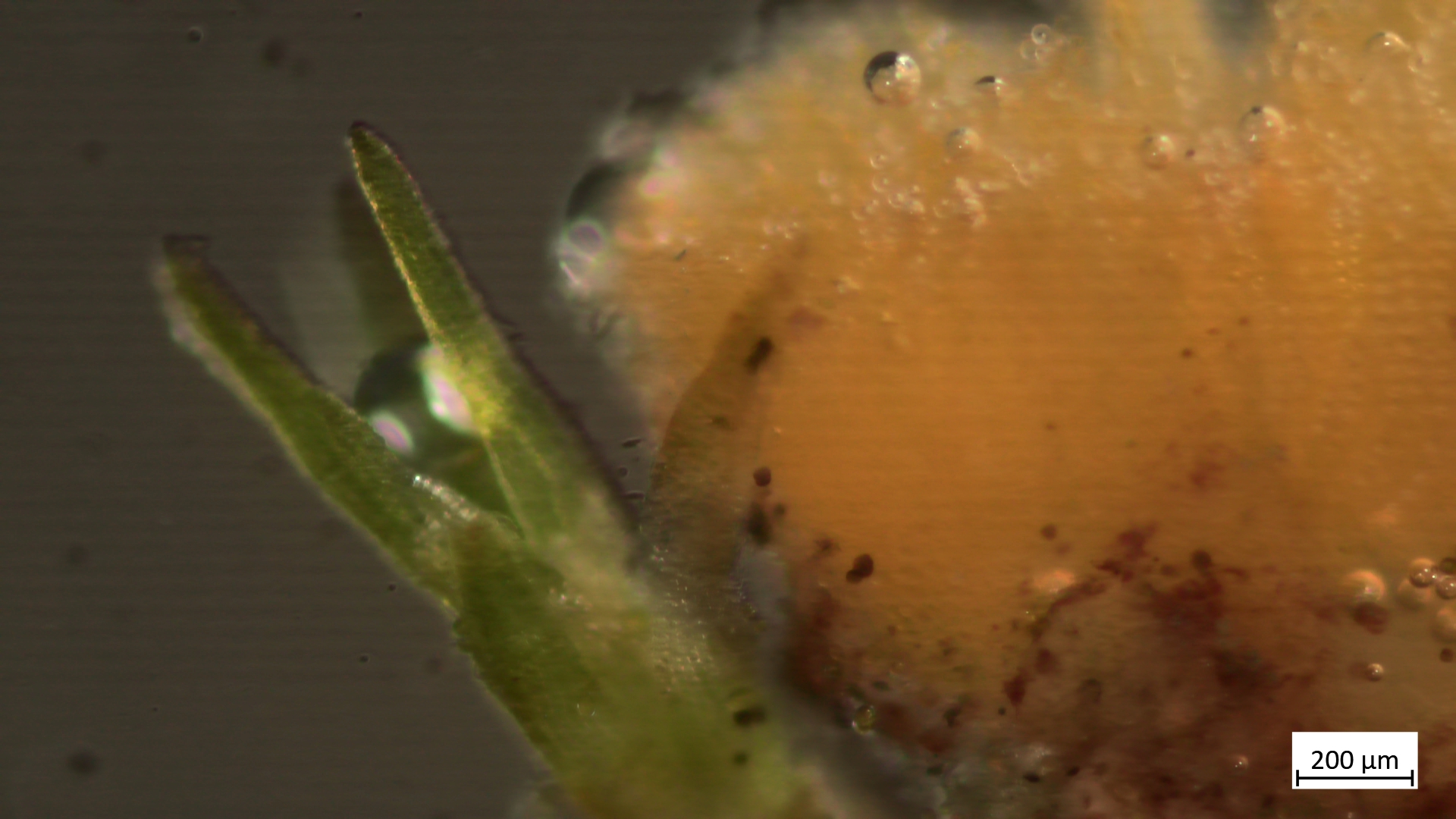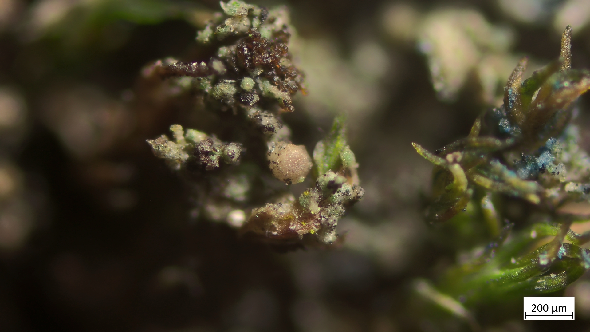 von den Sporen eigentlich ähnlich, aber dort verschiedene Moosarten, teils kaum zu bestimmen, weil stark angegriffen (durch den Parasiten).