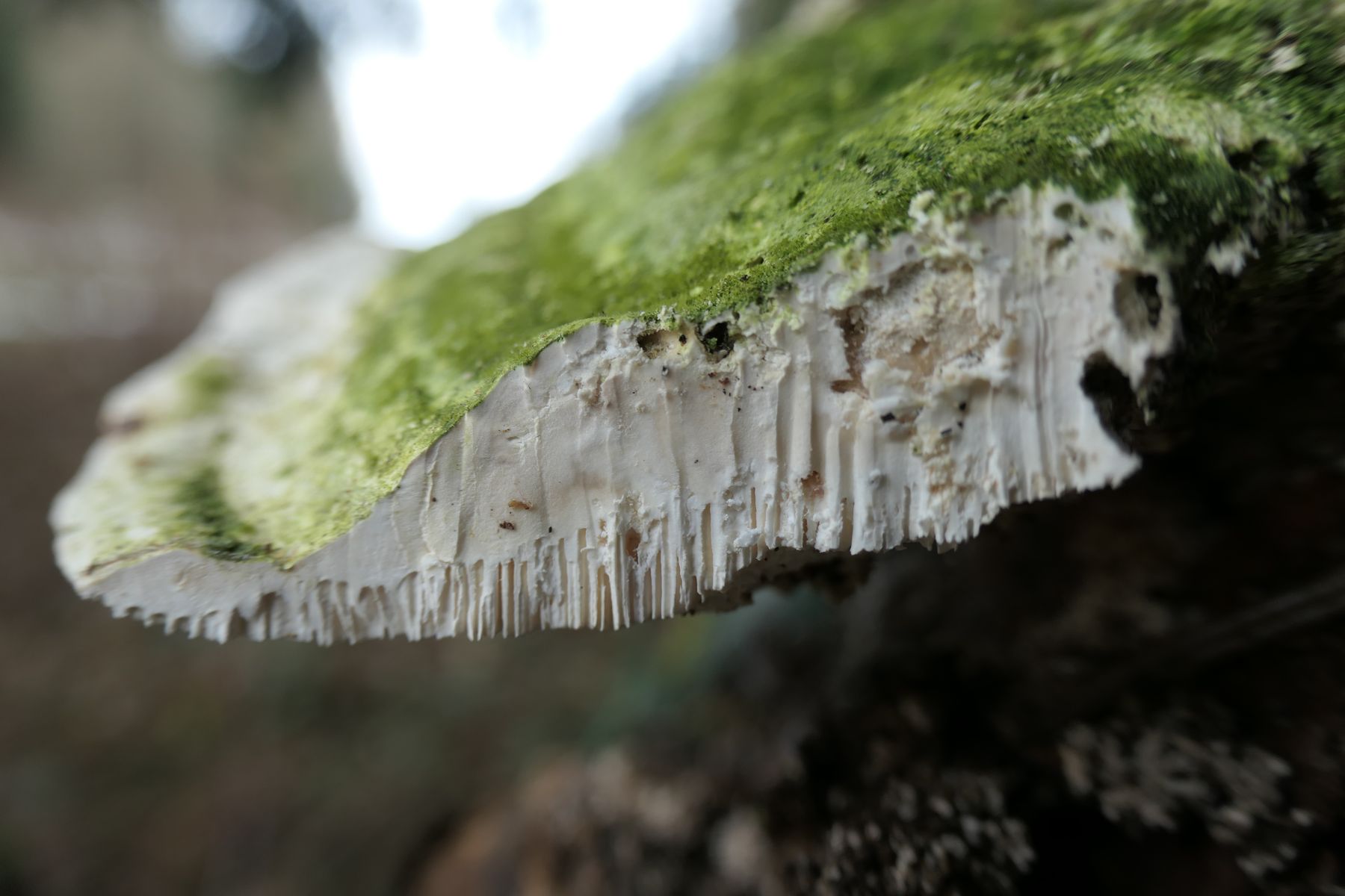 Vergleiche doch mal mit Buckeltramete (Trametes Gibbosa). Das könnte zu den leicht labyrinthischen Poren passen, die sind recht hell und neigen dazu zu veralgen.