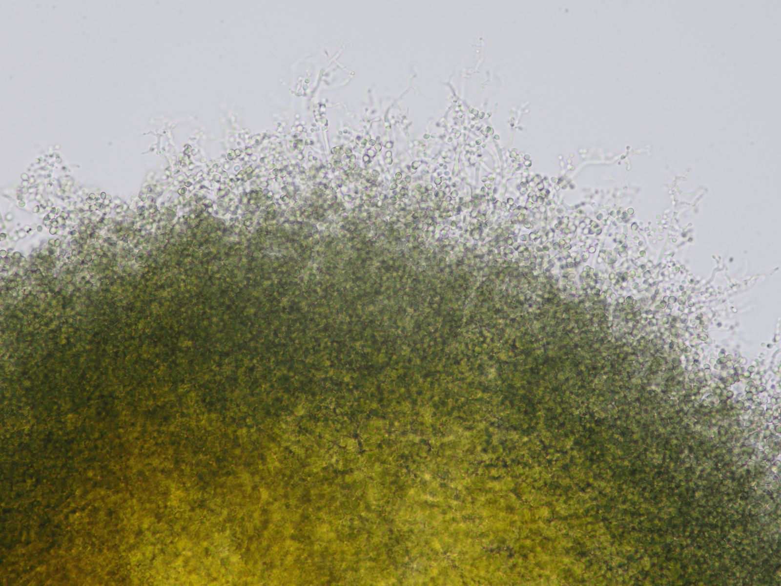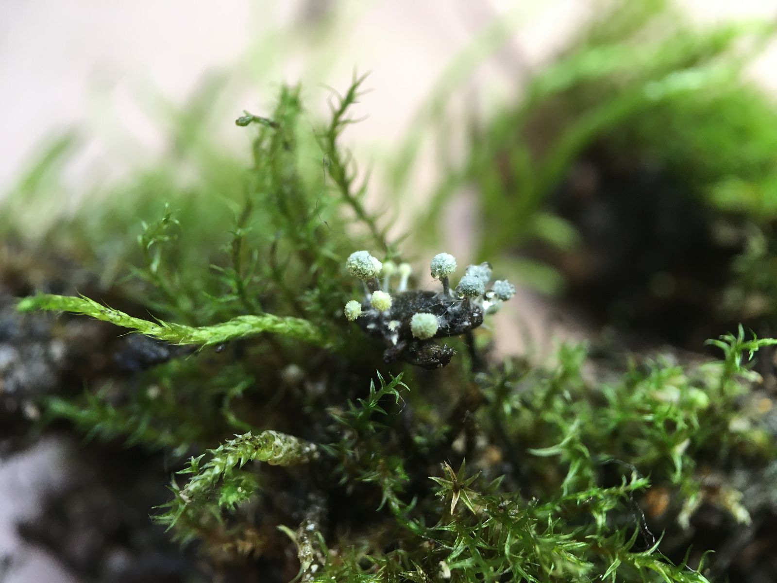 bei näherer Betrachtung eines Mooskissens auf der Keulchensuche fand ich kleine Köttel, vermutlich Mausdung, die von kleinen gelben gestielten Köpfchen besiedelt waren. Da ich ein Faible für kleine Köpfchenpilze habe (mit meinem Avatar kann ichs nicht verstecken) habe ich sie mitgenommen auch wenn ich nicht viel Hoffnung auf Bestimmung hatte. Das hat sich erfreulicherweise nicht bestätigt, es sollte die hier von Thorben vorgestellte Onychophora coprophila W. Gams sein.