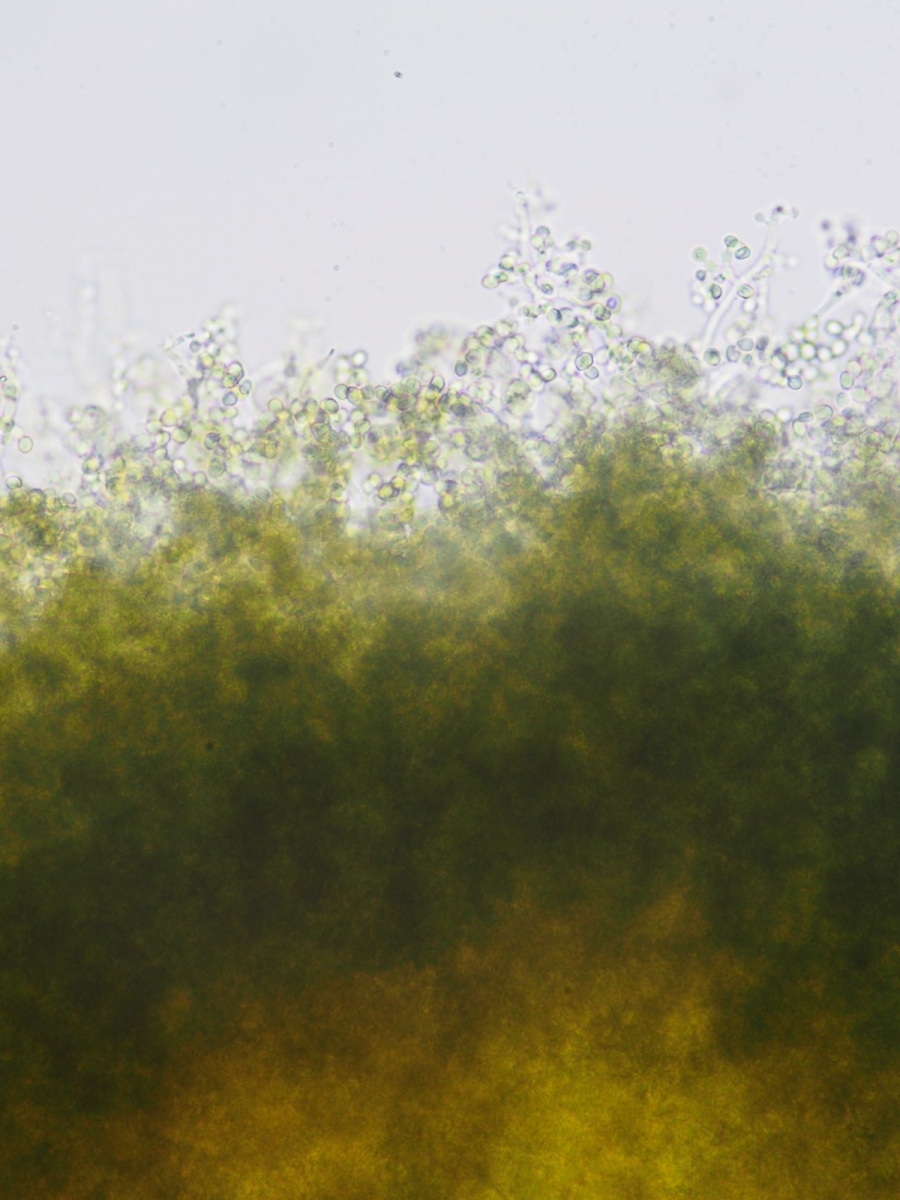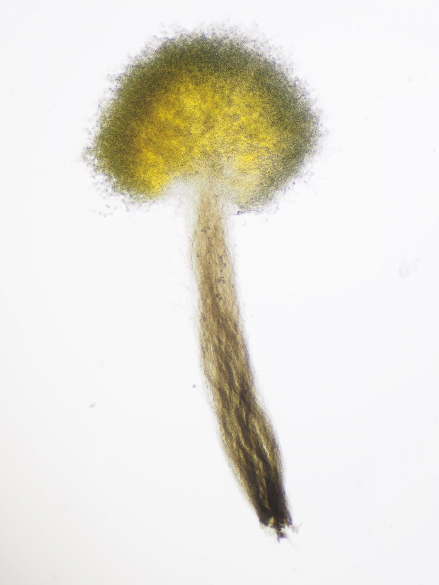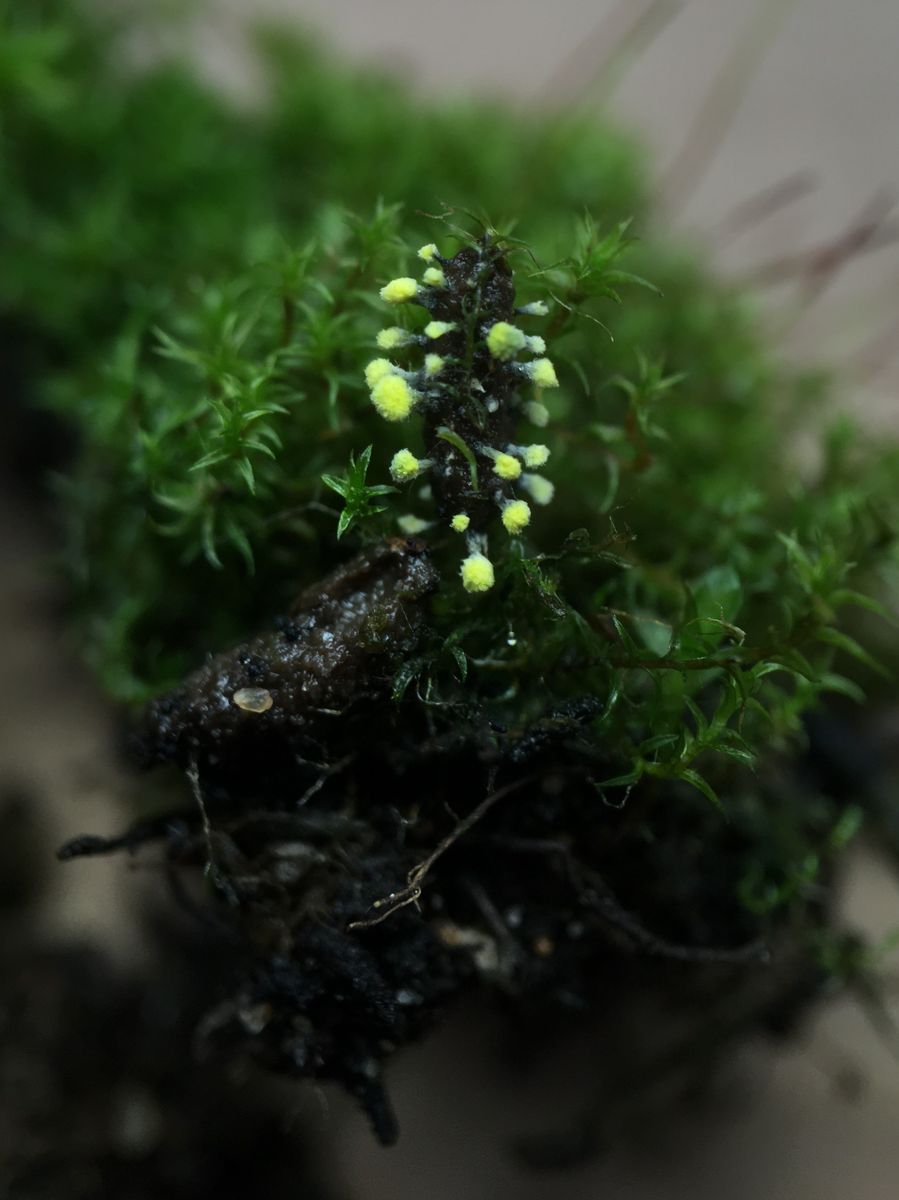 bei näherer Betrachtung eines Mooskissens auf der Keulchensuche fand ich kleine Köttel, vermutlich Mausdung, die von kleinen gelben gestielten Köpfchen besiedelt waren. Da ich ein Faible für kleine Köpfchenpilze habe (mit meinem Avatar kann ichs nicht verstecken) habe ich sie mitgenommen auch wenn ich nicht viel Hoffnung auf Bestimmung hatte. Das hat sich erfreulicherweise nicht bestätigt, es sollte die hier von Thorben vorgestellte Onychophora coprophila W. Gams sein.
