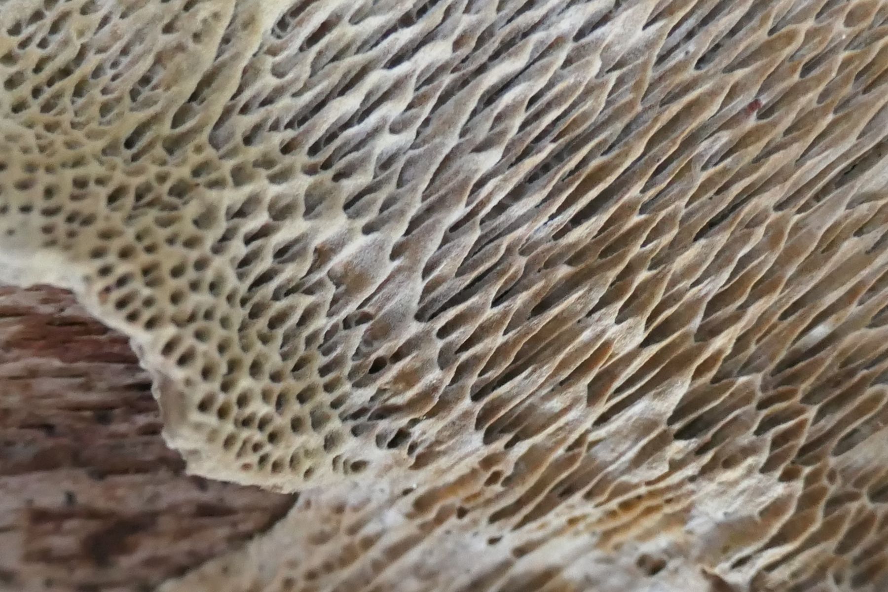 Hier würde ich erwarten, daß der Fruchtkörper innen tabakbraun ist (und mit KOH schwarzbraun bis schwarz wird). An den Röhrenwänden schimmert die dunkelbraune Farbe der Röhrentrama schon durch.