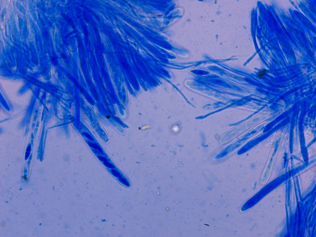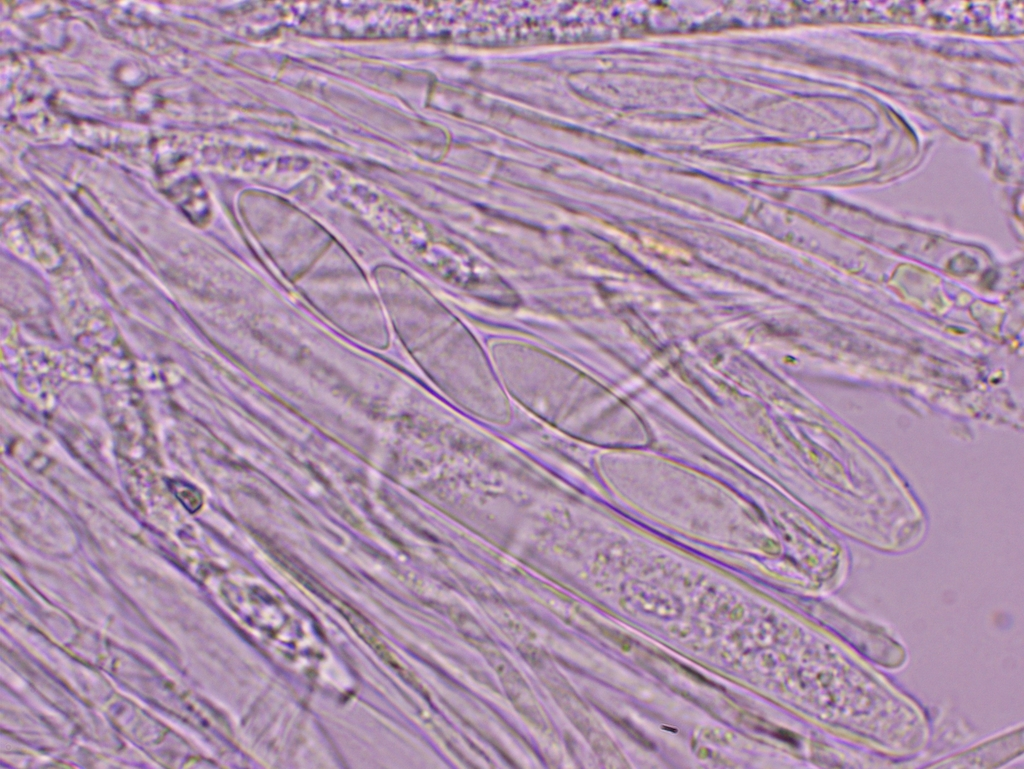 FK lang gestielte (bis zu 1 cm), weiße, im Alter vor allem von der Stielbasis aus, aber auch überall gesprenkelt gilbend bis schwärzende, tellerförmige, am Rand oft leicht heruntergebogene, rasig wachsende, bis zu ca. 2 mm breite Becherchen. Asci inoperculat, darin meist 8 bis zu 21 µm lange, elliptische, glasige, oft einfach und deutlich septierte Sporen, Paraphysen fadenförmig und mit vielen kleinen Tröpfchen.
