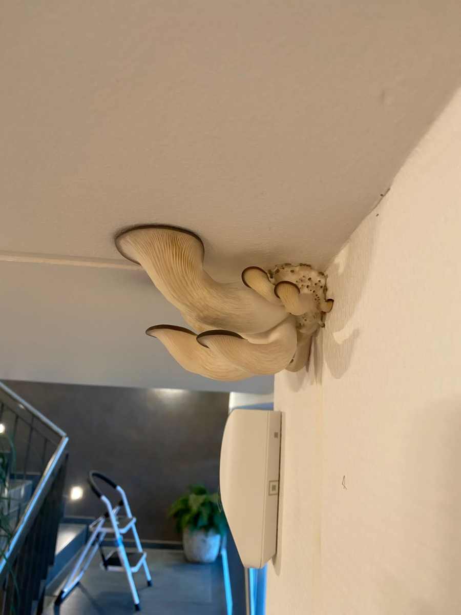 Das ist ja krass. Der Seitling sieht für mich nach Kräuterseitling aus. Das wäre dann kein Pilz, der eine Symbiose mir einer Pflanze eingeht, sondern ein Substratverwerter. Der mag gerne Holz, auf jeden Fall aber organisches Material. Und Pilzwachstum deutet immer auf Feuchtigkeit hin. Ohne Wasser kein Pilz. Es wird also irgendeine Feuchtigkeitsquelle gehen müssen, die beseitigt werden muss.