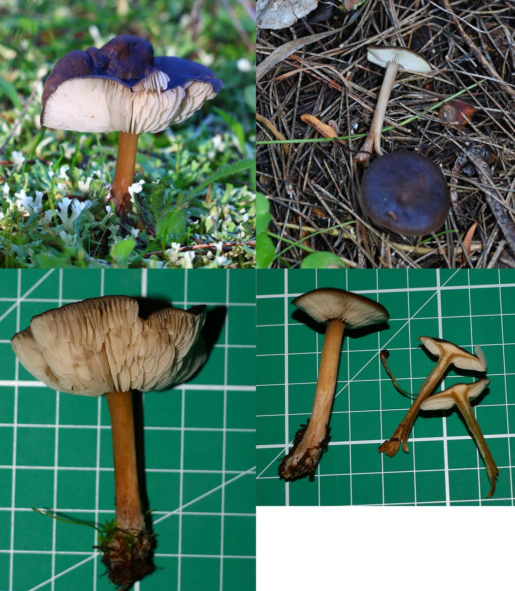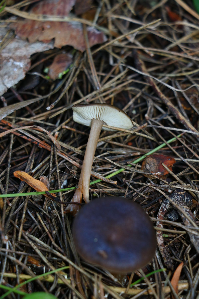 I am investigating two kinds of Melanoleuca sp. found in the same park, basically composed of Aleppo pine on rocky ground with many moss or wild grass lawns. One population consisted of two large specimens (one collected), and the other consisted of 10 or so scattered small fruiting bodies (2 collected). The colors are almost the same, but the former are larger (pileus 5cm across), fleshier, with upturned pileus margin, the other are smaller (pileus 2 cm across), more neat and petite, perfectly round and plane pileus and with more crowded gils.