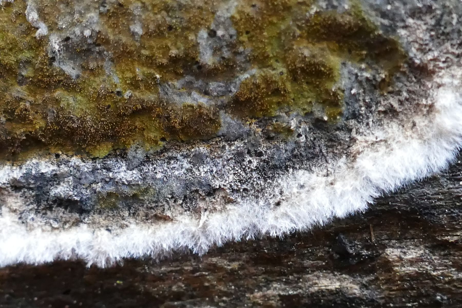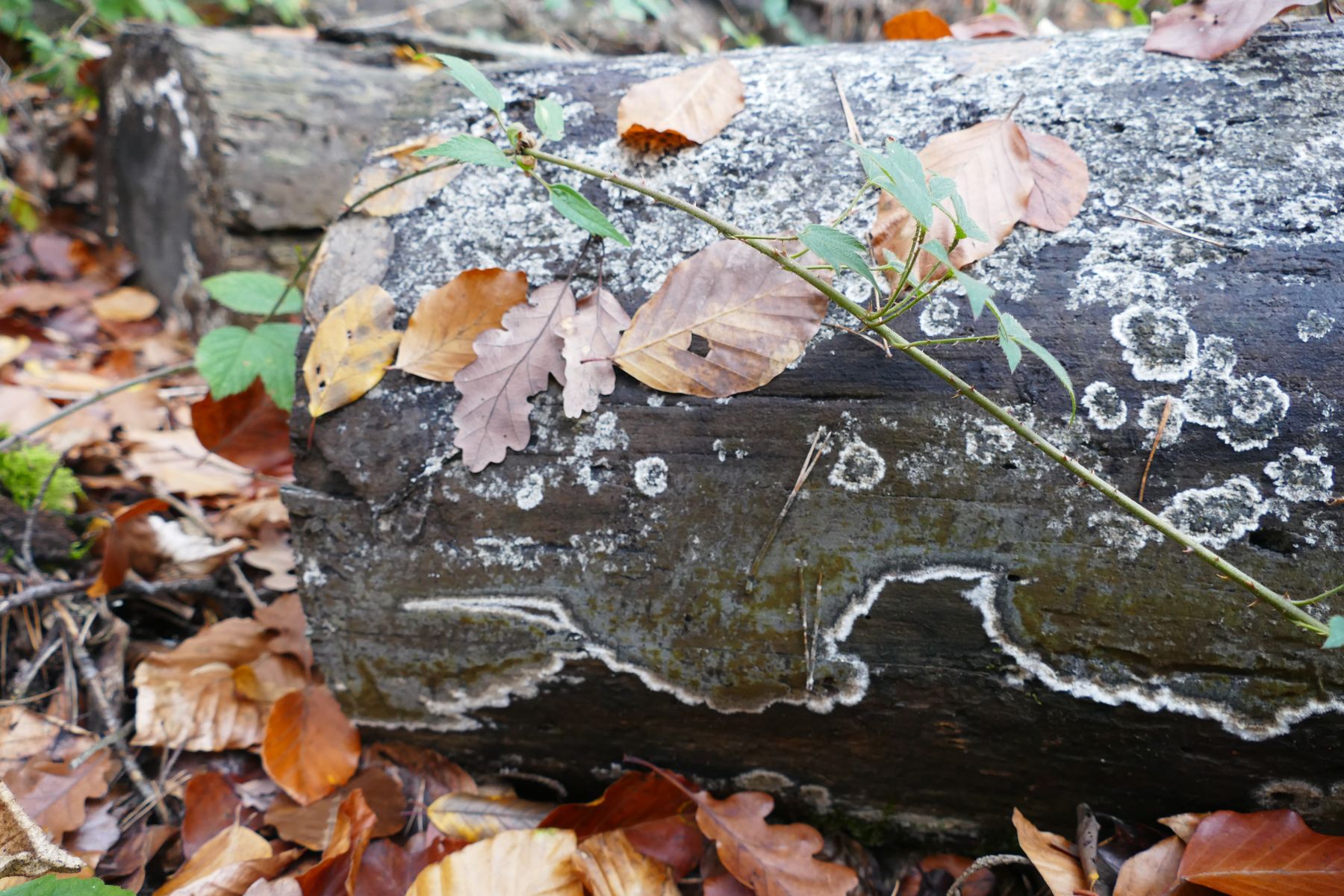 Ende letzten November im Buchen-Eichen-wald fand ich also diesen Pilz an einem liegenden Stamm von Falllaub fast komplett bedeckt.